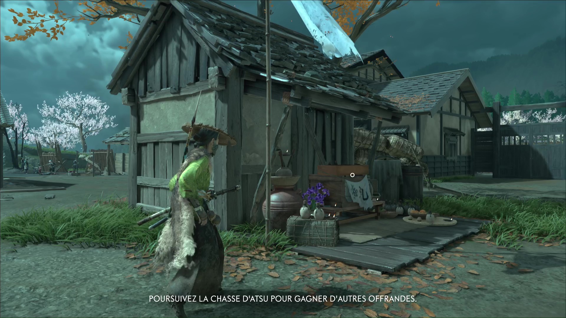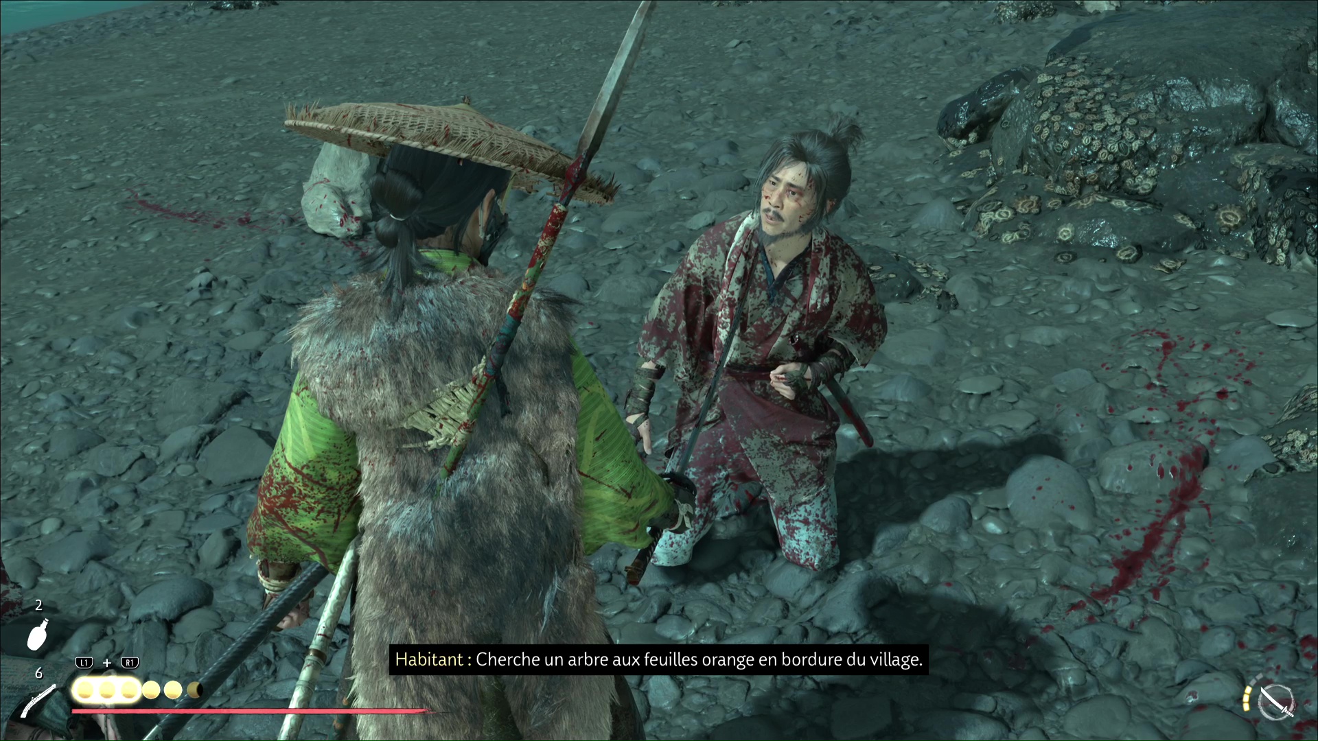 En vous adressant à l’un d’eux, hélas, une attaque se lance. Tuez les ronin en choisissant autant que possible votre meilleure arme. Atsu menacera le dernier survivant pour l’interroger sur Iwa. Elle se cacherait dans un bâtiment avec un toit couvert de feuilles oranges.