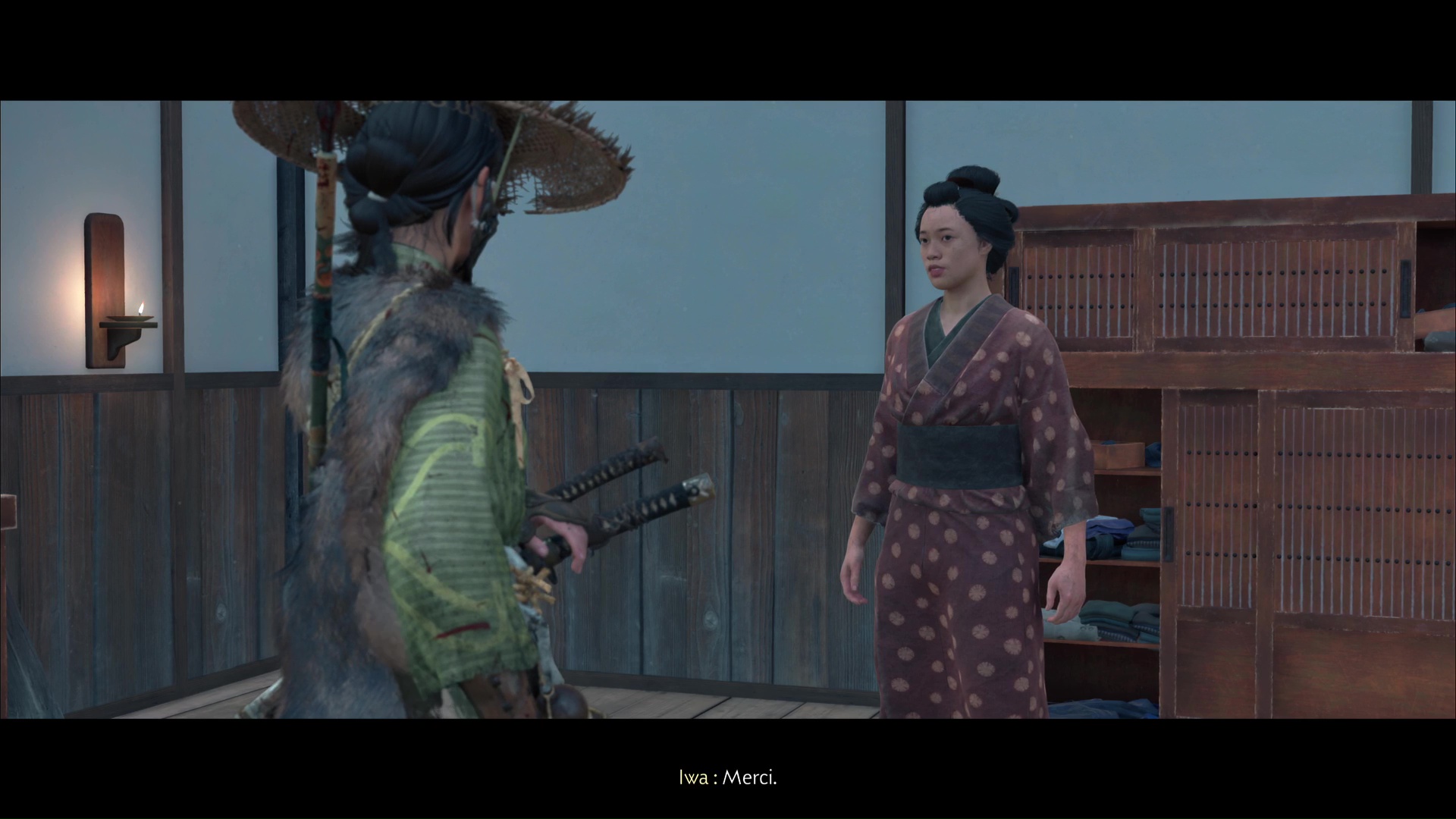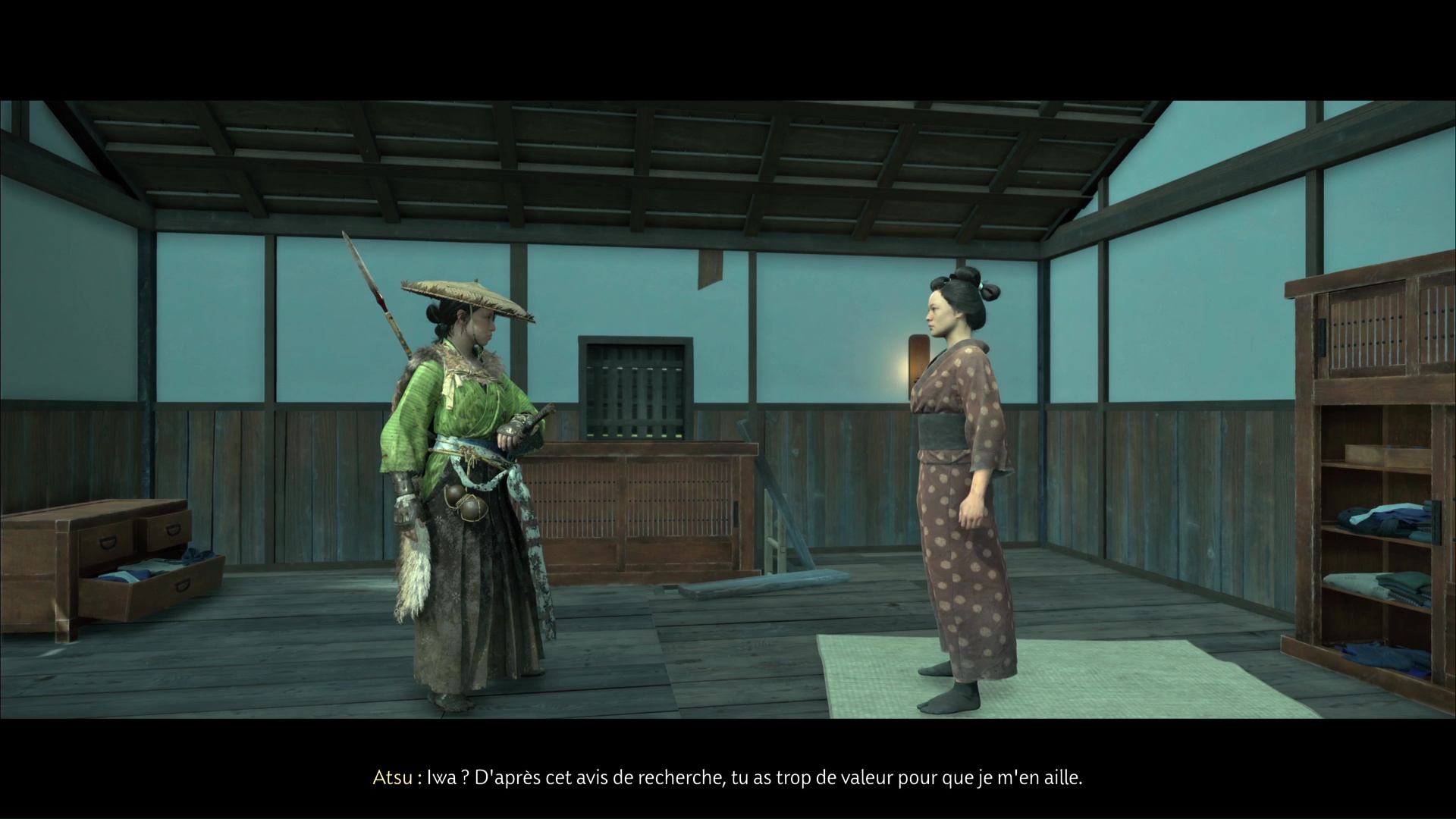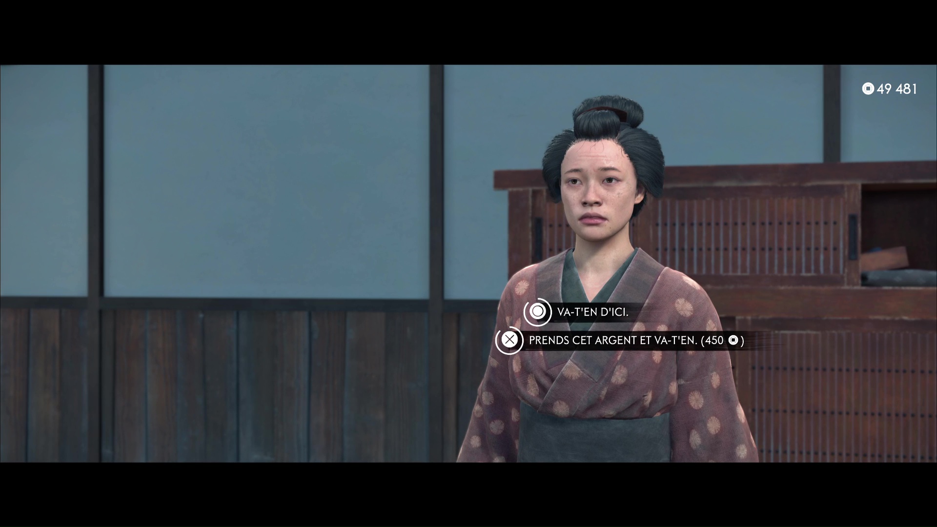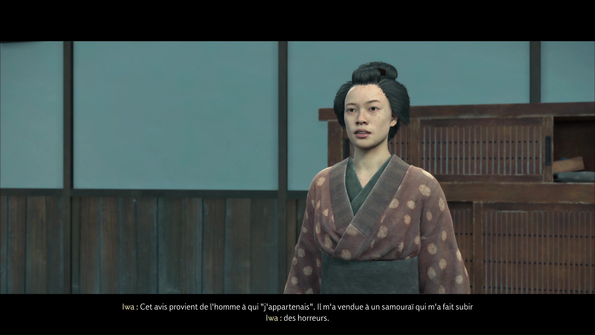 Vous voici auprès d’Iwa, qui vous explique qu’elle n’a pas eu le choix, face aux horreurs qu’elle a vécues. Faites preuve de bonté et donnez-lui 450 pièces pour qu’elle puisse refaire sa vie. Allez ensuite encaisser la prime de 750 pièces auprès de Kojiro.