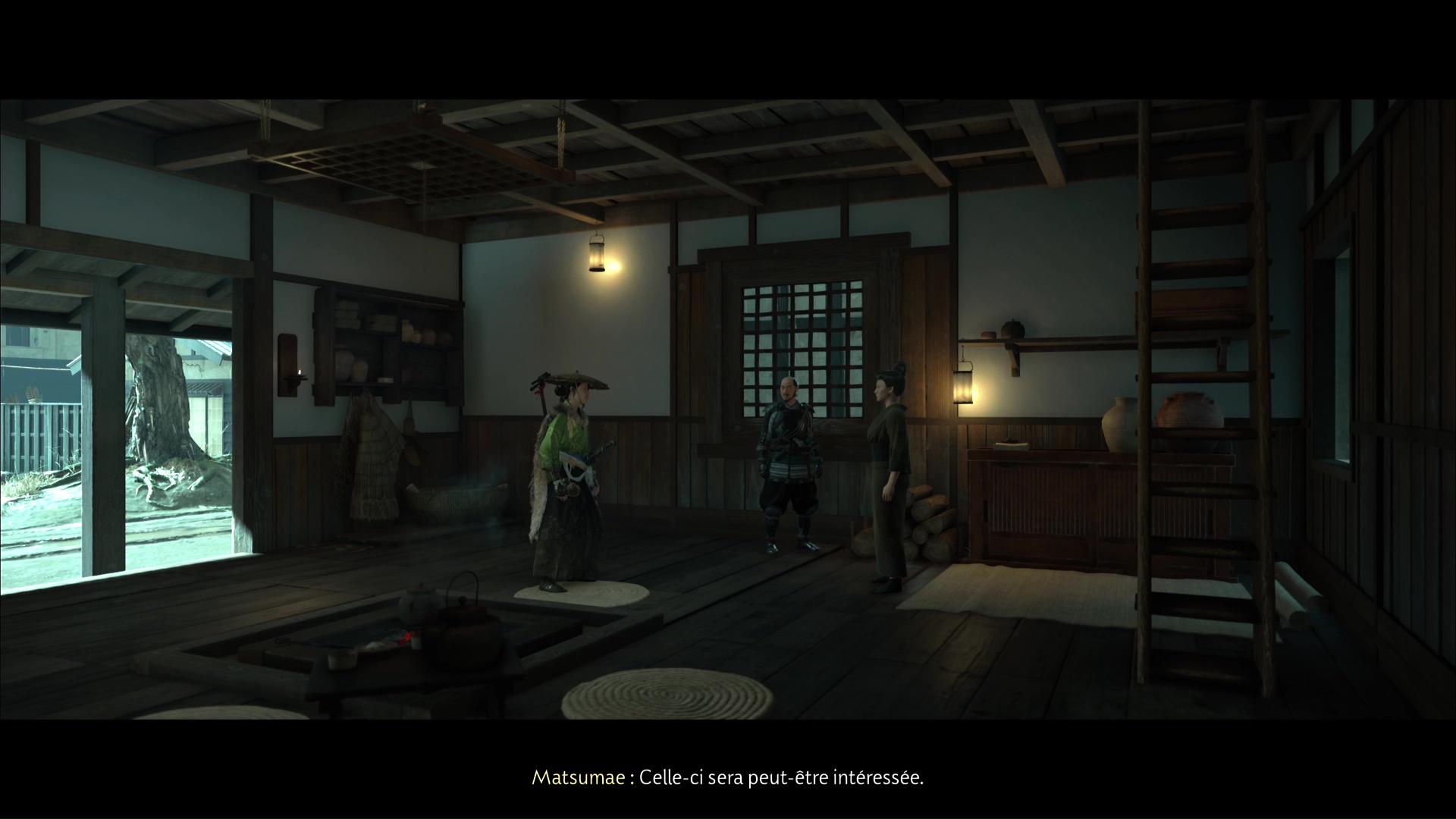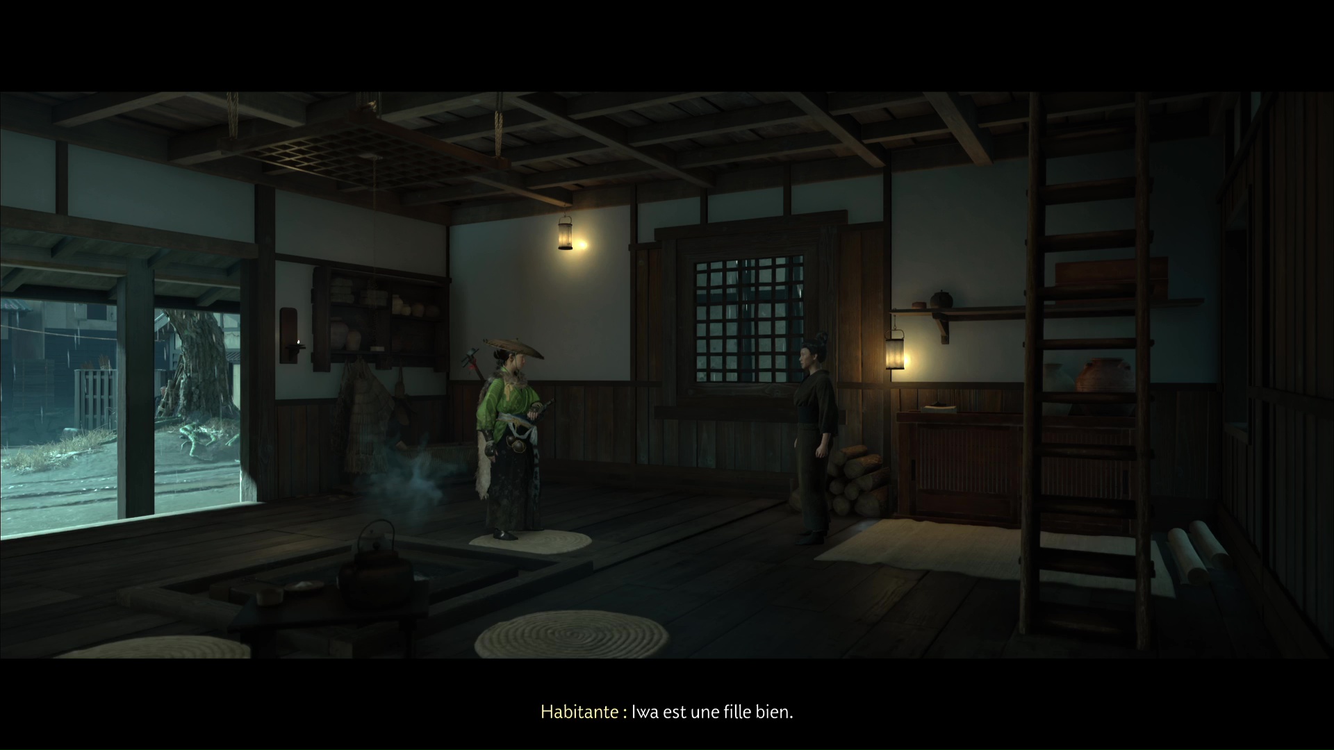 Devant l’arbre au centre de la place, tournez la tête à droite, il s’agit du bâtiment avec deux fenêtres à l’étage donnant sur la place. Entrez pour perturber la conversation entre un Matsumae et une habitante. Atsu demandera ensuite des informations, et votre interlocutrice défendra Iwa en disant qu’elle est une fille bien.