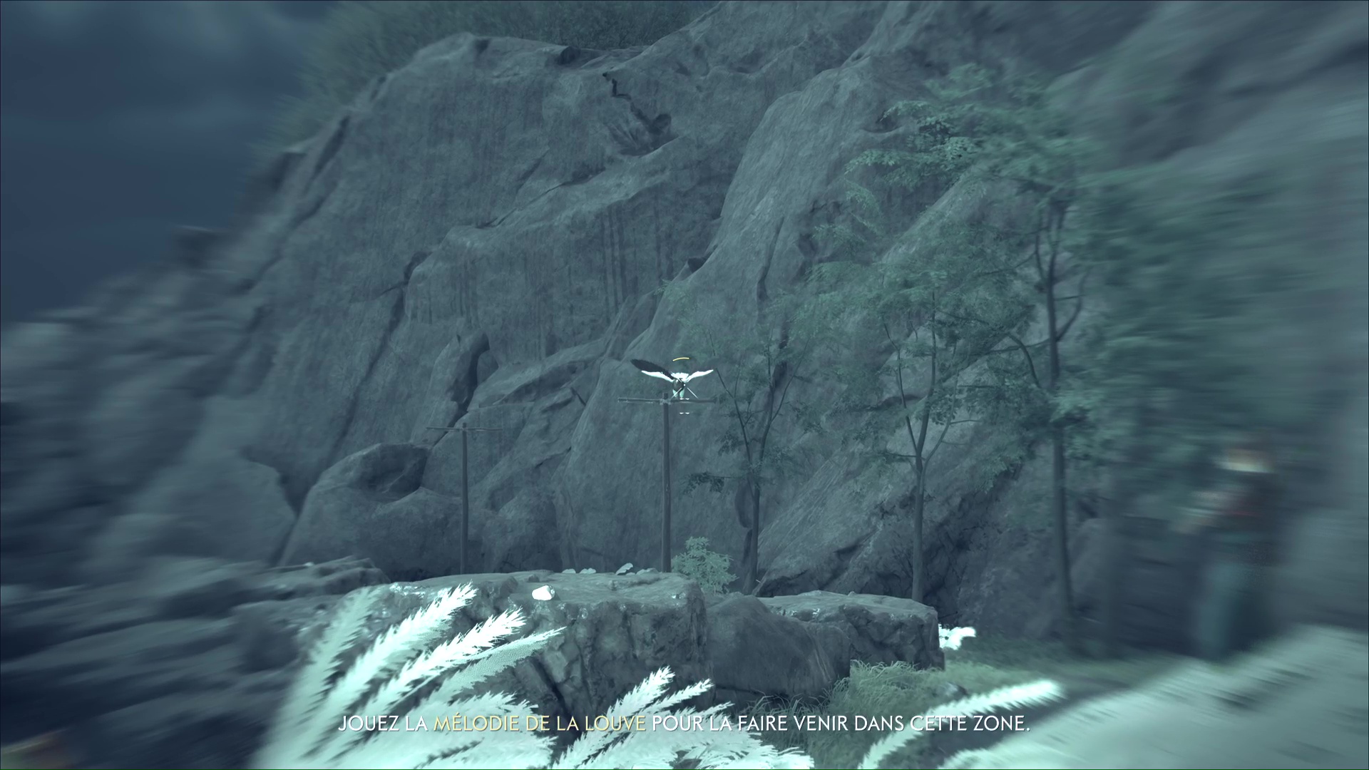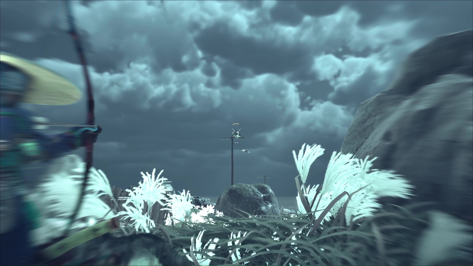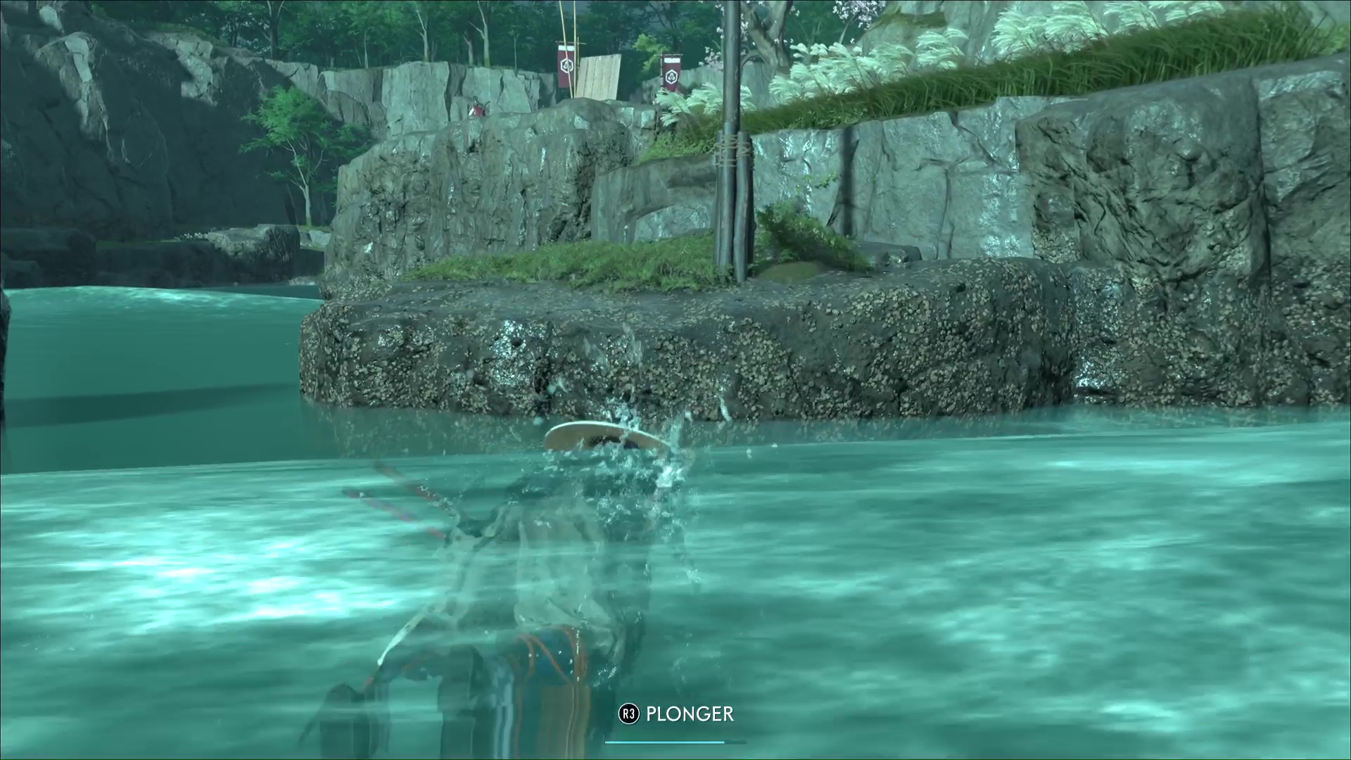 Vous y êtes presque. Tirez sur le dernier oiseau lorsqu’il volera le plus haut possible. Cela alertera Kondo, donc faites attention à ne pas être repéré. Et plutôt que d’aller frontalement vers votre cible, longez par la droite et sautez dans l’eau pour nager.