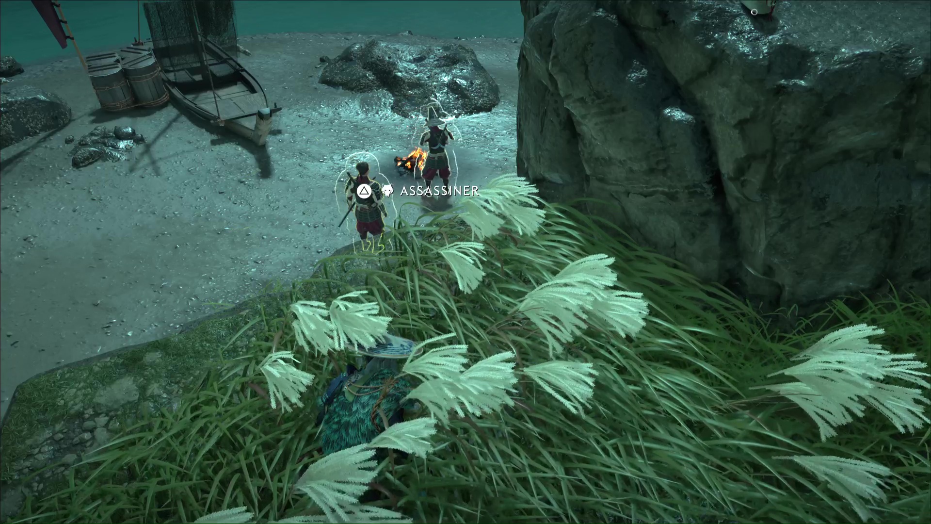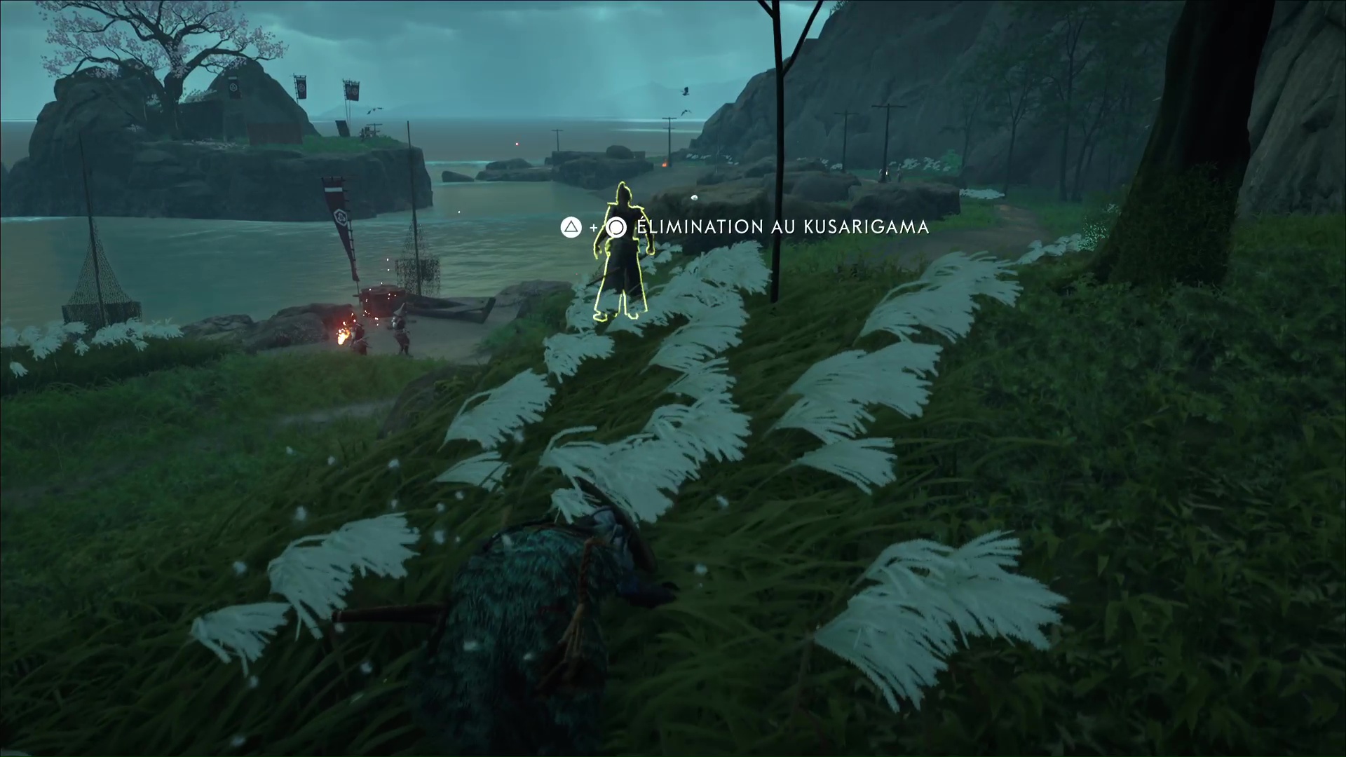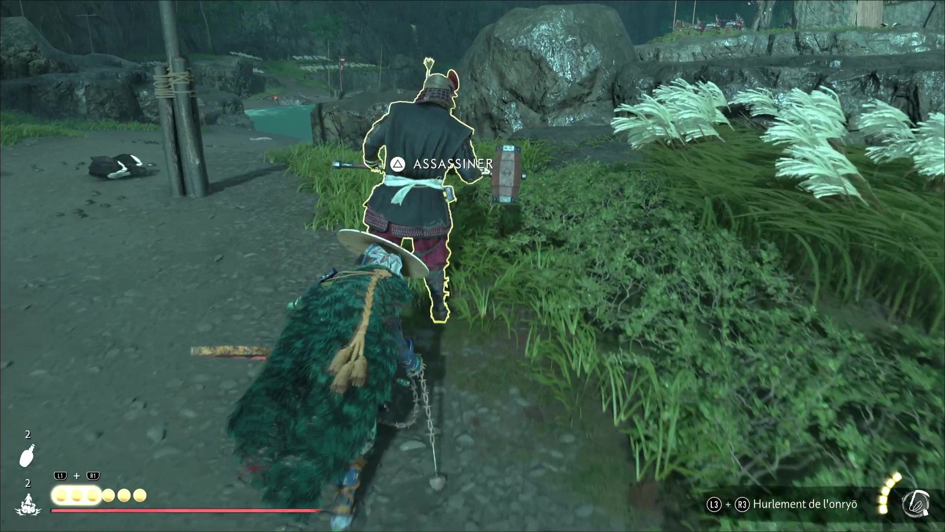 Depuis les hautes herbes, tirez à l’arc sur les deux oiseaux à portée et éloignez-vous si cela a alerté les gardes présents plus loin. Toujours depuis les hautes herbes, assassinez au kusarigama le tireur puis tuez la brute.