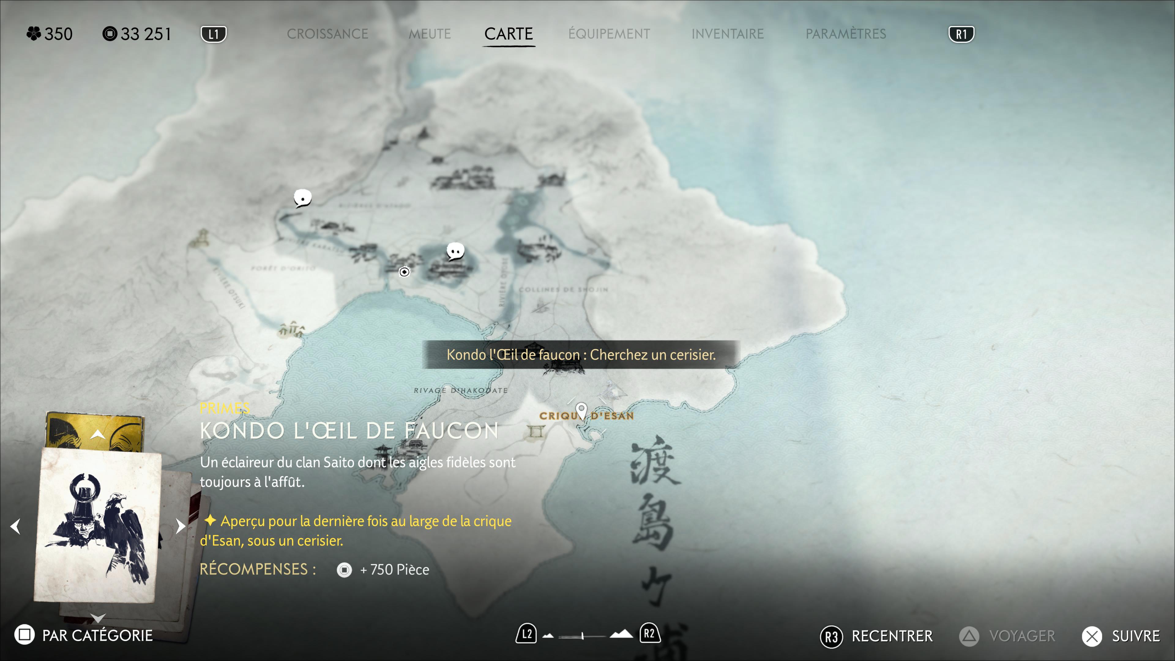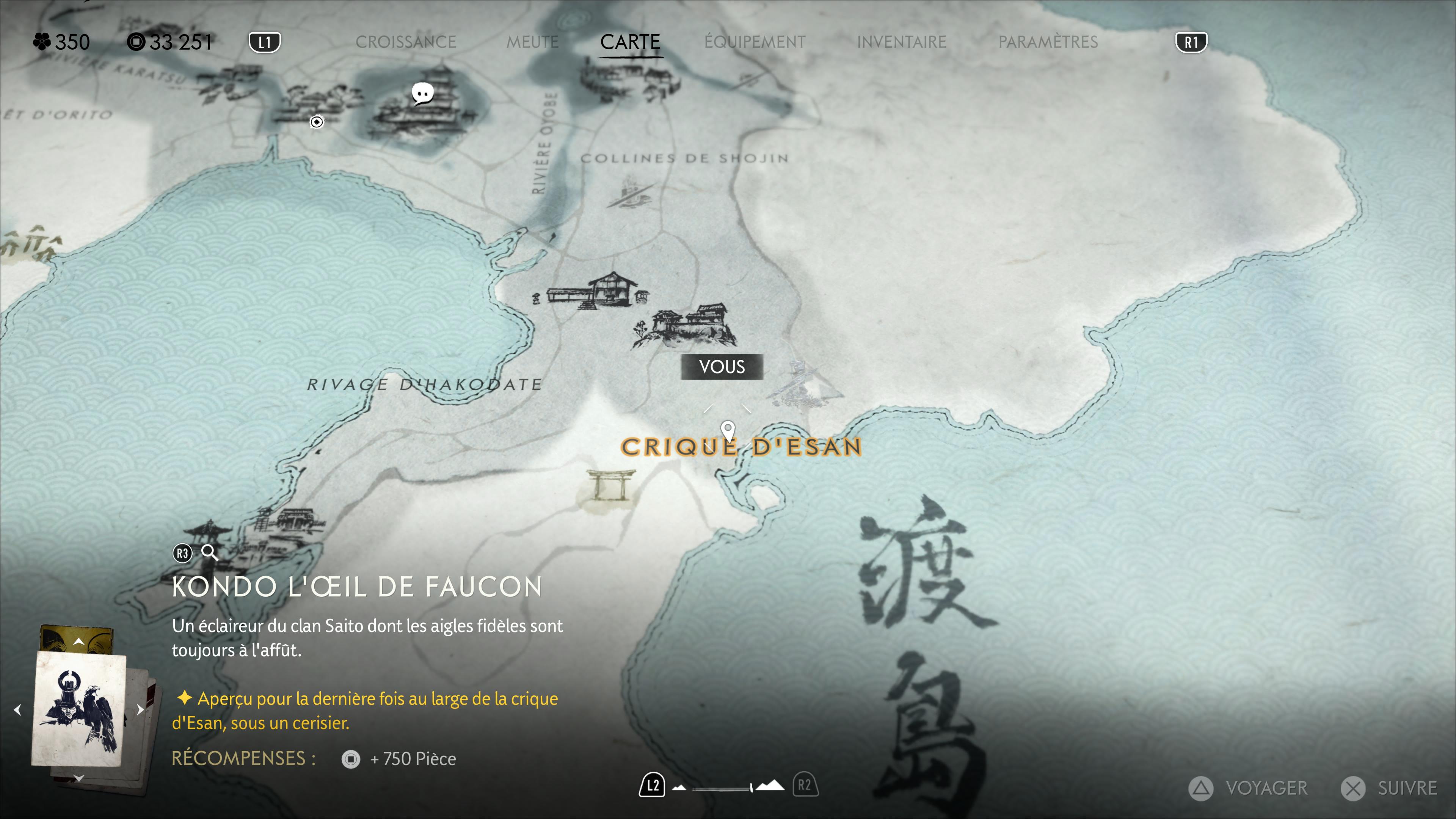 Tout au sud-est de la région se trouve la Crique d’Esan. Kondo l’Œil de faucon vous y attend sous un cerisier. En surplombant la crique, vous pourrez voir le cerisier en question.