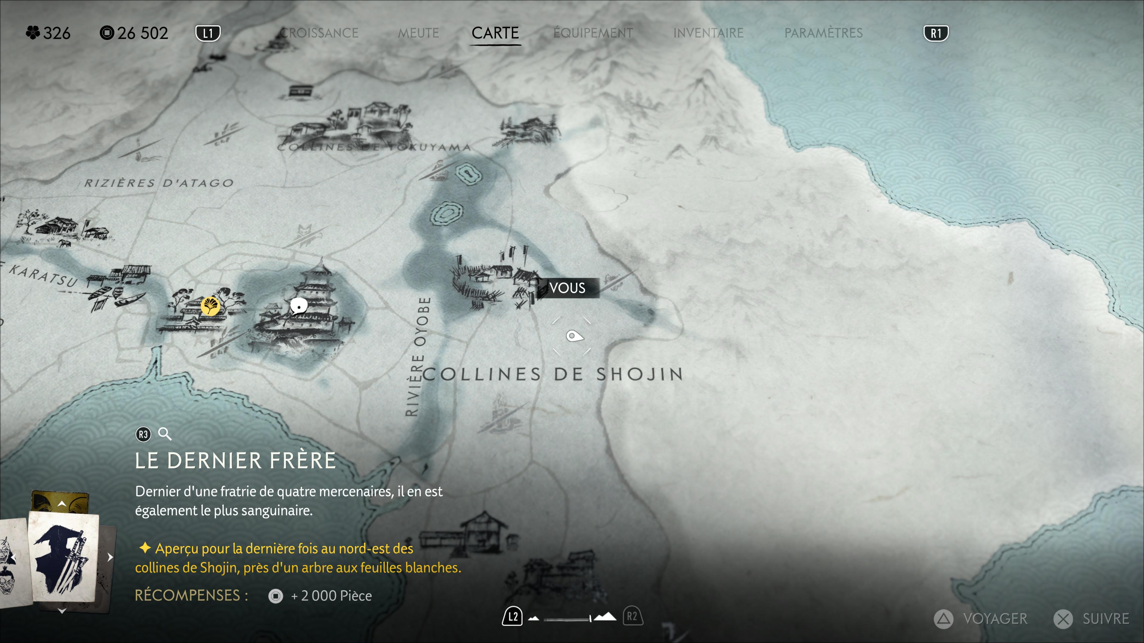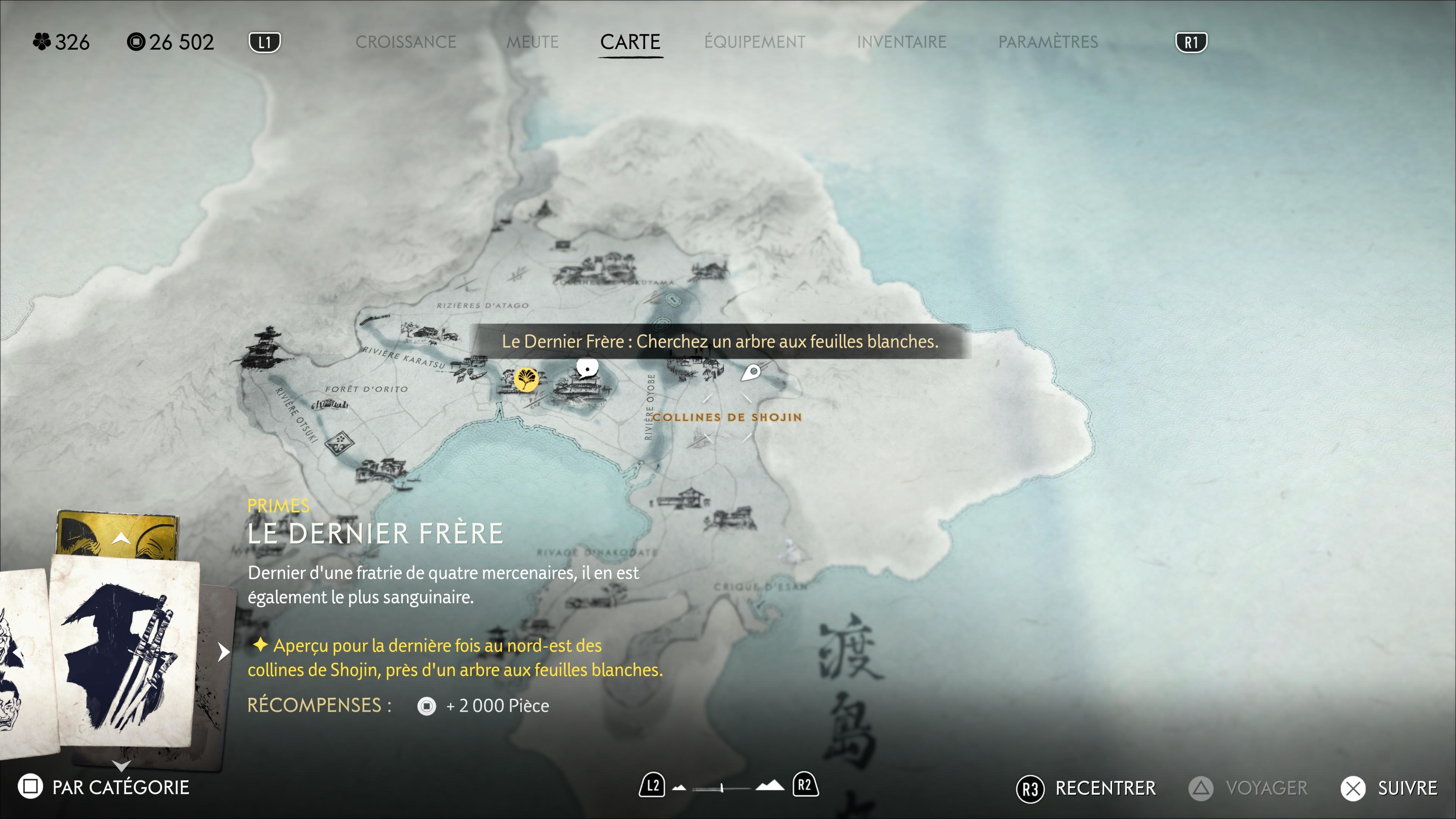 Le Dernier Frère sera à rejoindre à l’est de la région de la Côte d’Oshima, au nord-est de la zone Collines de Shojin. Cherchez un arbre aux feuilles blanches surplombant les lieux. Vous le verrez juste au-dessus le « de » de l’inscription « Collines de Shojin’ sur la map.