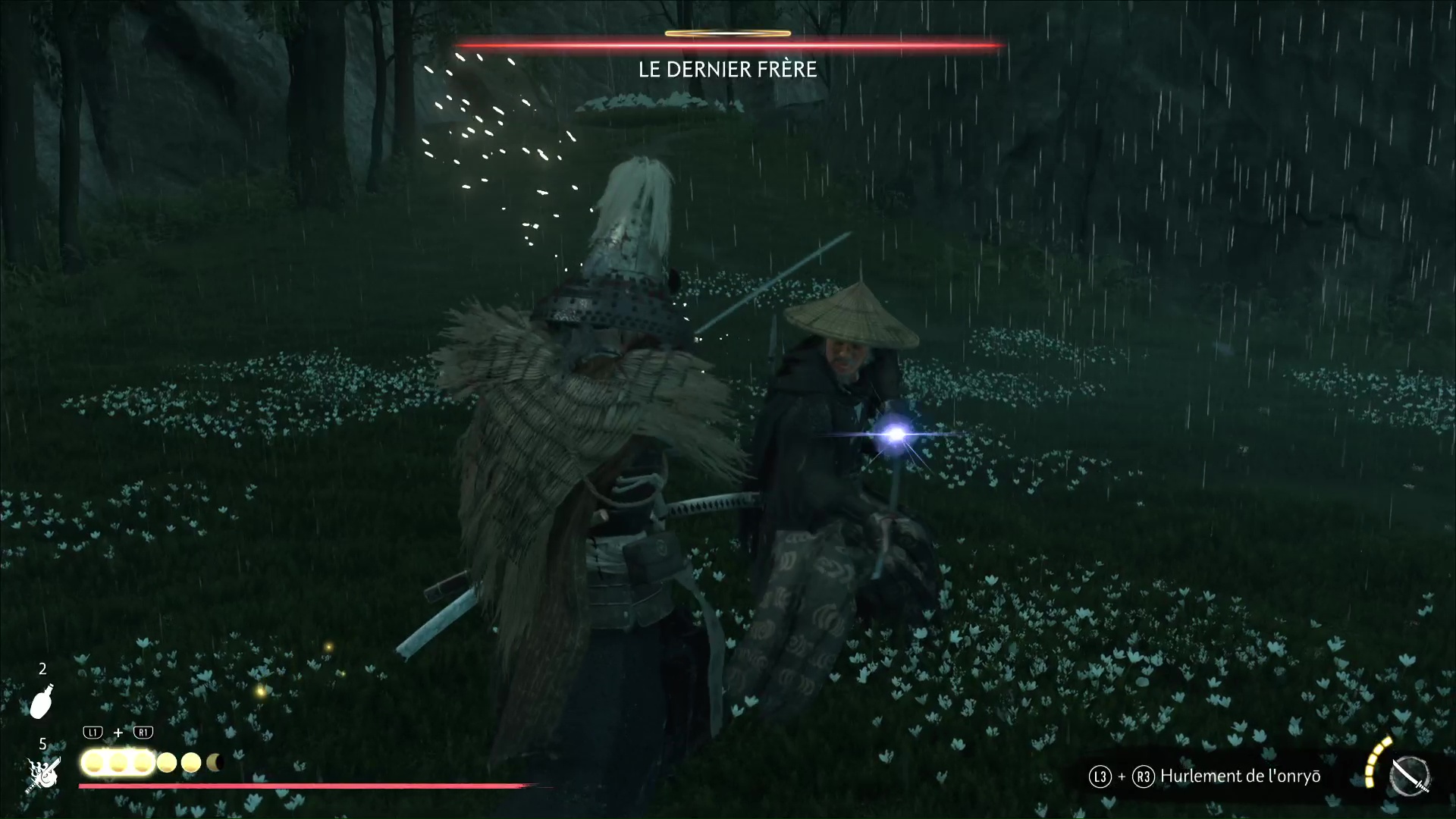 Votre adversaire dispose de pas mal d’attaques au katana, dont des enchaînements d’attaques bleues et un combo attaque rouge-attaque bleue que vous devriez connaître à présent. À un peu moins de 75% de sa vie, un tir retentit et touche le Dernier Frère.