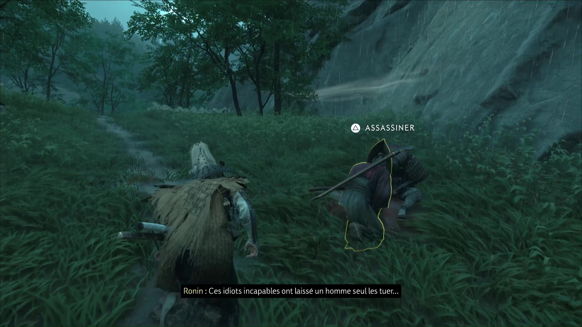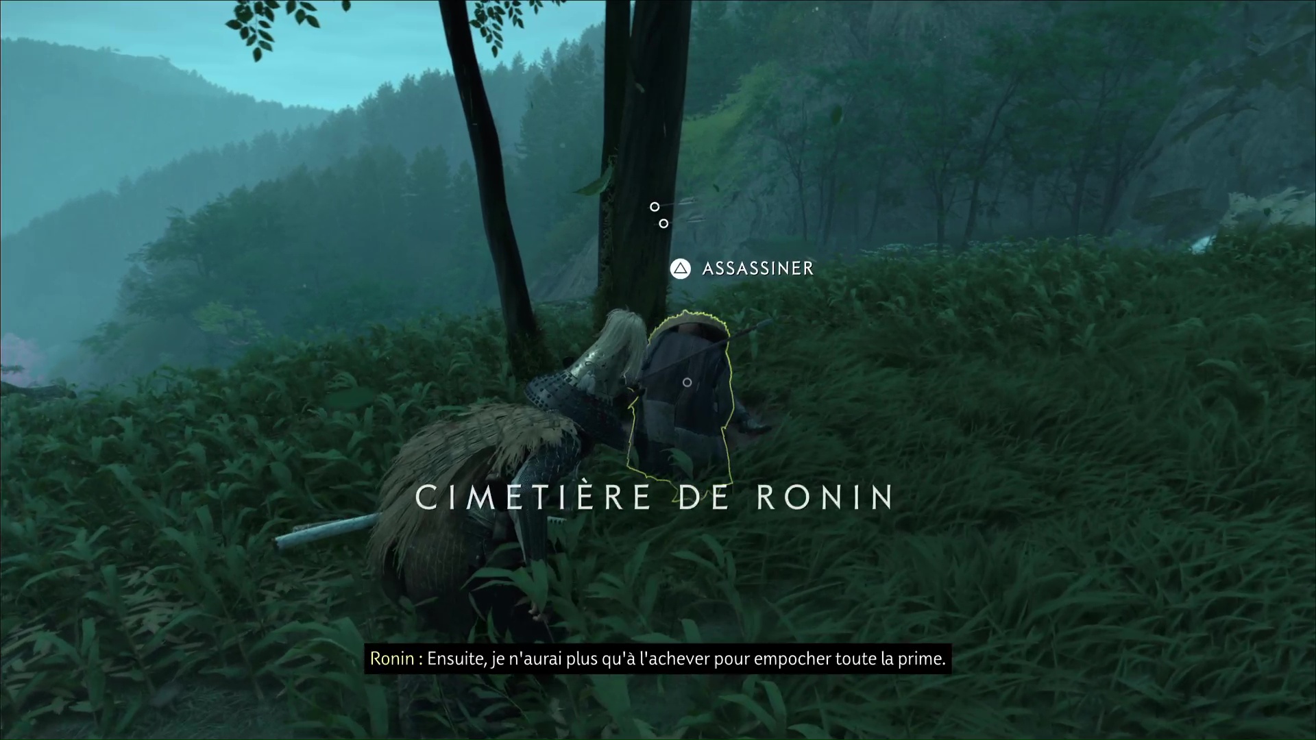 Remontez le chemin et vous tomberez sur un ronin en train de piller un cadavre. Assassinez-le. Quelques pas plus loin et cette fois sur la gauche, rebelote avec un autre ronin qui vous tourne le dos.