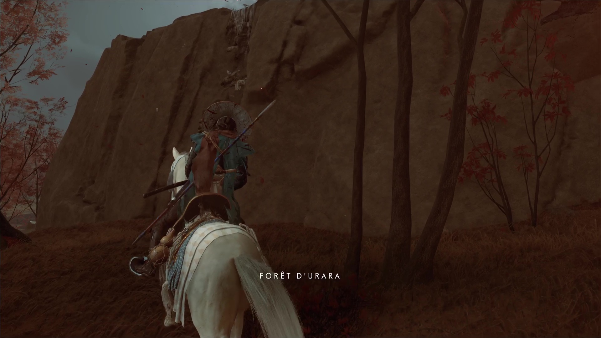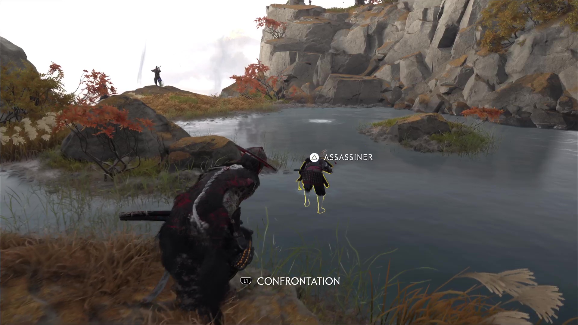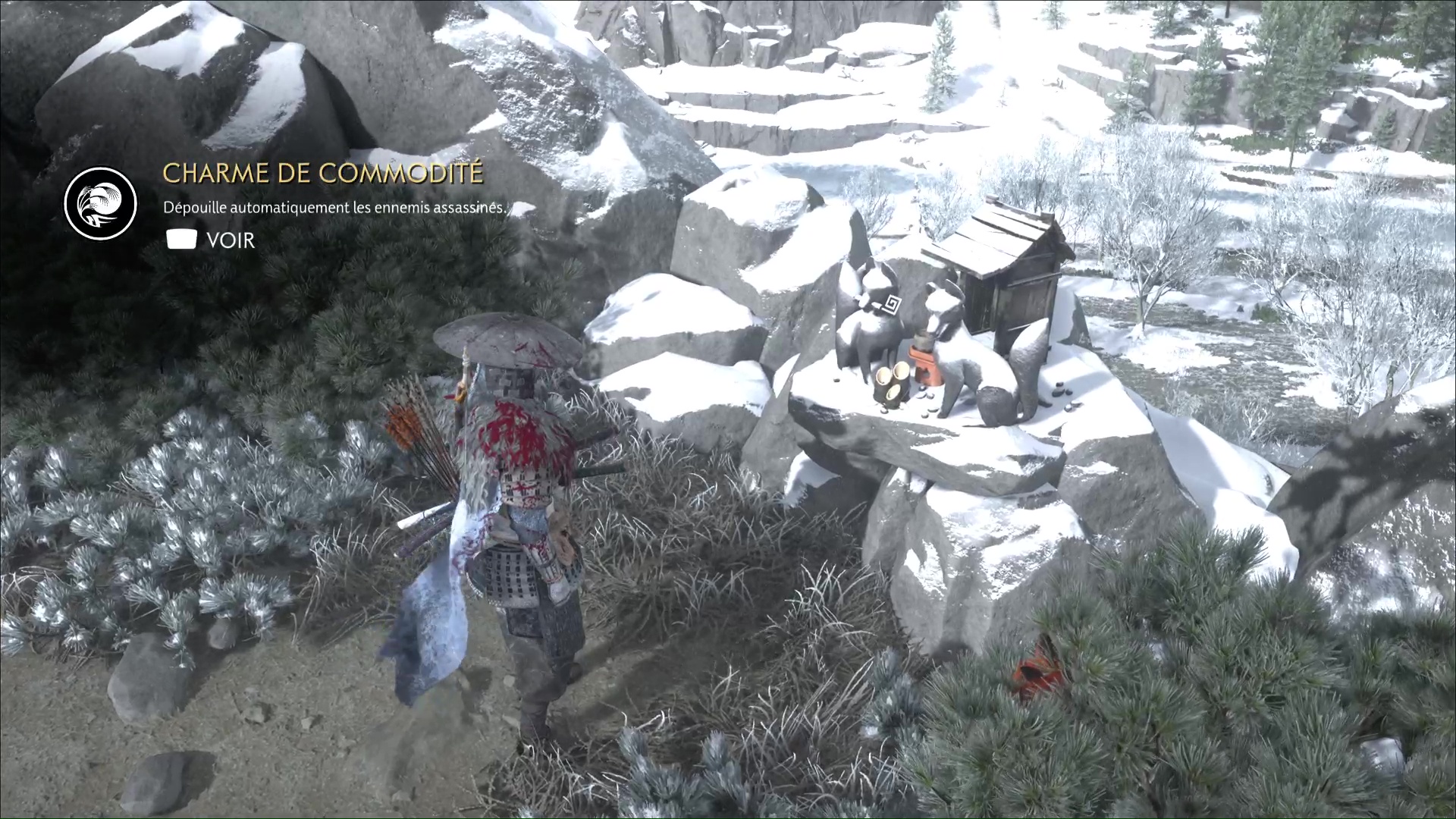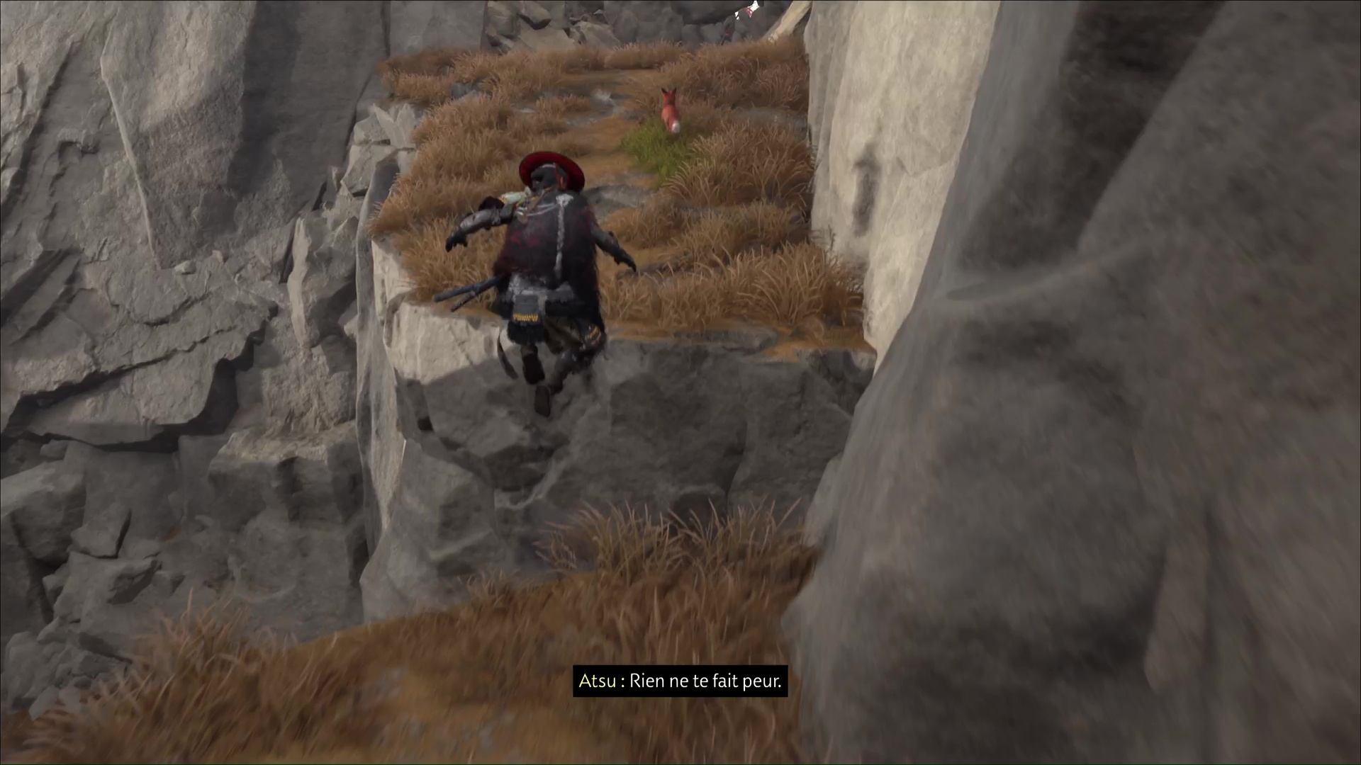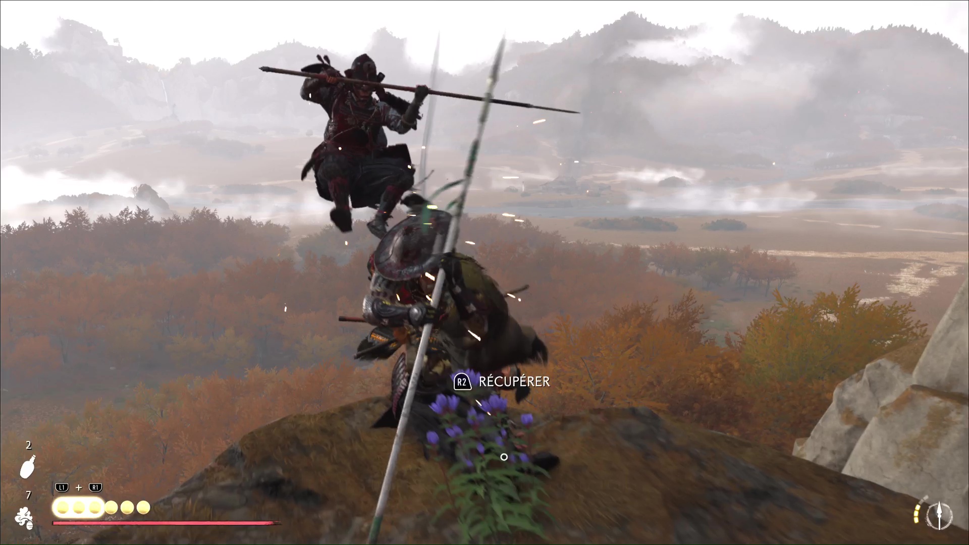 Attention, il y a des ennemis dans cette nouvelle zone. Vous pouvez bénéficier d’une Confrontation, ou bien les assassiner discrètement. Vous pouvez même profiter de la falaise pour obtenir le trophée 🏆 Sayonara en projetant un ennemi dans le vide avec votre yari, si vous l’avez.