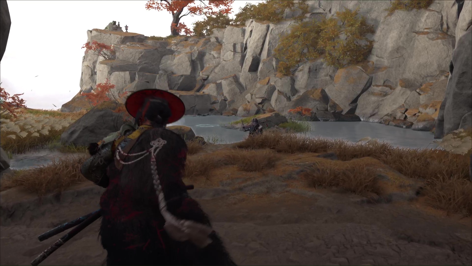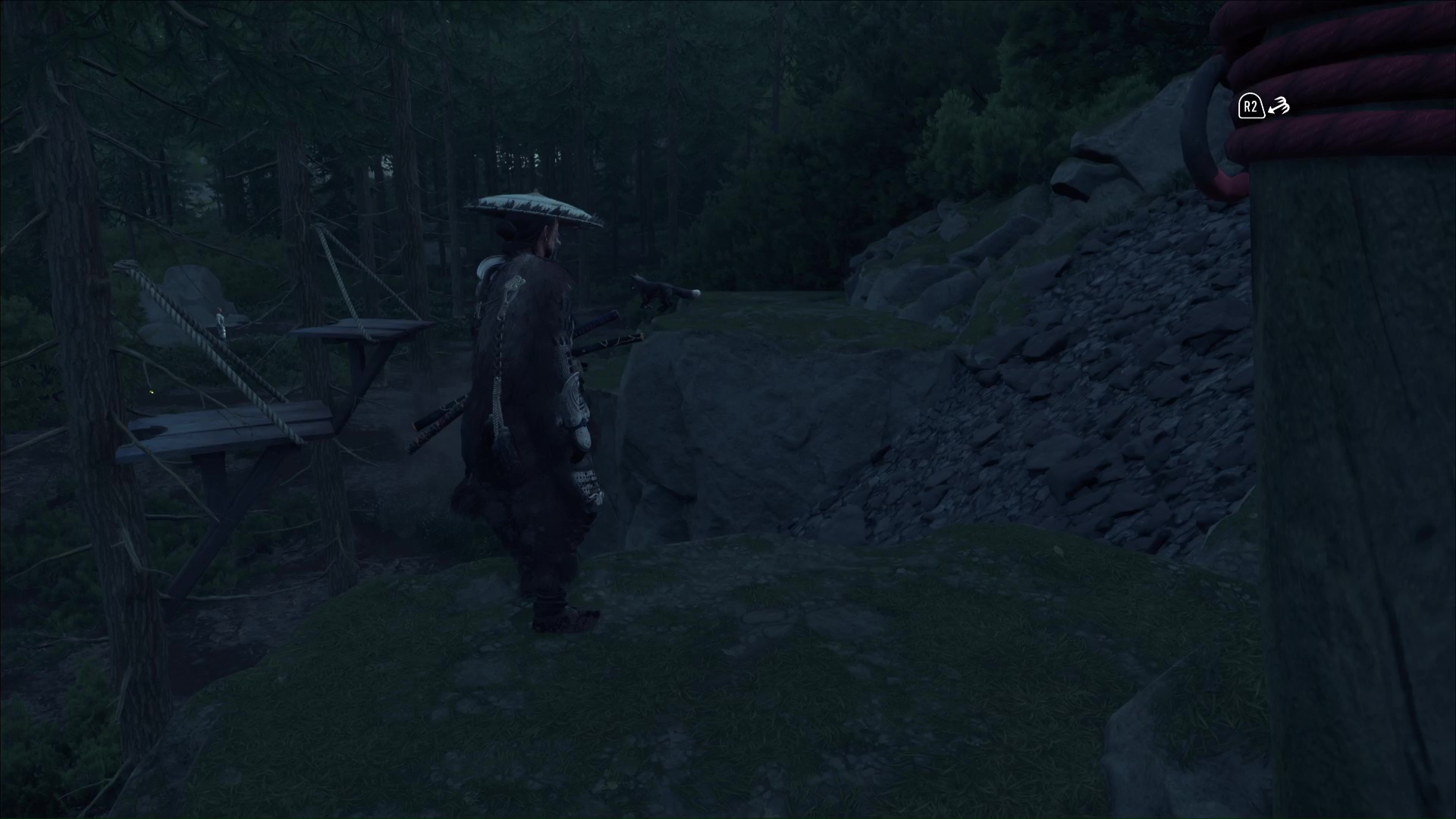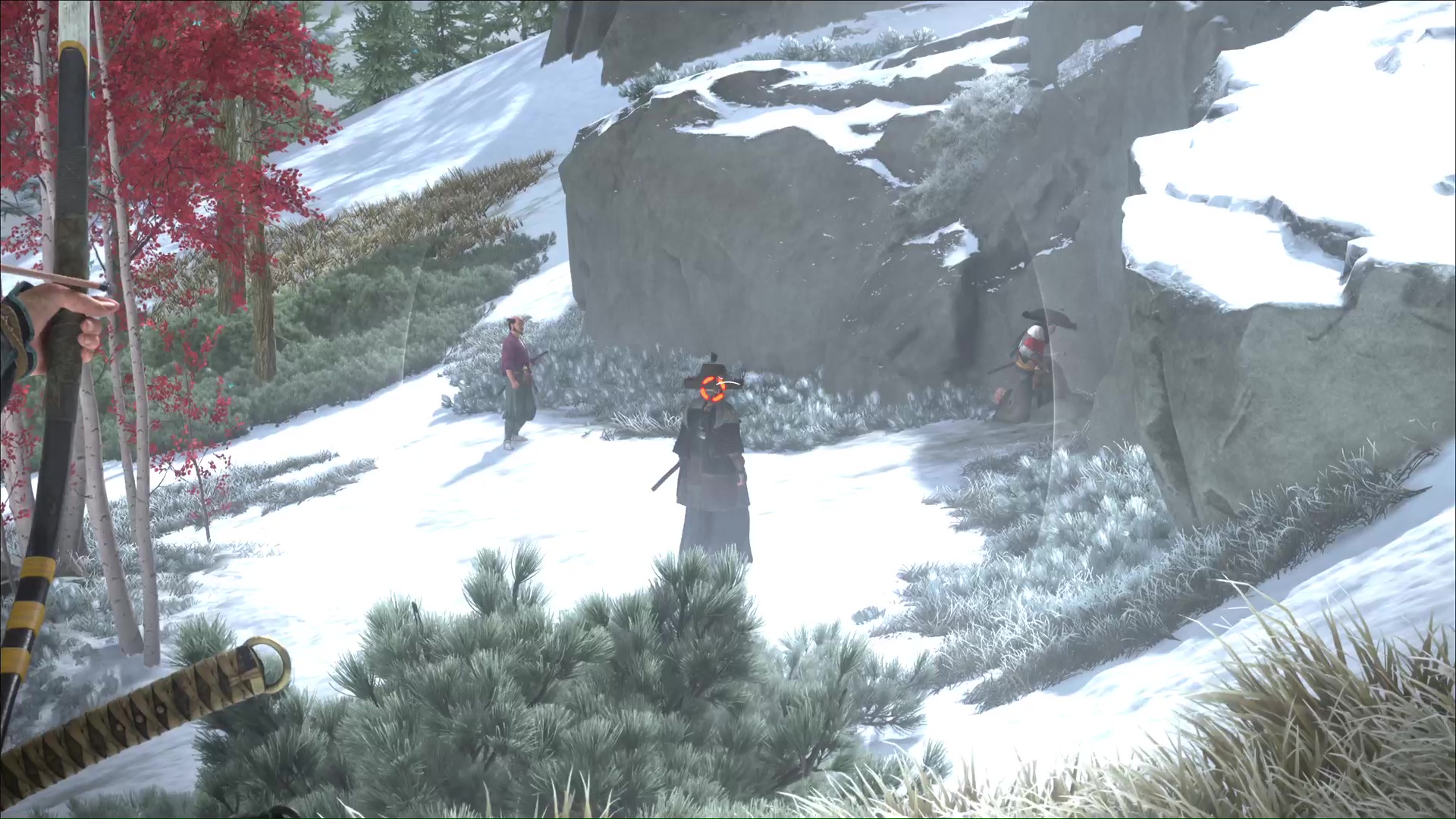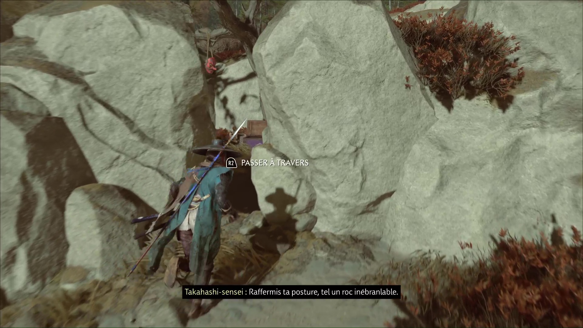 Attention, il y a des ennemis dans cette nouvelle zone. Vous pouvez bénéficier d’une Confrontation, ou bien les assassiner discrètement. Vous pouvez même profiter de la falaise pour obtenir le trophée 🏆 Sayonara en projetant un ennemi dans le vide avec votre yari, si vous l’avez.