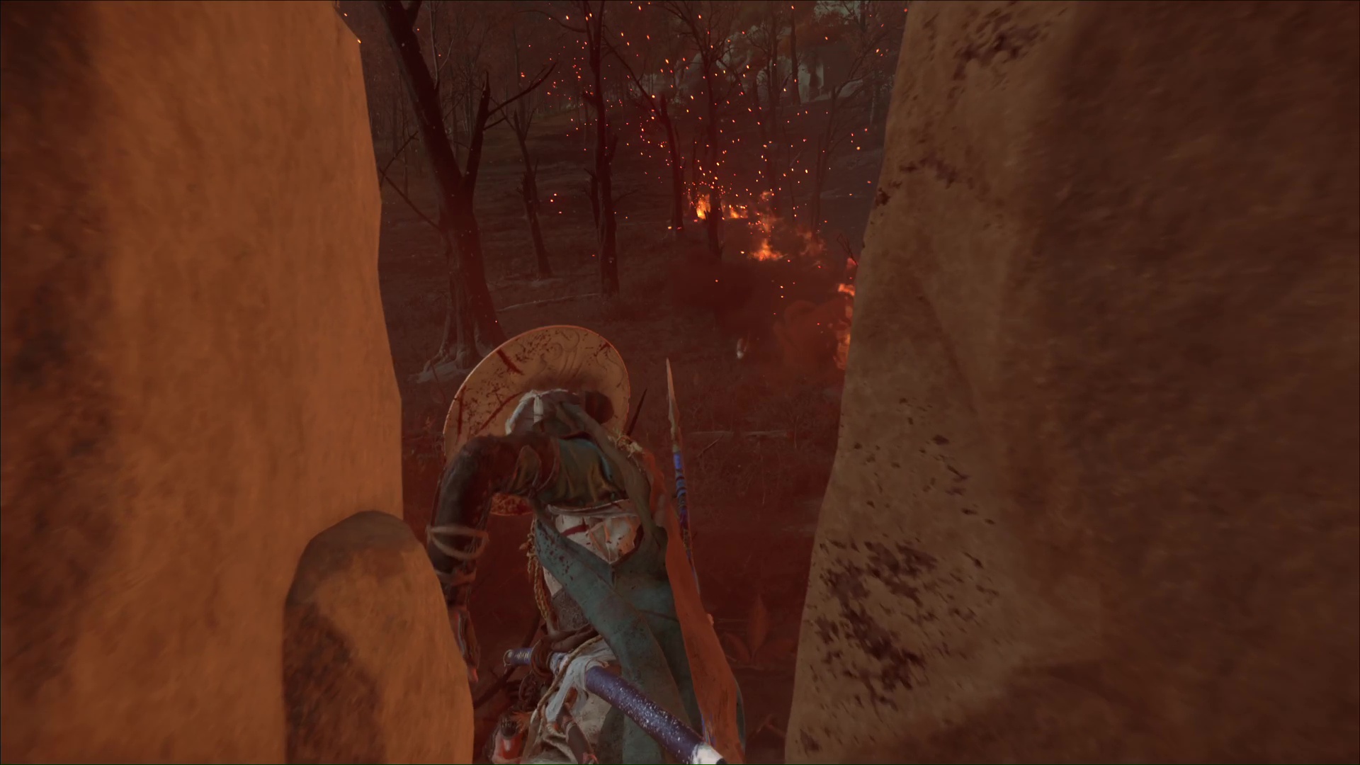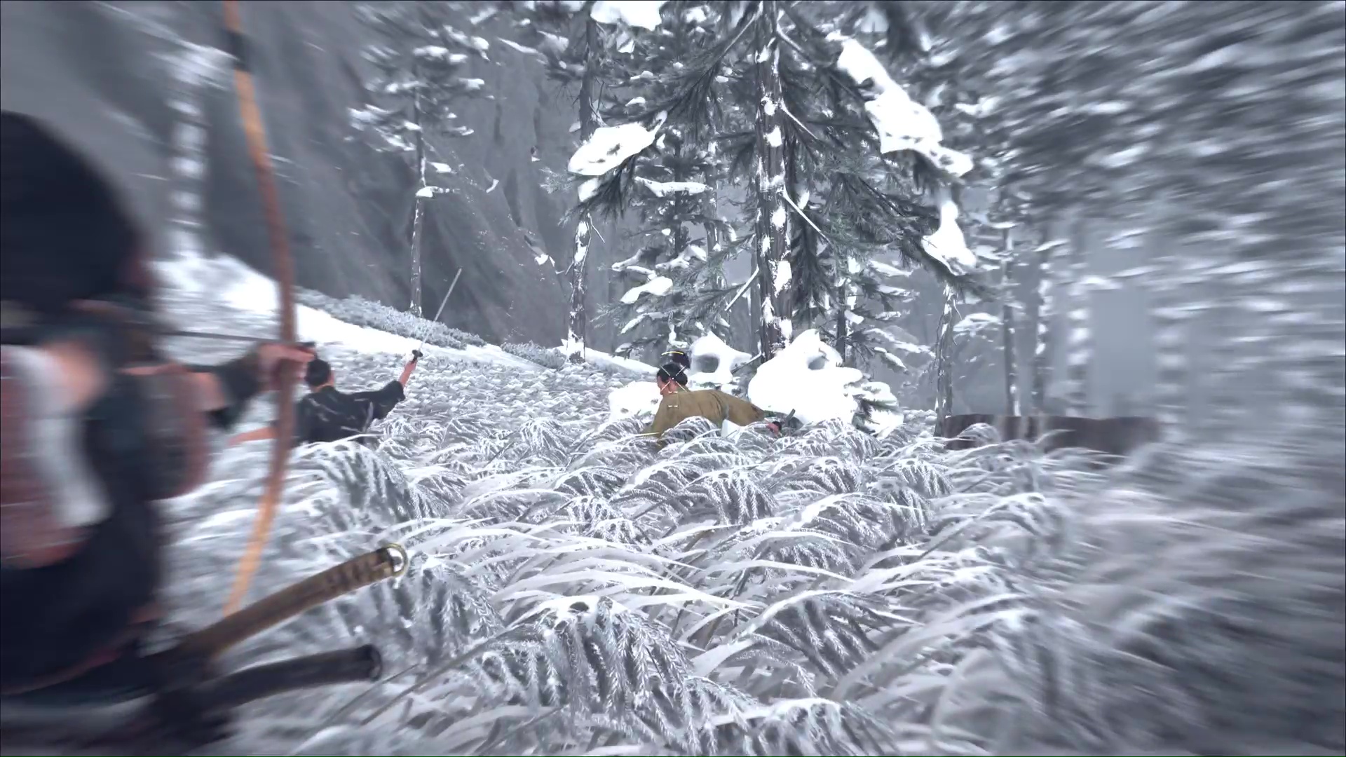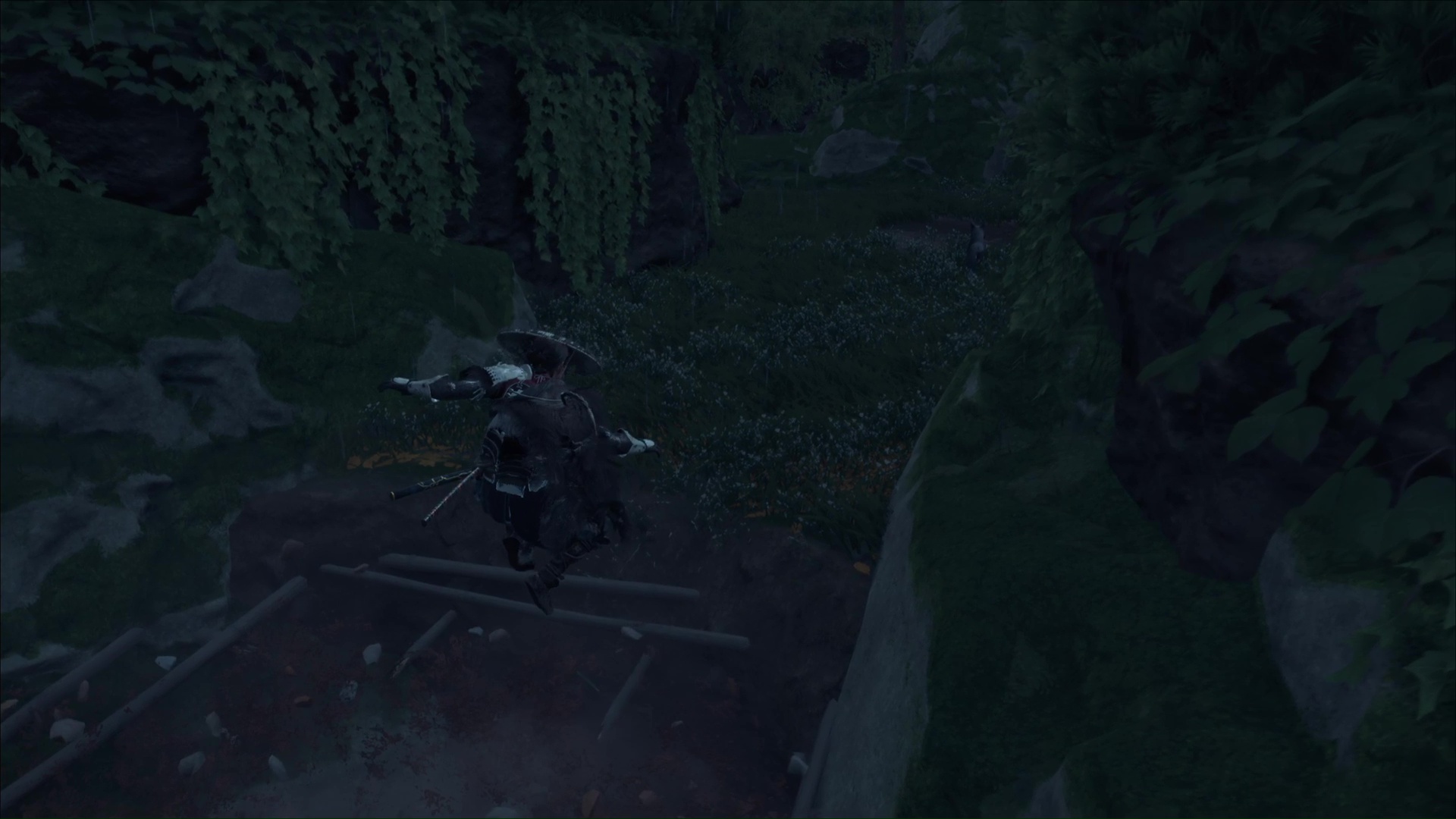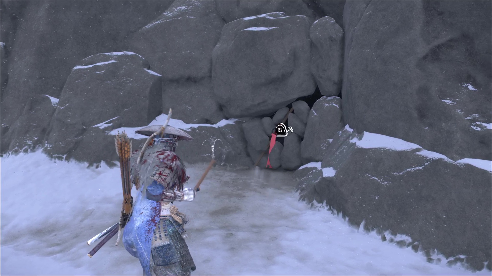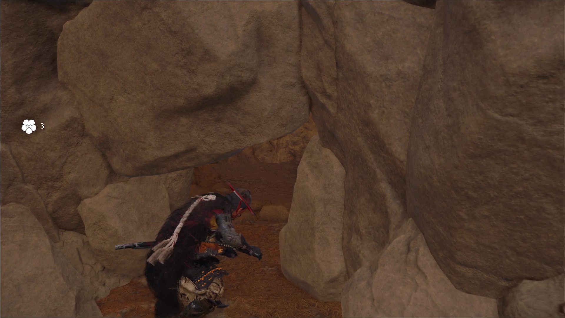Attention, il y a des ennemis dans cette nouvelle zone. Vous pouvez bénéficier d’une Confrontation, ou bien les assassiner discrètement. Vous pouvez même profiter de la falaise pour obtenir le trophée 🏆 Sayonara en projetant un ennemi dans le vide avec votre yari, si vous l’avez.
