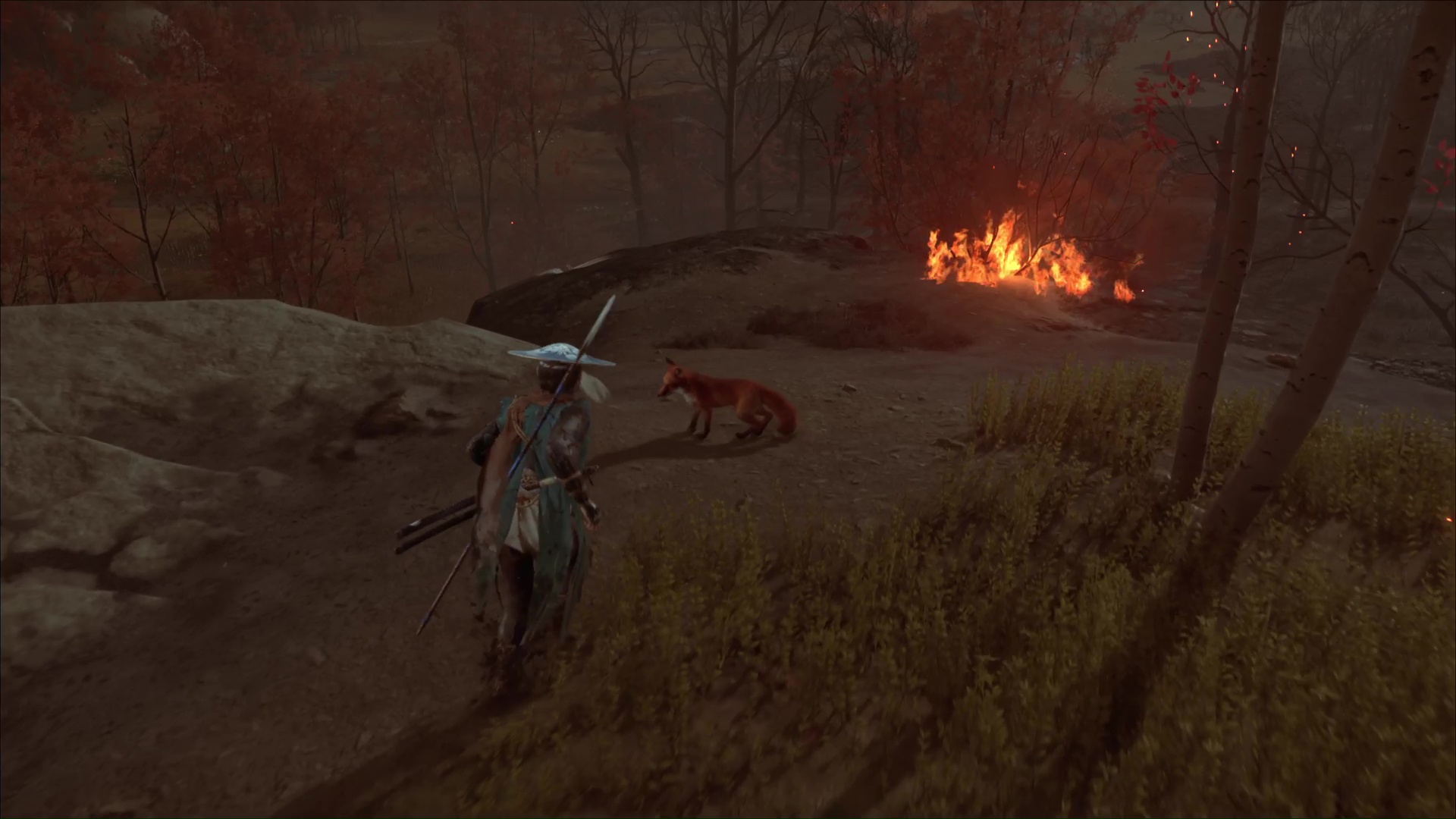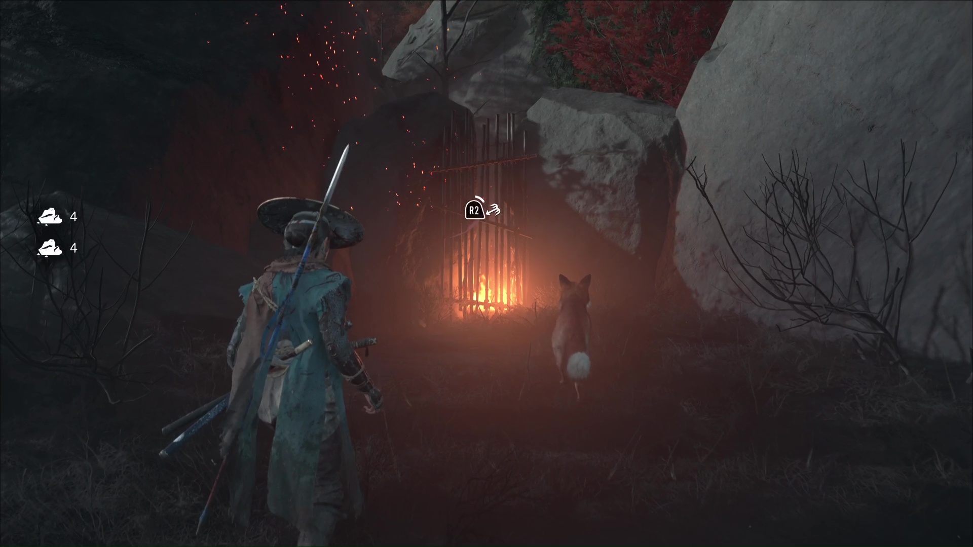 Au sud-est des Plaines d’Ishikari, et au nord-est de la Ferme d’Ishikari, vous apercevrez un terrier de renard pas comme les autres. En effet, celui-ci est en proie aux flammes. Il y a plusieurs moyens d’y accéder. Par le sud, par exemple, c’est en grimpant des prises rocheuses.
