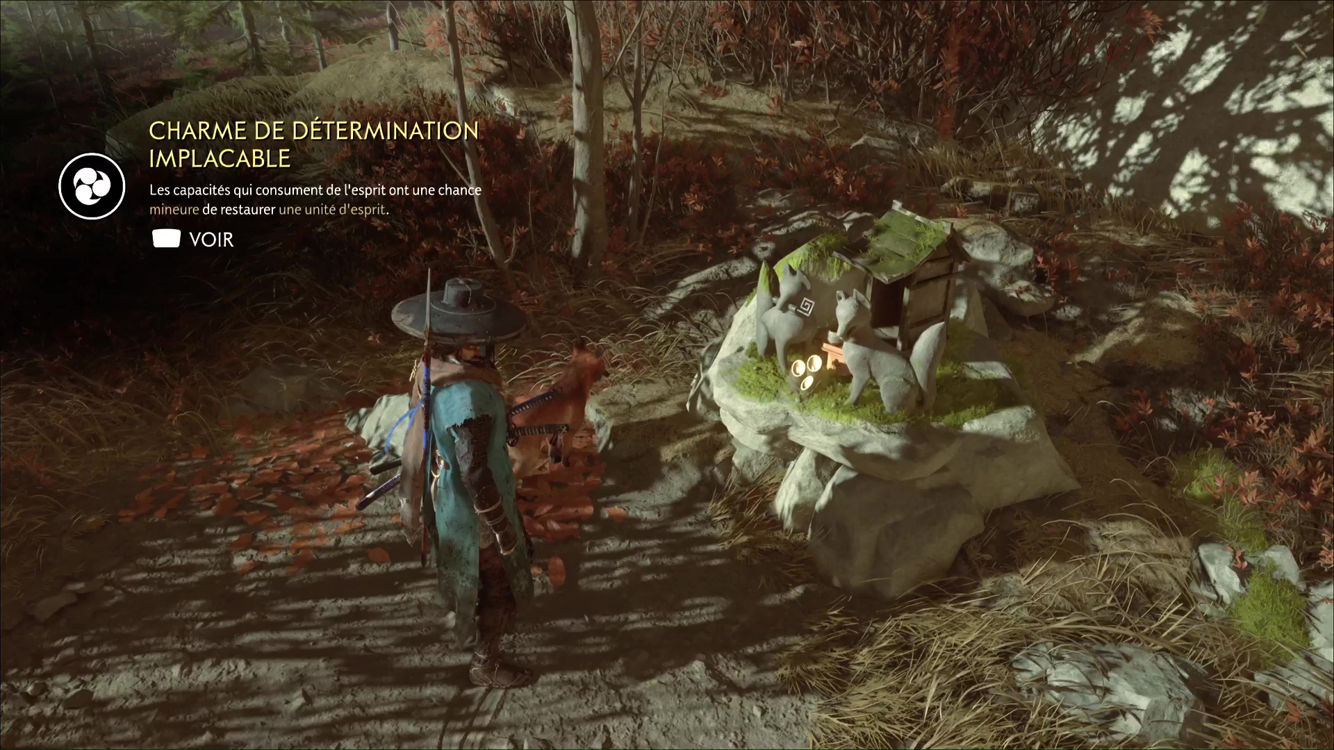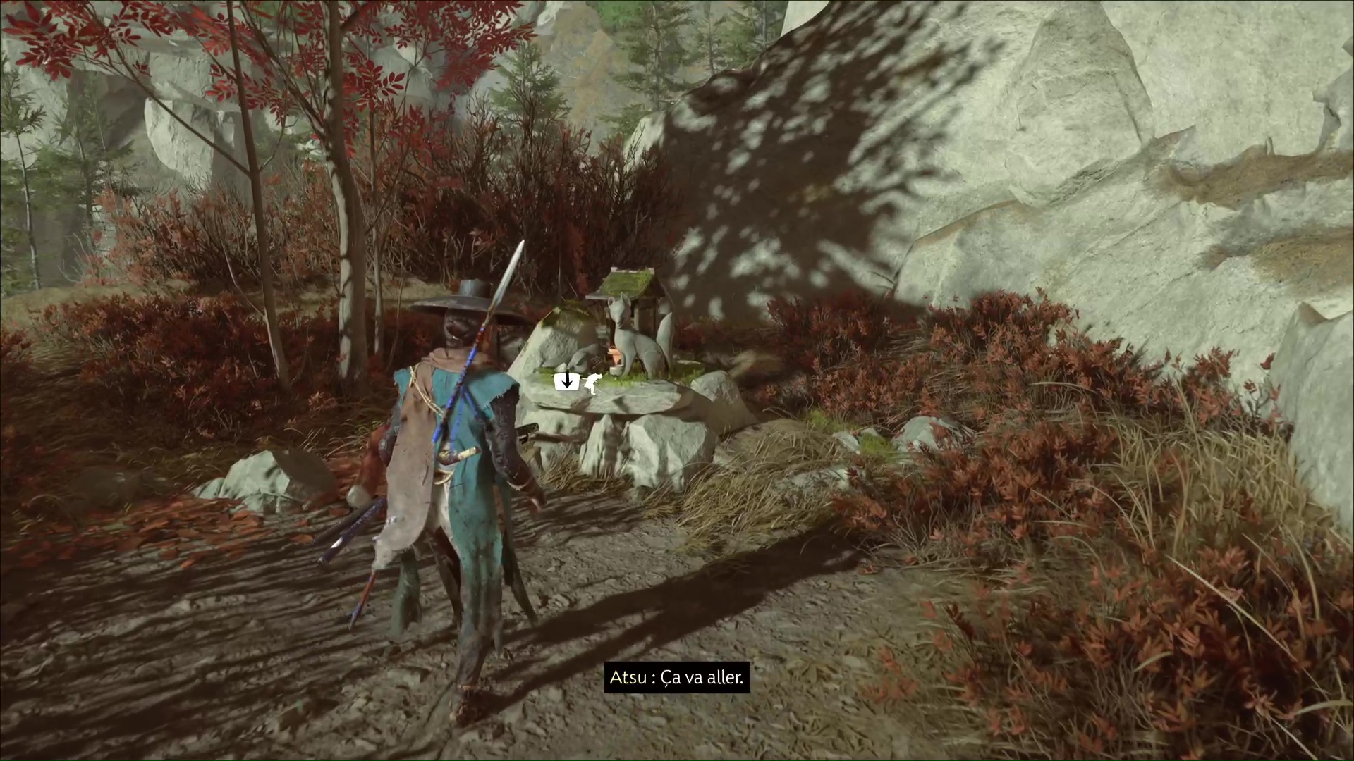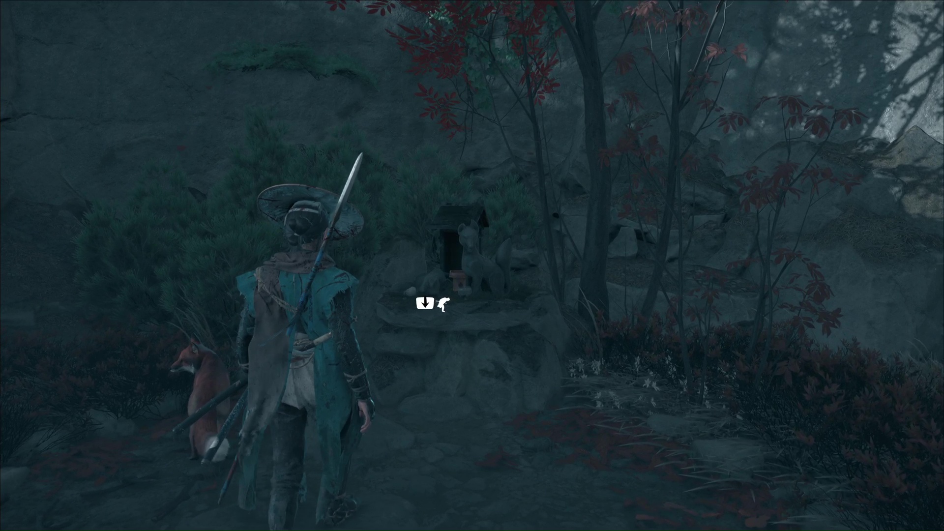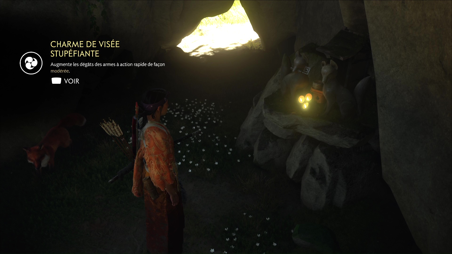 Celui-ci vous remercie et veut vous amener à une grotte. Accrochez le grappin à la barrière devant l’entrée, et tirez tous les deux. Passez de l’autre côté pour arriver au sanctuaire de la renarde. Priez et vous obtiendrez le Charme de salve brutale, un charme améliorable.