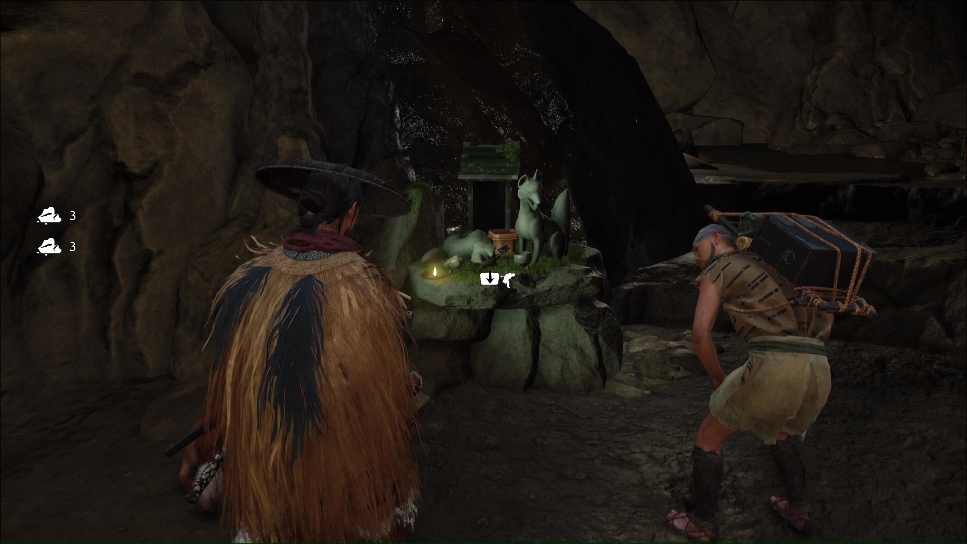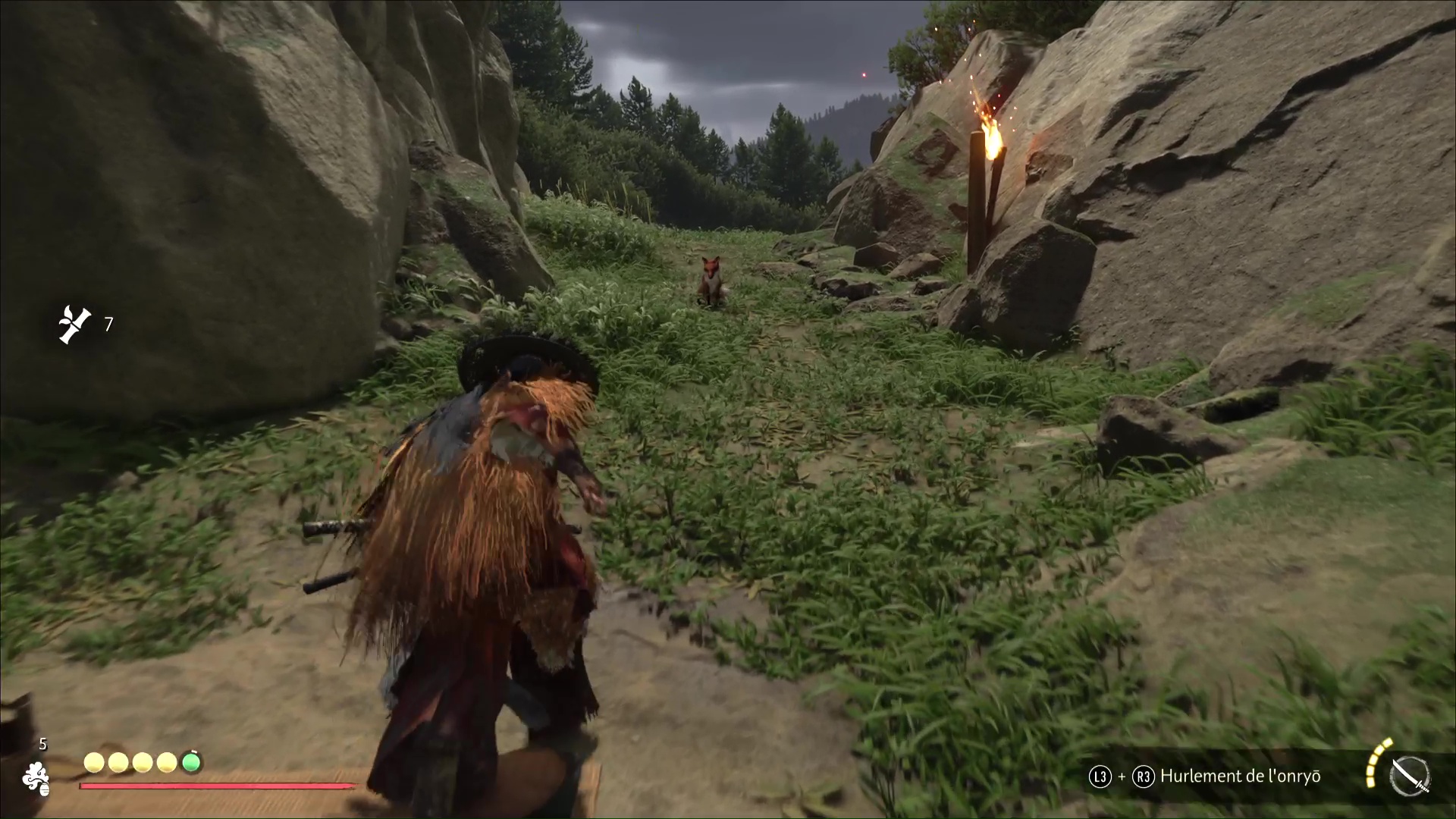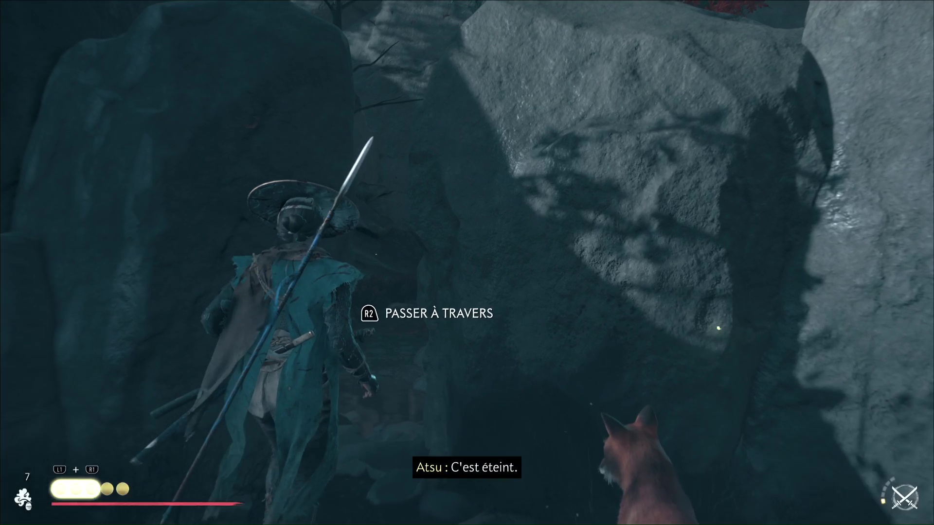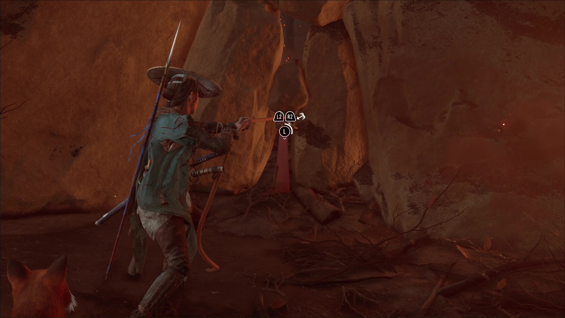 Celui-ci vous remercie et veut vous amener à une grotte. Accrochez le grappin à la barrière devant l’entrée, et tirez tous les deux. Passez de l’autre côté pour arriver au sanctuaire de la renarde. Priez et vous obtiendrez le Charme de salve brutale, un charme améliorable.