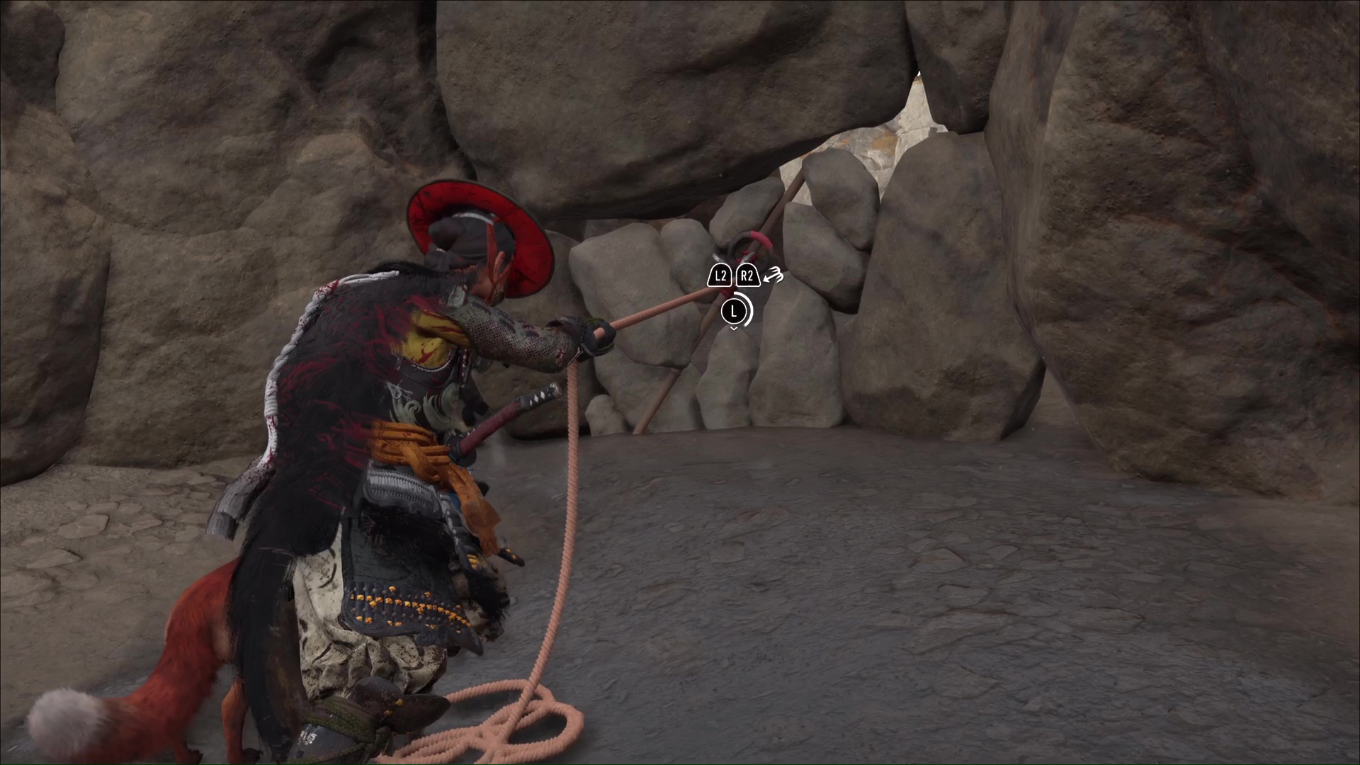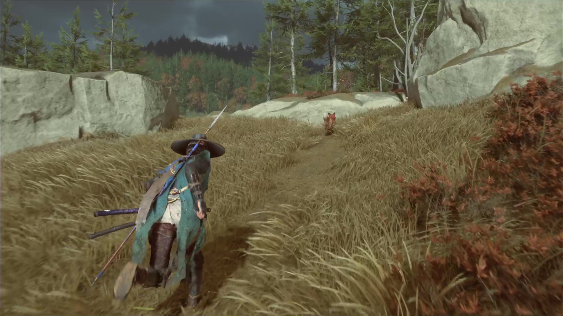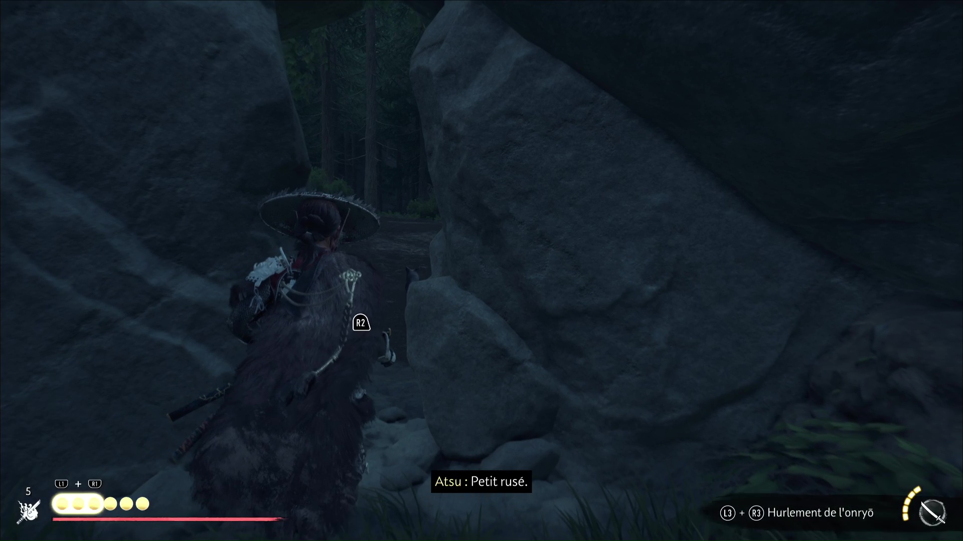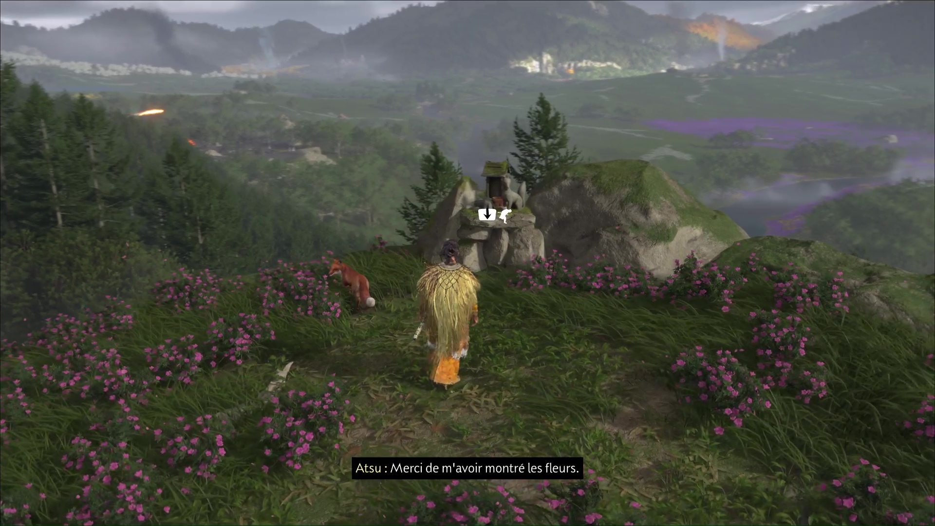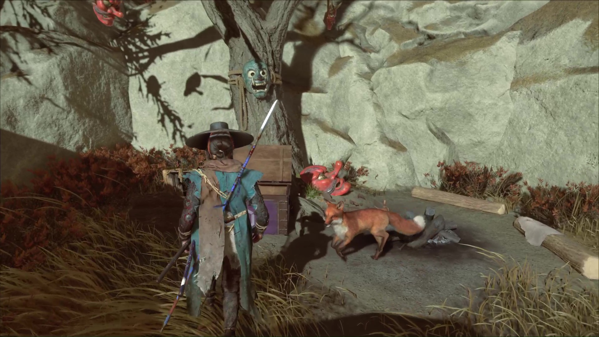 Celui-ci vous remercie et veut vous amener à une grotte. Accrochez le grappin à la barrière devant l’entrée, et tirez tous les deux. Passez de l’autre côté pour arriver au sanctuaire de la renarde. Priez et vous obtiendrez le Charme de salve brutale, un charme améliorable.