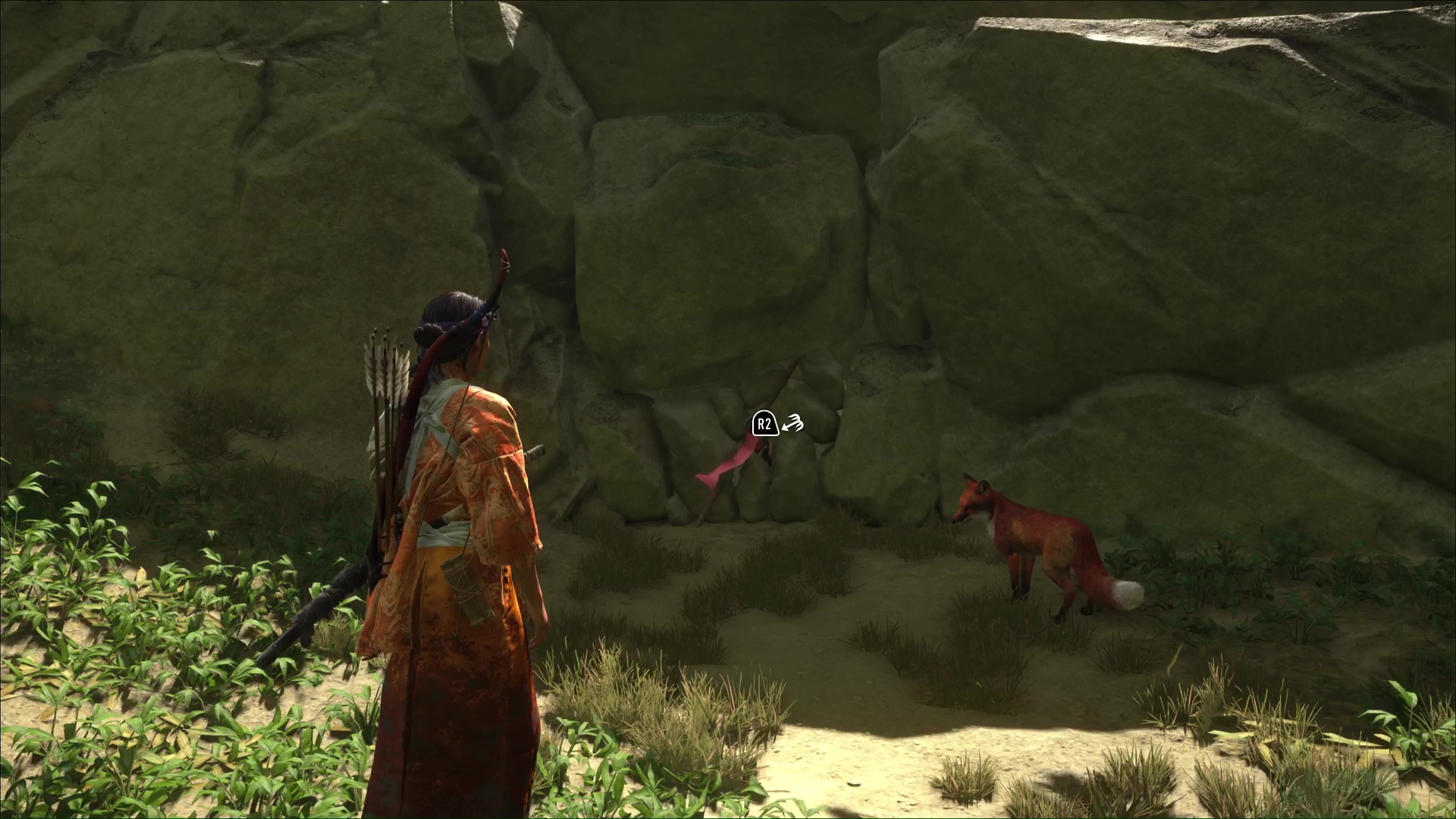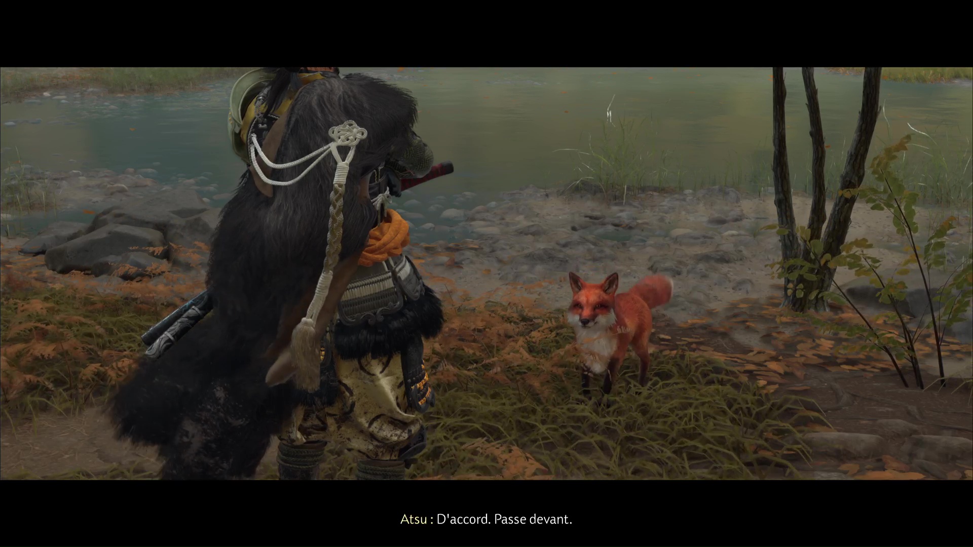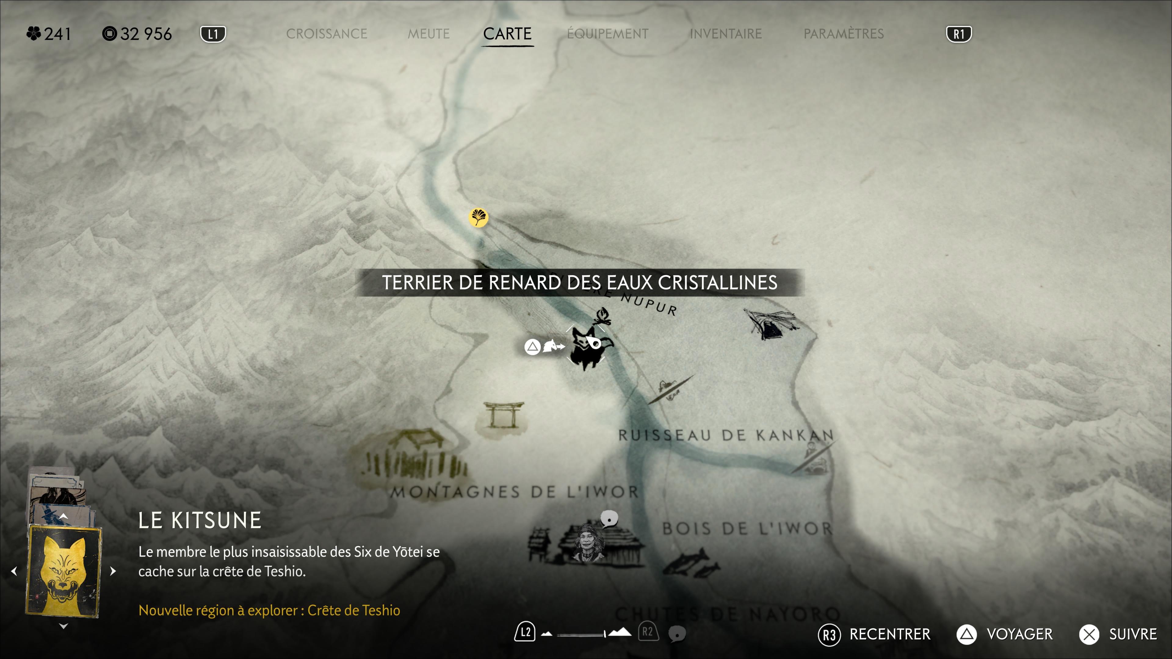 Dans les Prairies de Yōtei, rendez-vous sur la rive gauche de la rivière au nord des Chutes de la Tranquillité. Arrivé au terrier, suivez le renard.