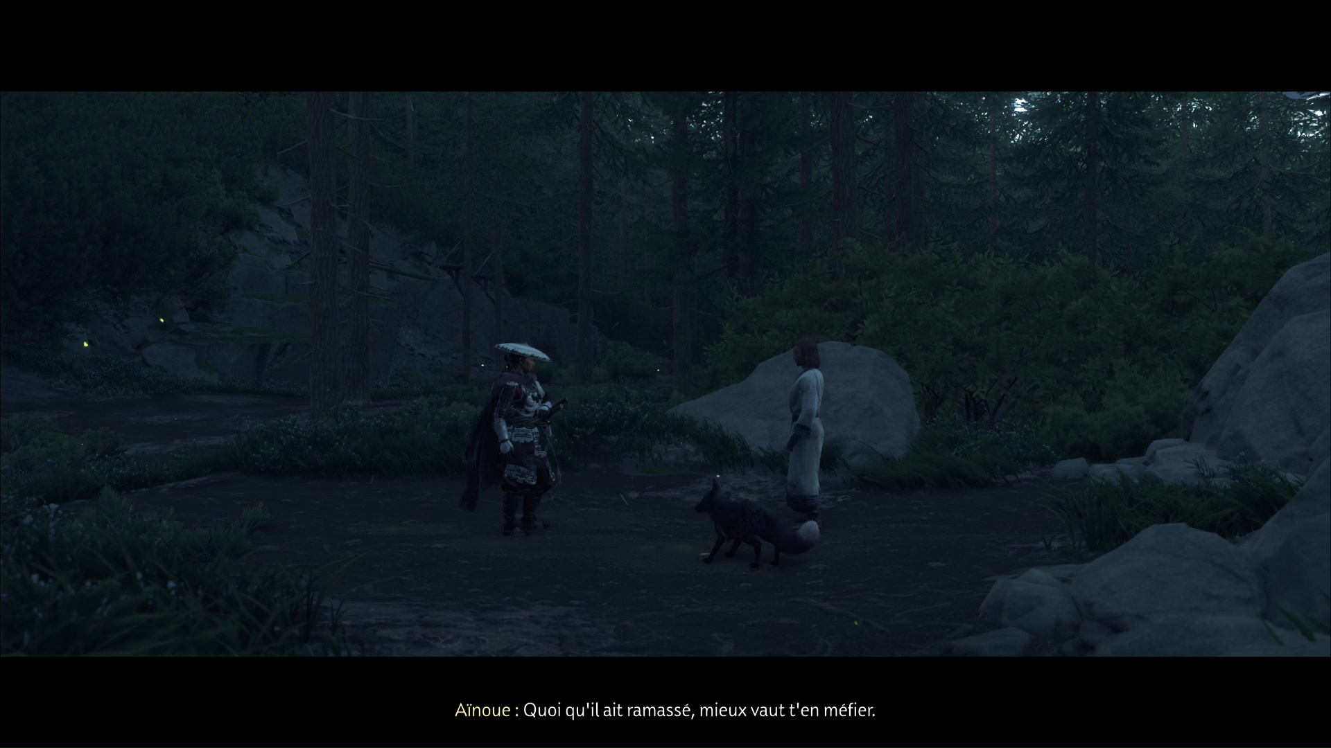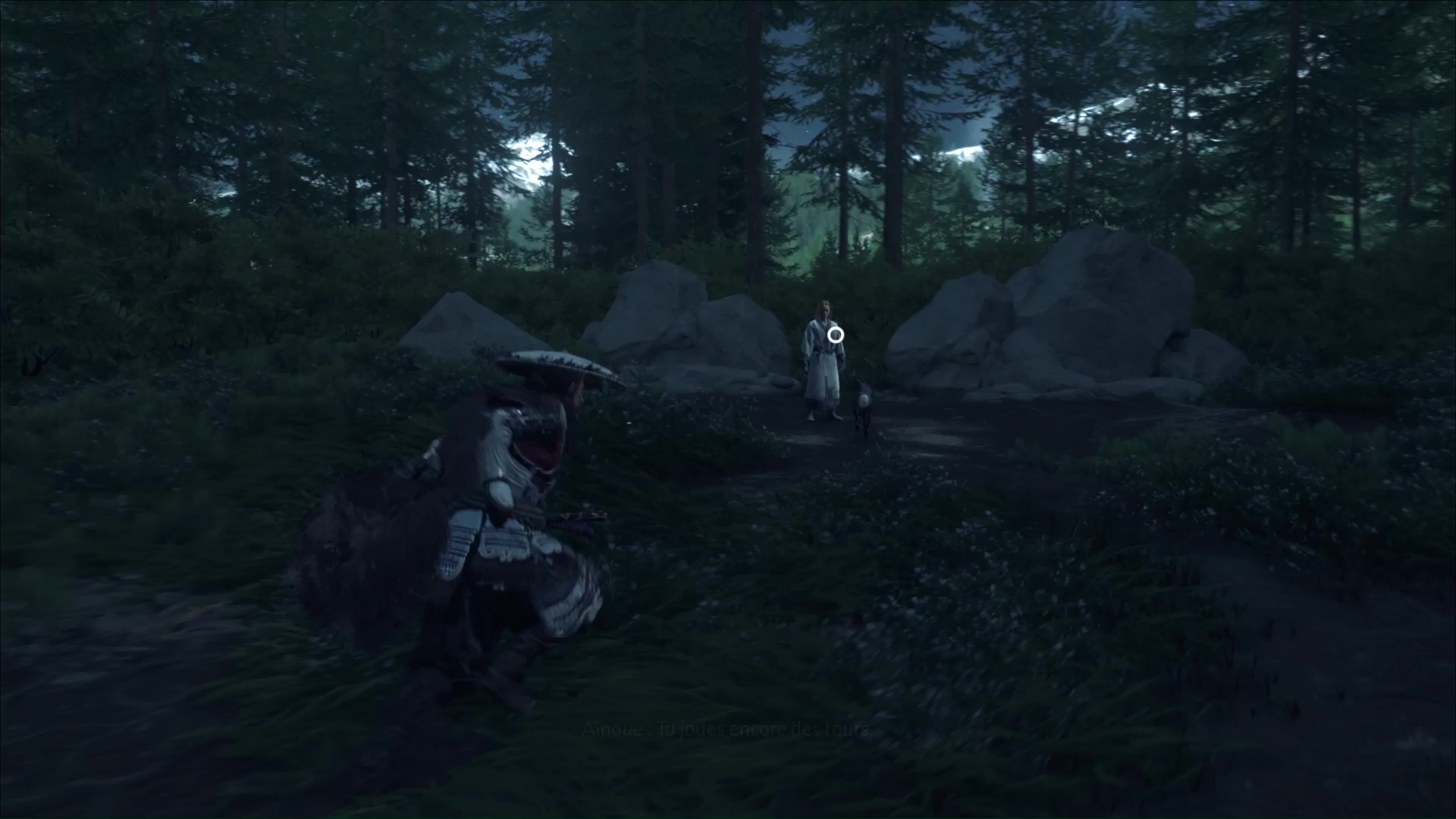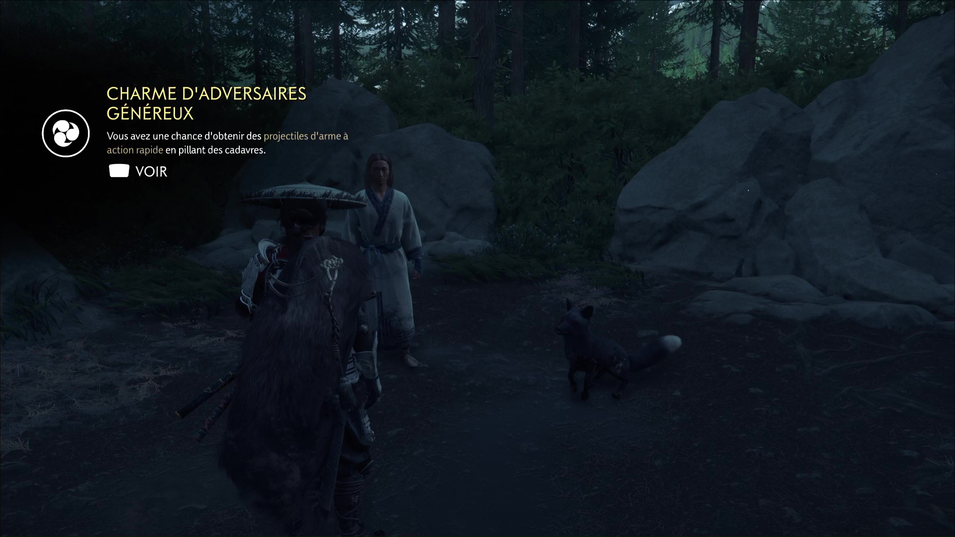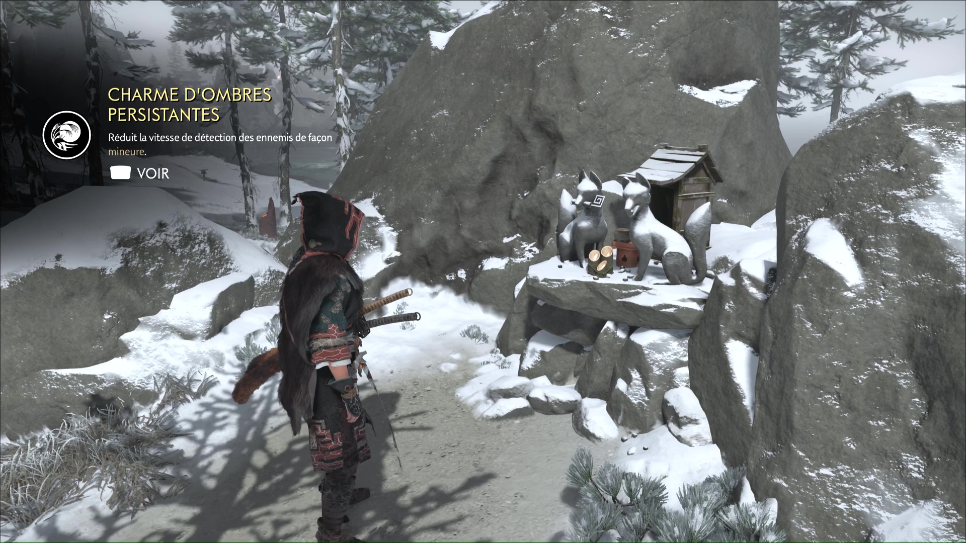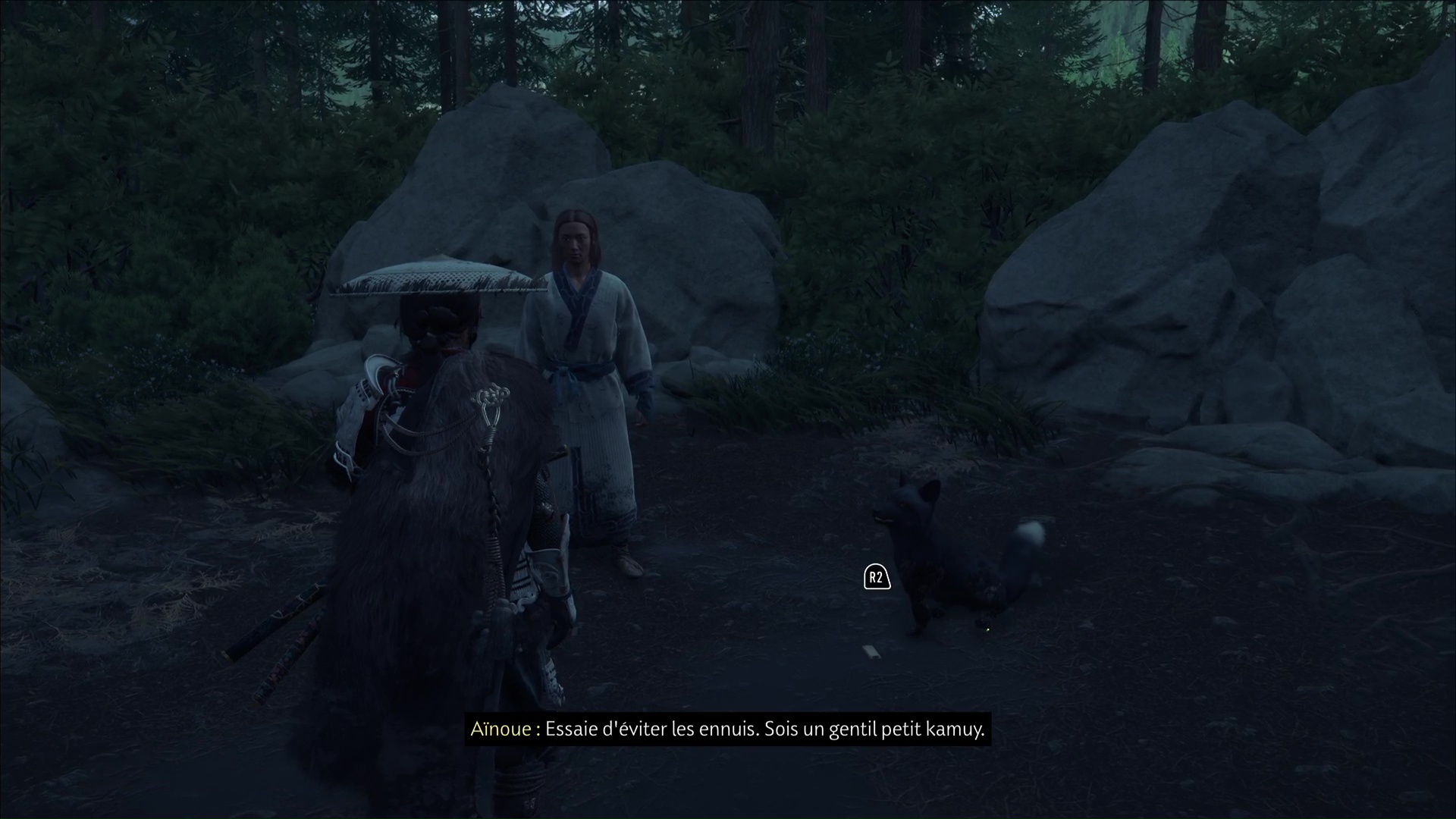 Enfin, et au bout de quelques pas, vous arriverez devant une aïnoue. Parlez-lui pour entendre ce qu’on raconte sur les renards noirs, puis ramassez le charme que votre partenaire de jeu a laissé tombé. Il s’agit du Charme d’adversaires généreux.