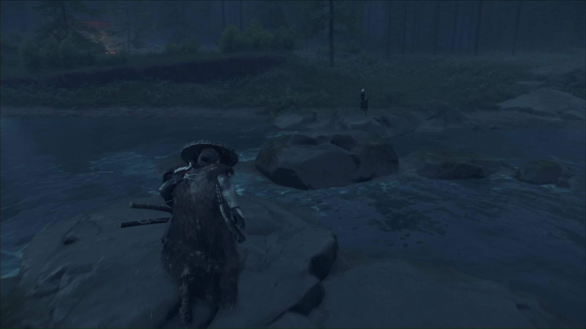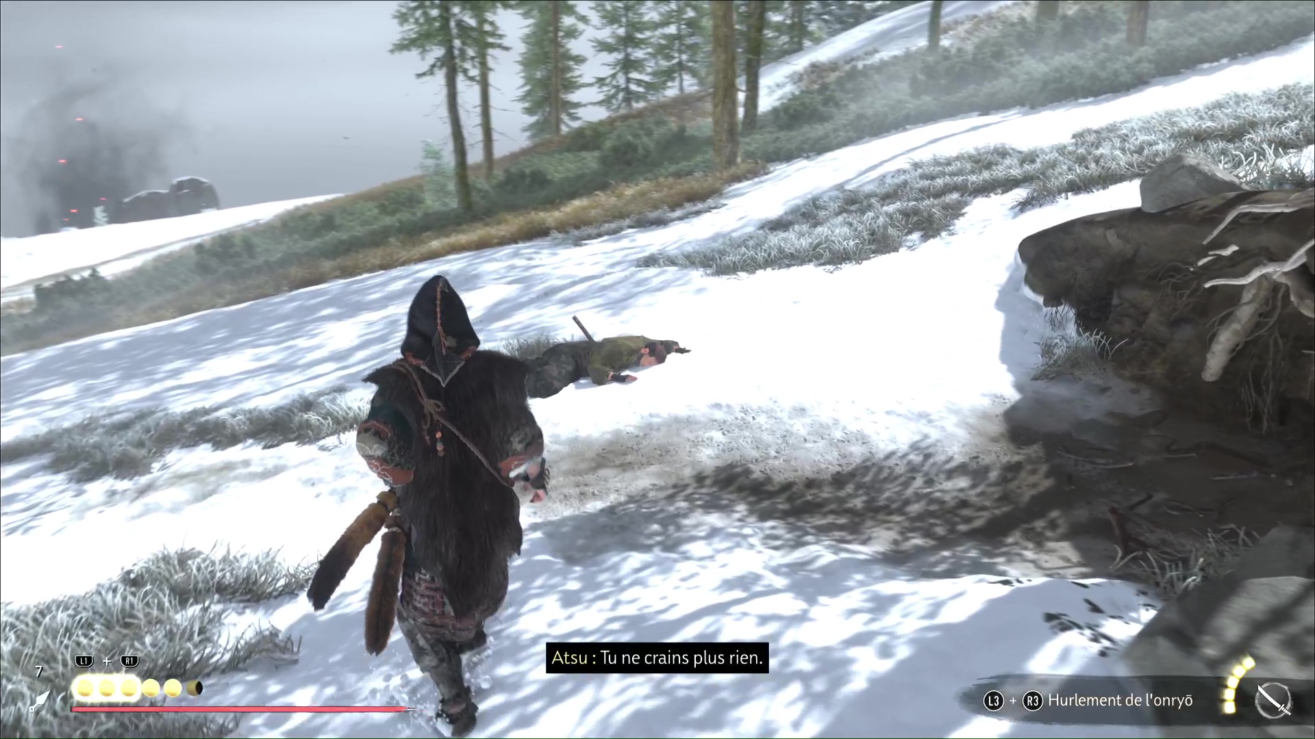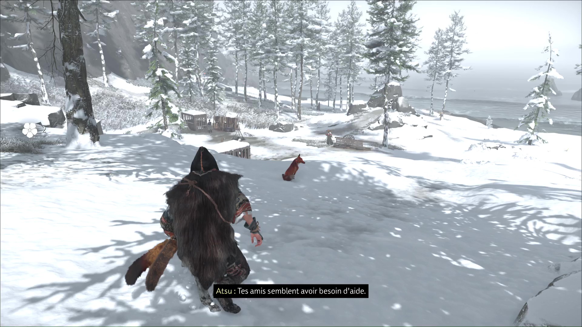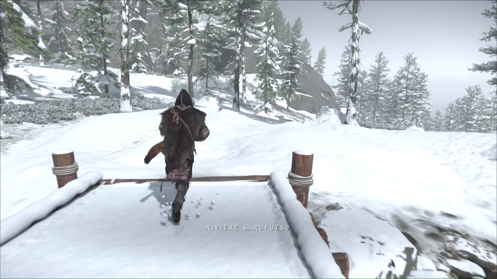 Une fois la menace écartée, le renard se manifestera. Suivez-le ensuite. Vous franchirez un pont vous amenant de l’autre côté de la Rivière Sarubetsu, avant de terminer votre route devant un campement de braconniers.