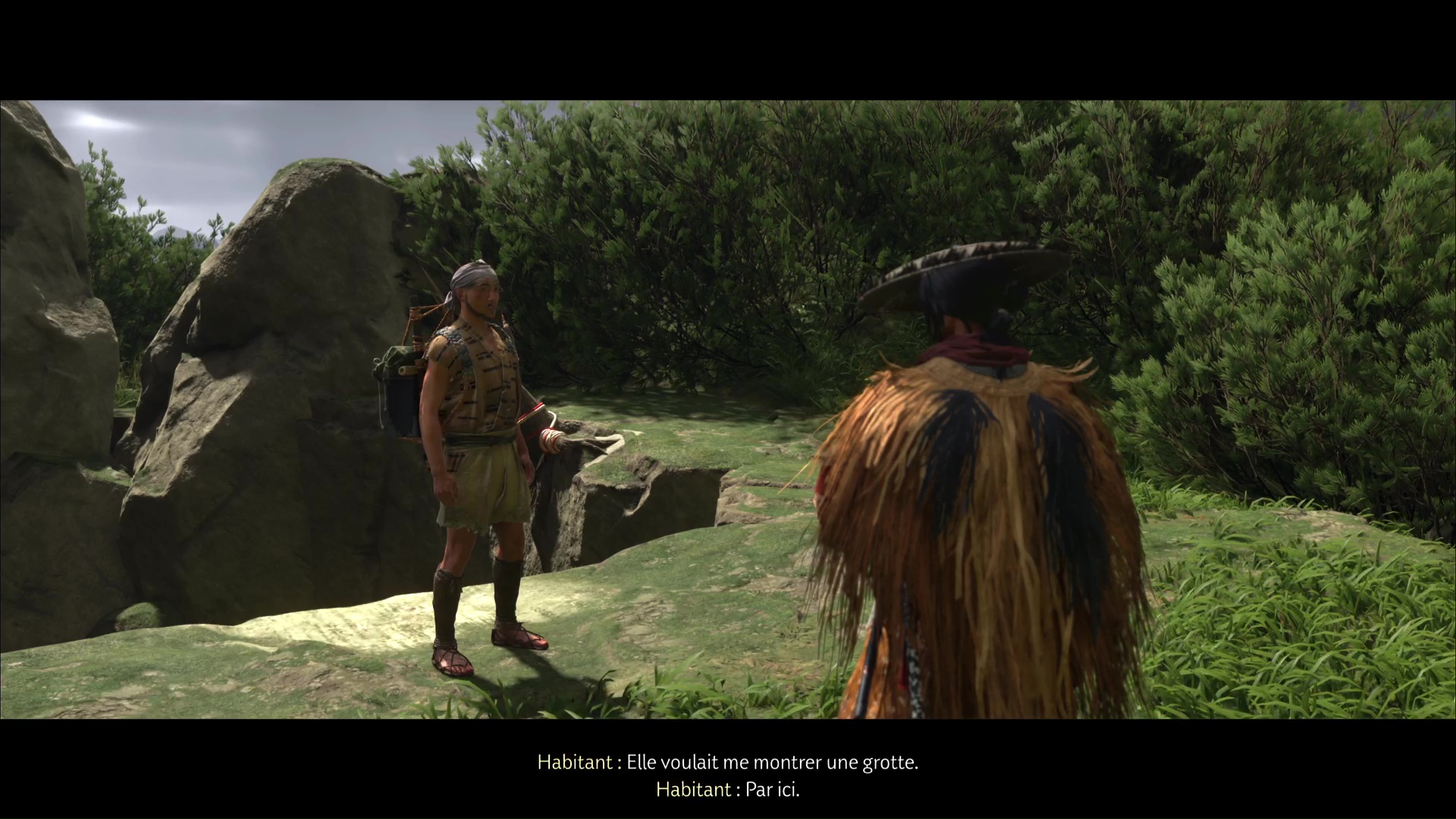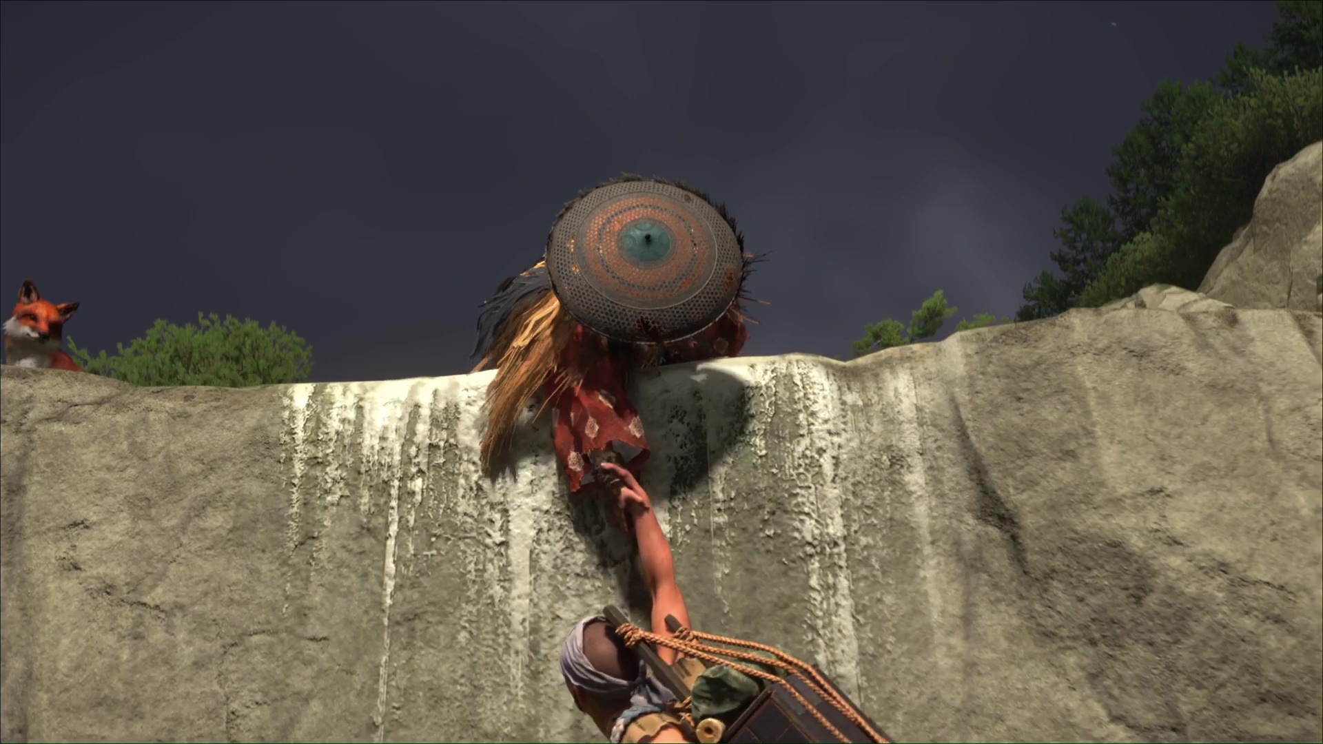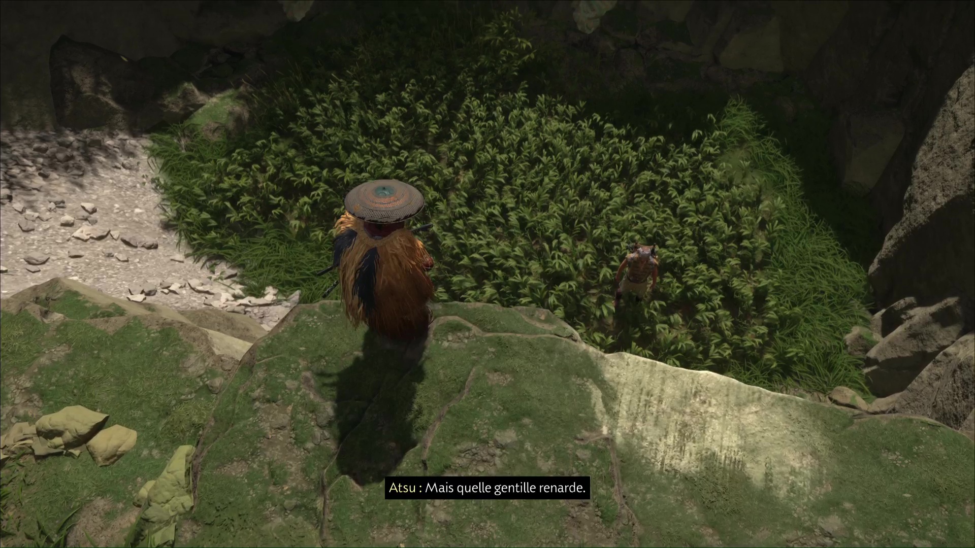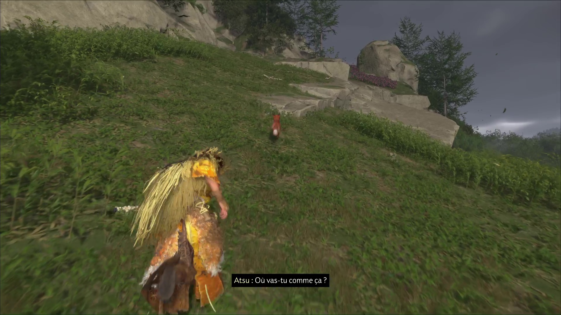 Suivez la boule de poils en montant la colline jusqu’à arriver à une fosse dans laquelle est coincé un homme. Approchez du bord et interagissez pour que Atsu aide à hisser le voyageur.