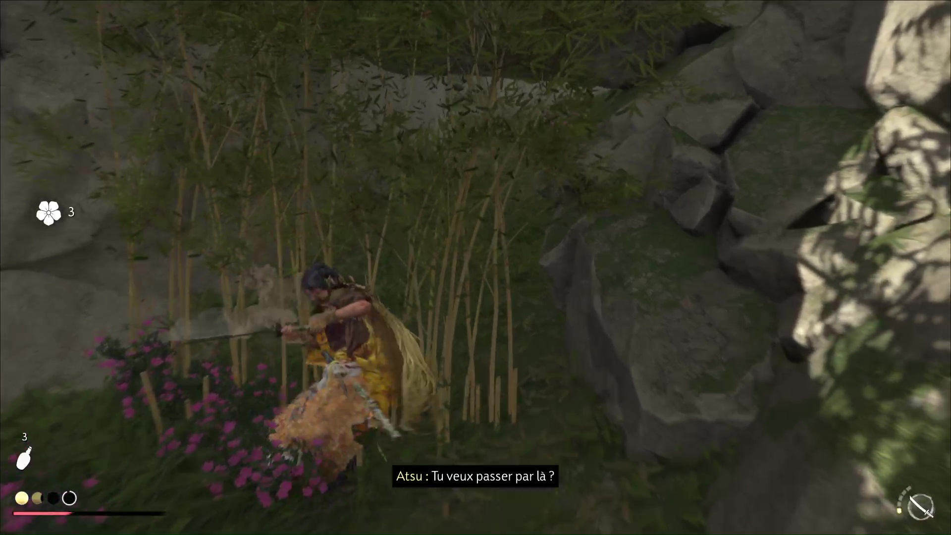 Vous arriverez ensuite devant une petite barrière de bambous. Coupez-la puis continuez votre ascension jusqu’à atteindre le sanctuaire d’Inari au milieu de fleurs roses. Priez pour obtenir le Charme de détermination de l’assassin.