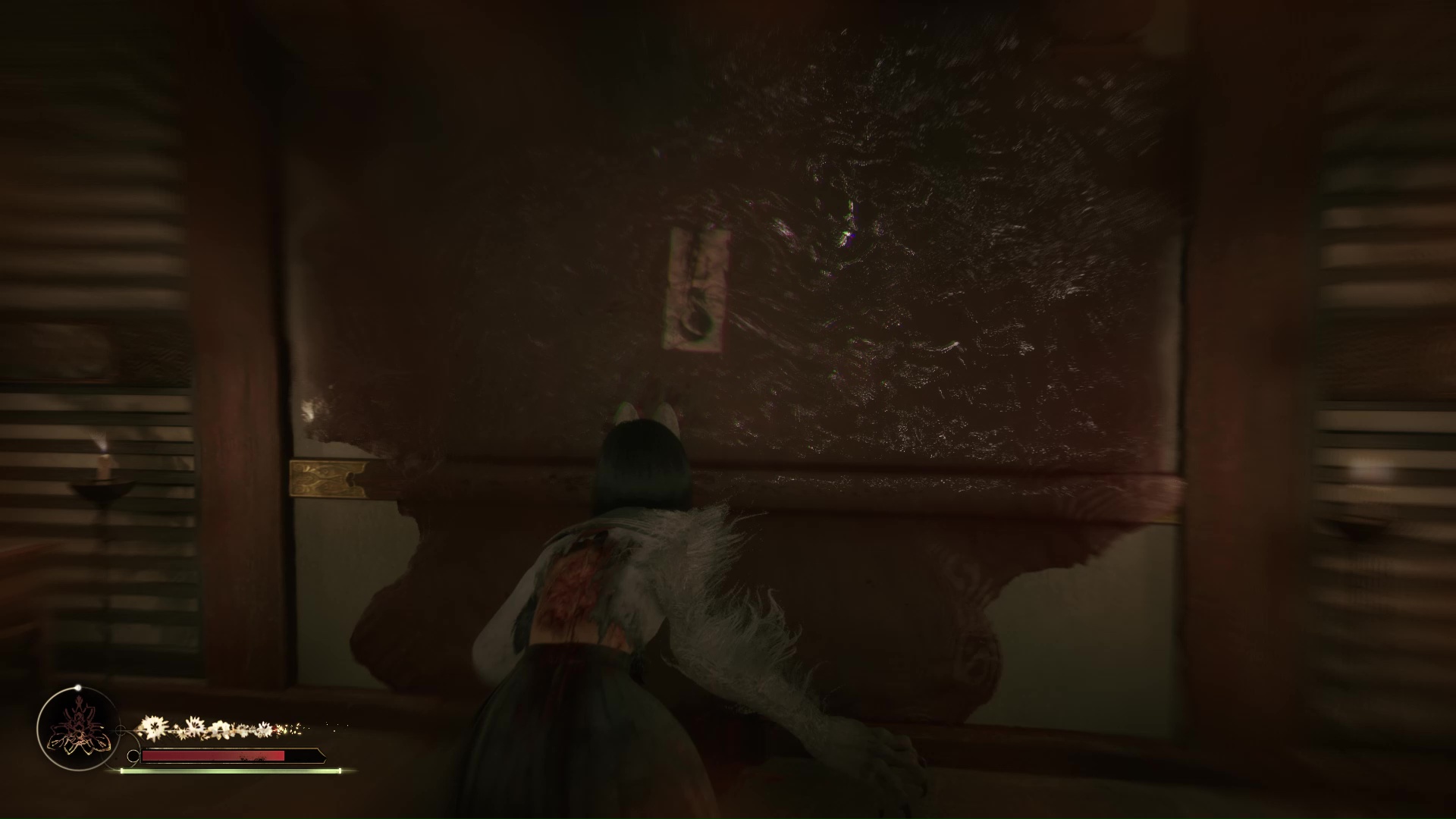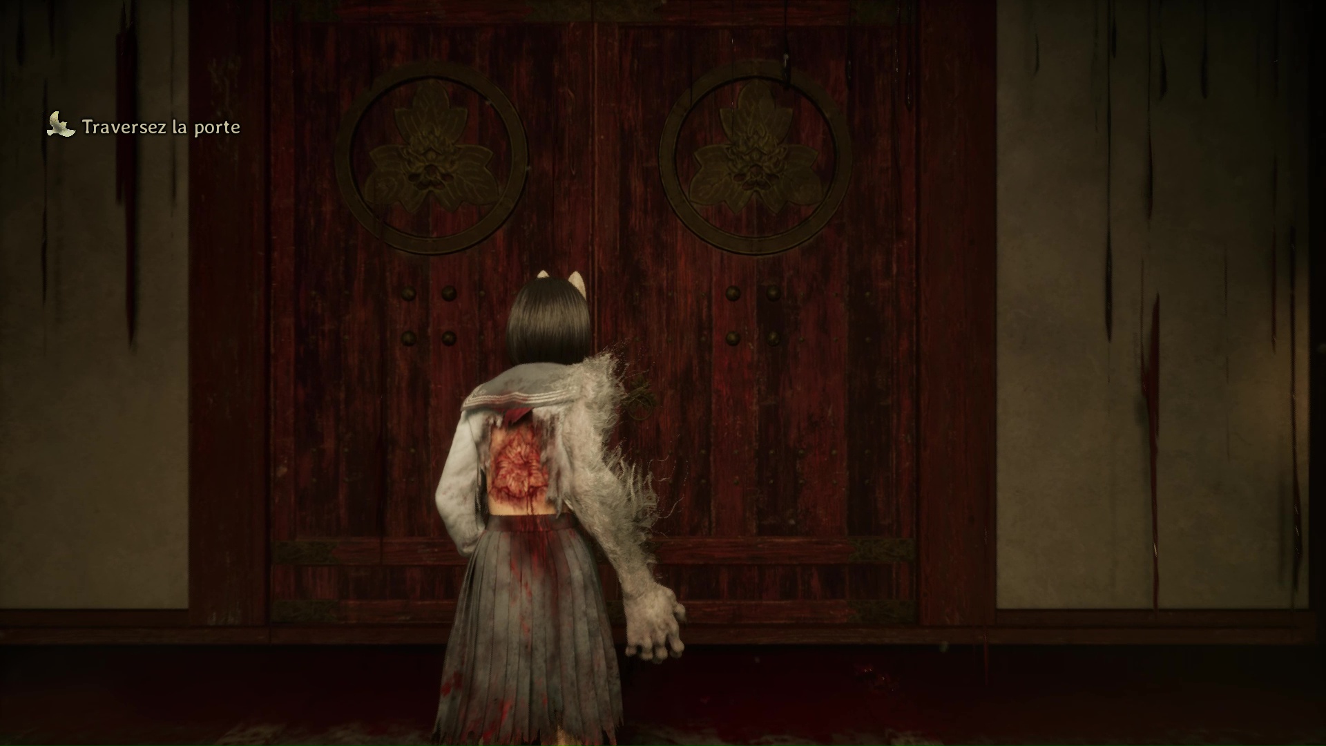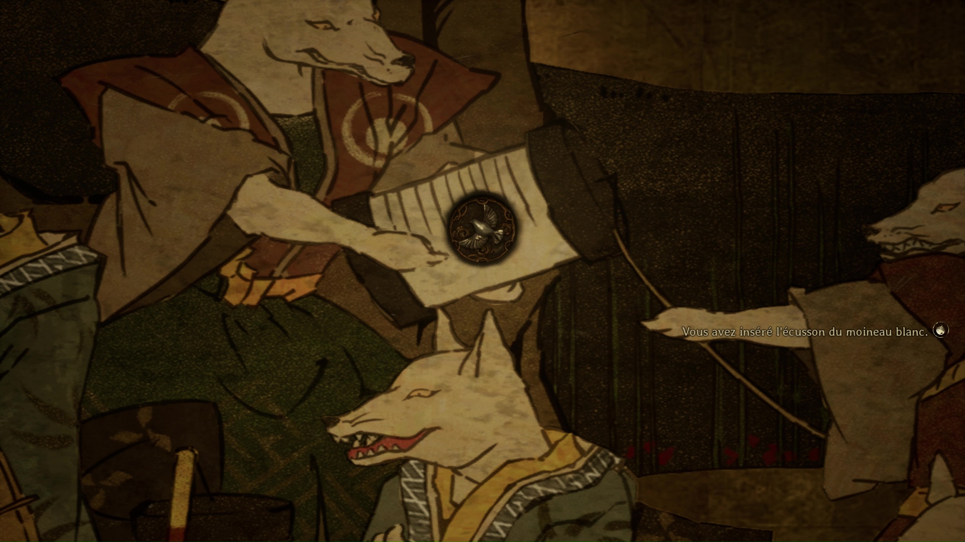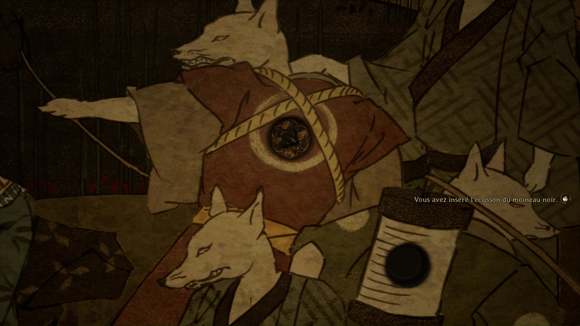 Dans cette nouvelle pièce, ramassez la Lettre d’une mère stricte (idem trophée famille Tsuneki) puis faites apparaître la statue de renard sur la flaque de sang à gauche de la pièce. Retirez la pointe sur son cou et suivez son regard pour entrer dans la pièce au fond de la salle. Ici, vous devrez éliminer de nouveaux monstres et aussi utiliser votre masque pour ouvrir un mur à gauche et tuer un nouveau monstre. Enfin, allez récupérer l’Écusson de moineau blanc dans le coffre avant de quitter la salle et de revenir près de la fresque.