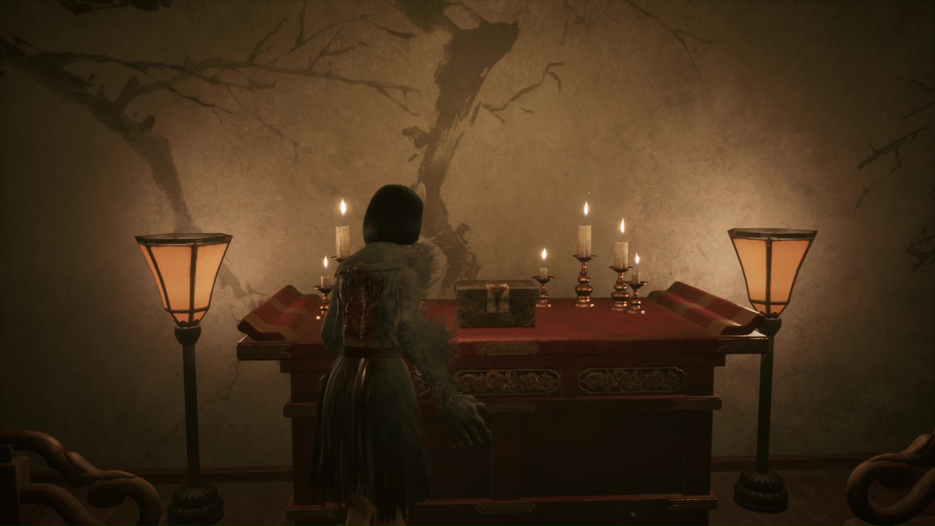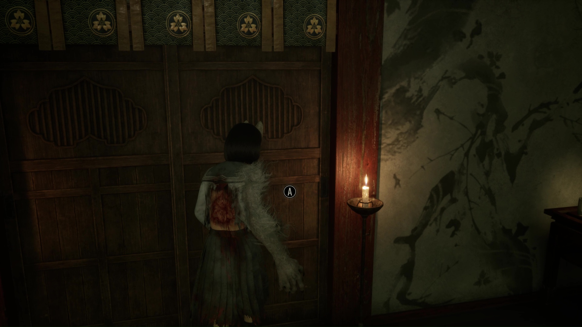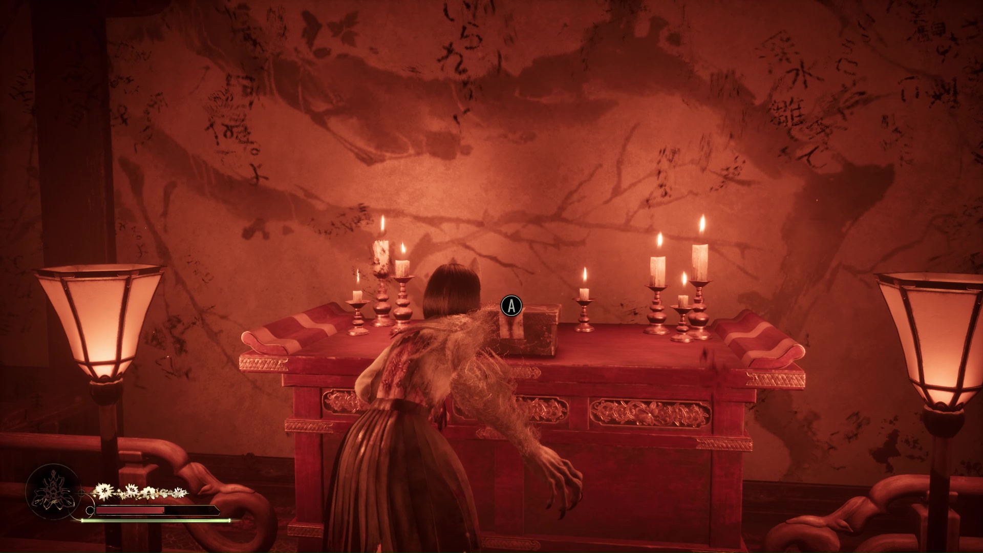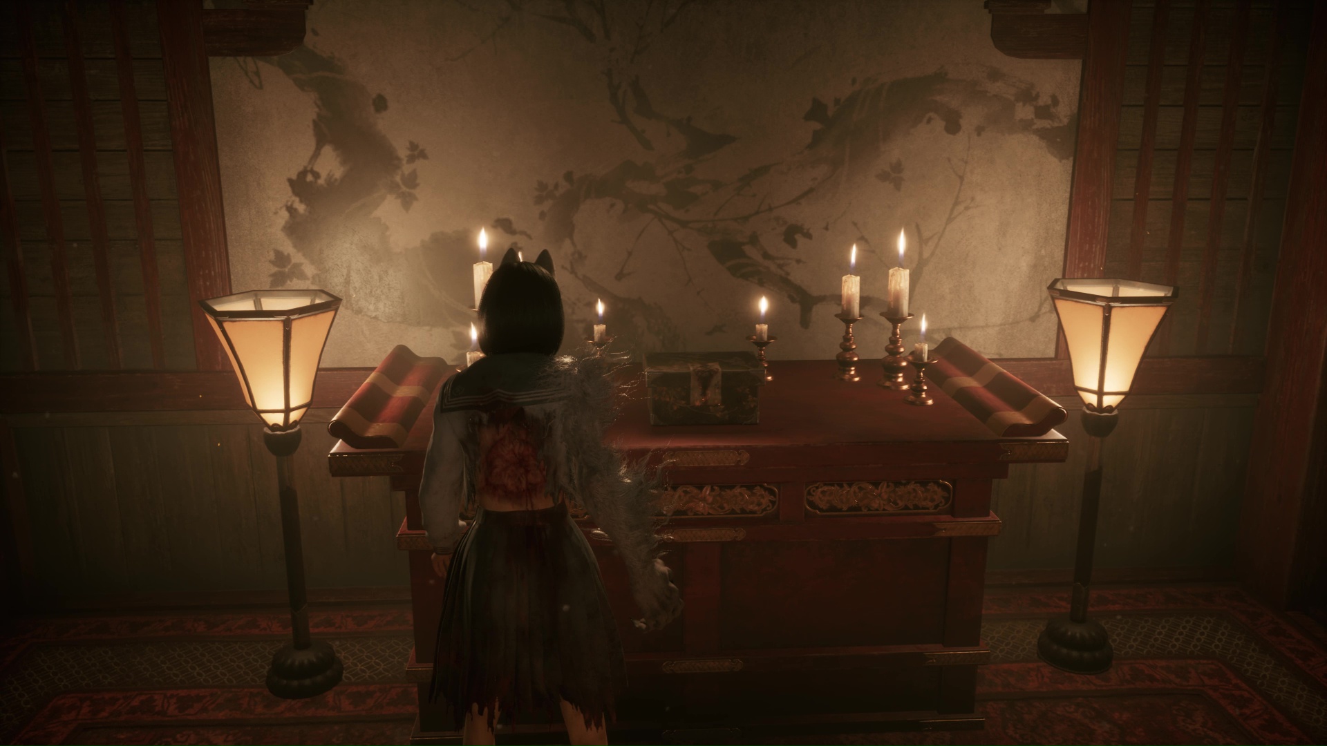 Dans cette nouvelle pièce, ramassez la Lettre d’une mère stricte (idem trophée famille Tsuneki) puis faites apparaître la statue de renard sur la flaque de sang à gauche de la pièce. Retirez la pointe sur son cou et suivez son regard pour entrer dans la pièce au fond de la salle. Ici, vous devrez éliminer de nouveaux monstres et aussi utiliser votre masque pour ouvrir un mur à gauche et tuer un nouveau monstre. Enfin, allez récupérer l’Écusson de moineau blanc dans le coffre avant de quitter la salle et de revenir près de la fresque.
