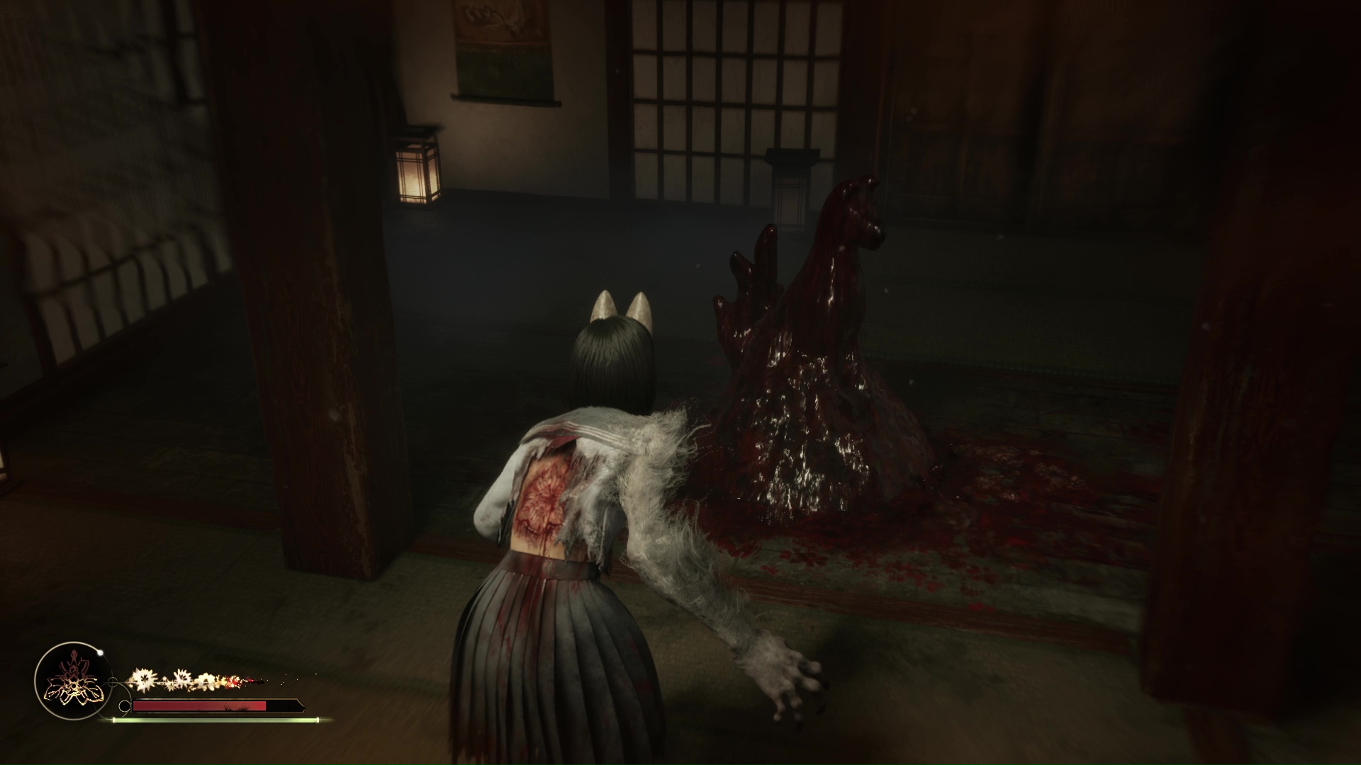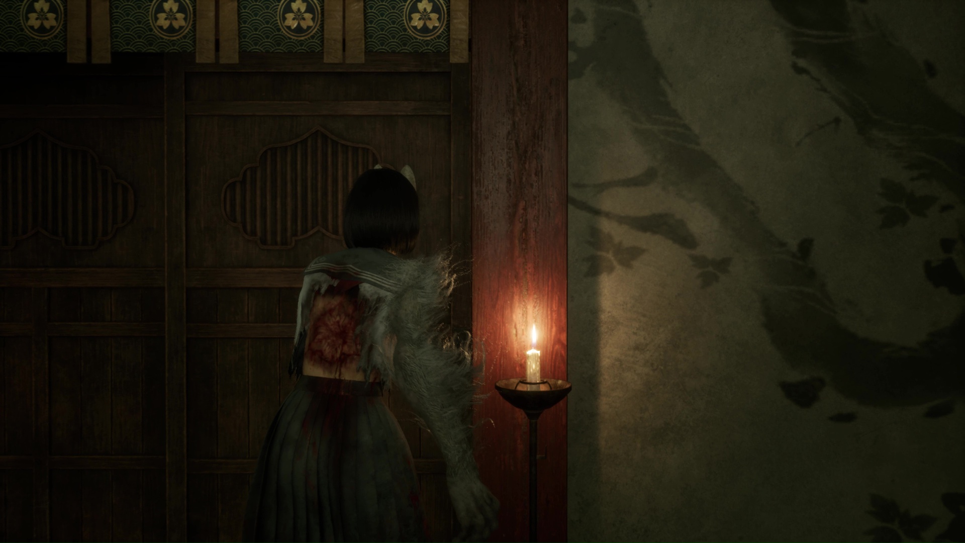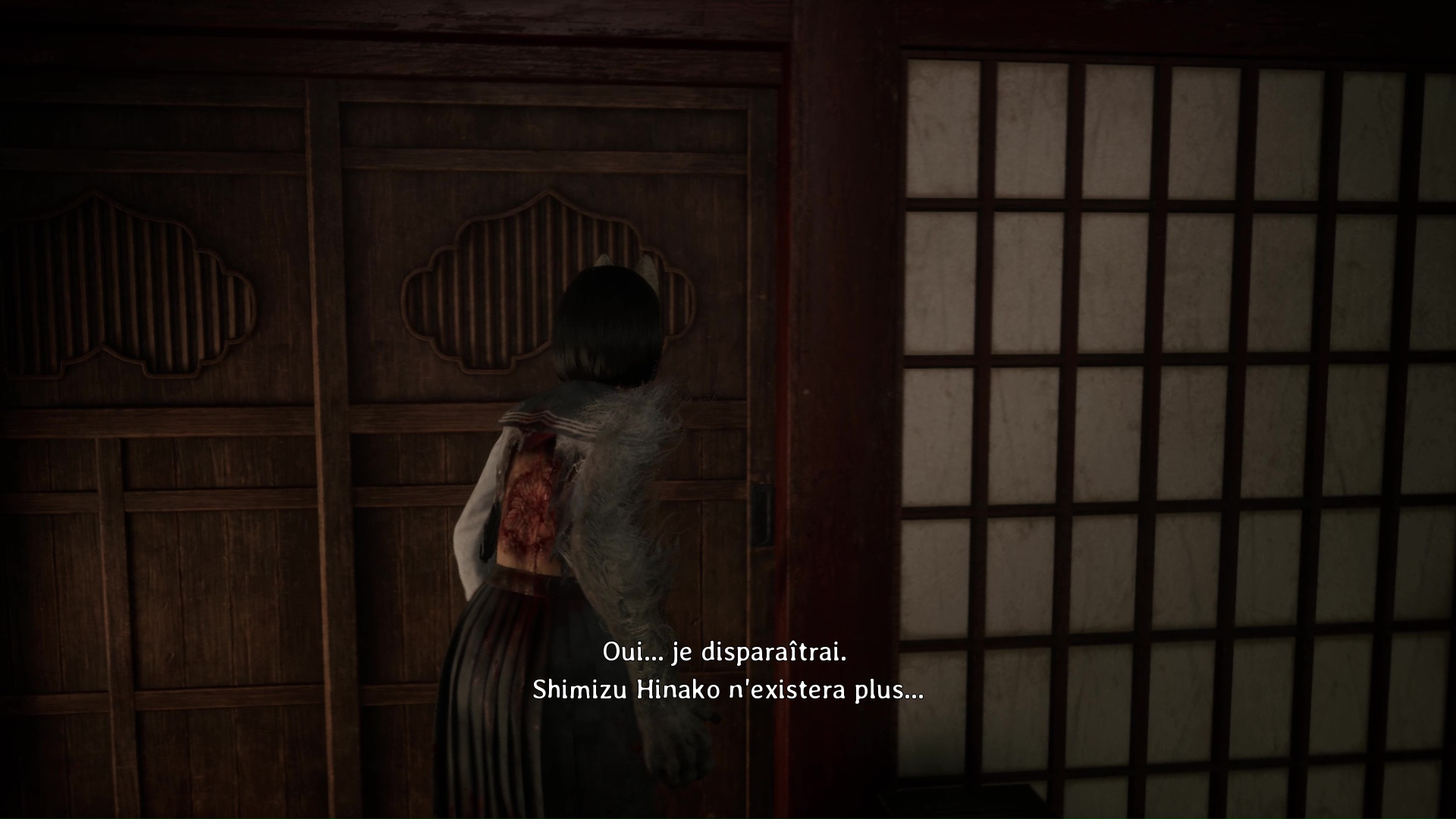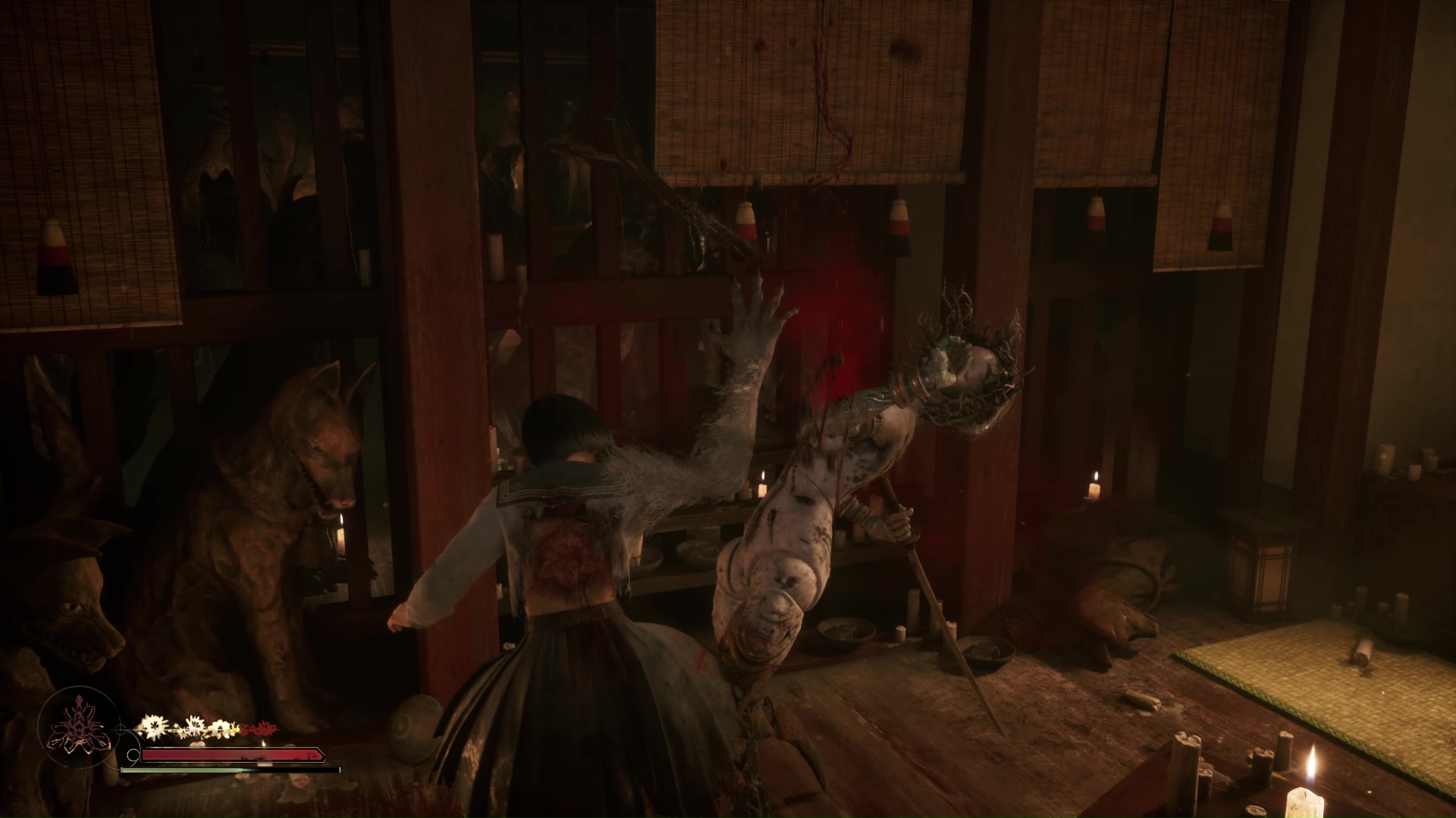 Dans cette nouvelle pièce, ramassez la Lettre d’une mère stricte (idem trophée famille Tsuneki) puis faites apparaître la statue de renard sur la flaque de sang à gauche de la pièce. Retirez la pointe sur son cou et suivez son regard pour entrer dans la pièce au fond de la salle. Ici, vous devrez éliminer de nouveaux monstres et aussi utiliser votre masque pour ouvrir un mur à gauche et tuer un nouveau monstre. Enfin, allez récupérer l’Écusson de moineau blanc dans le coffre avant de quitter la salle et de revenir près de la fresque.