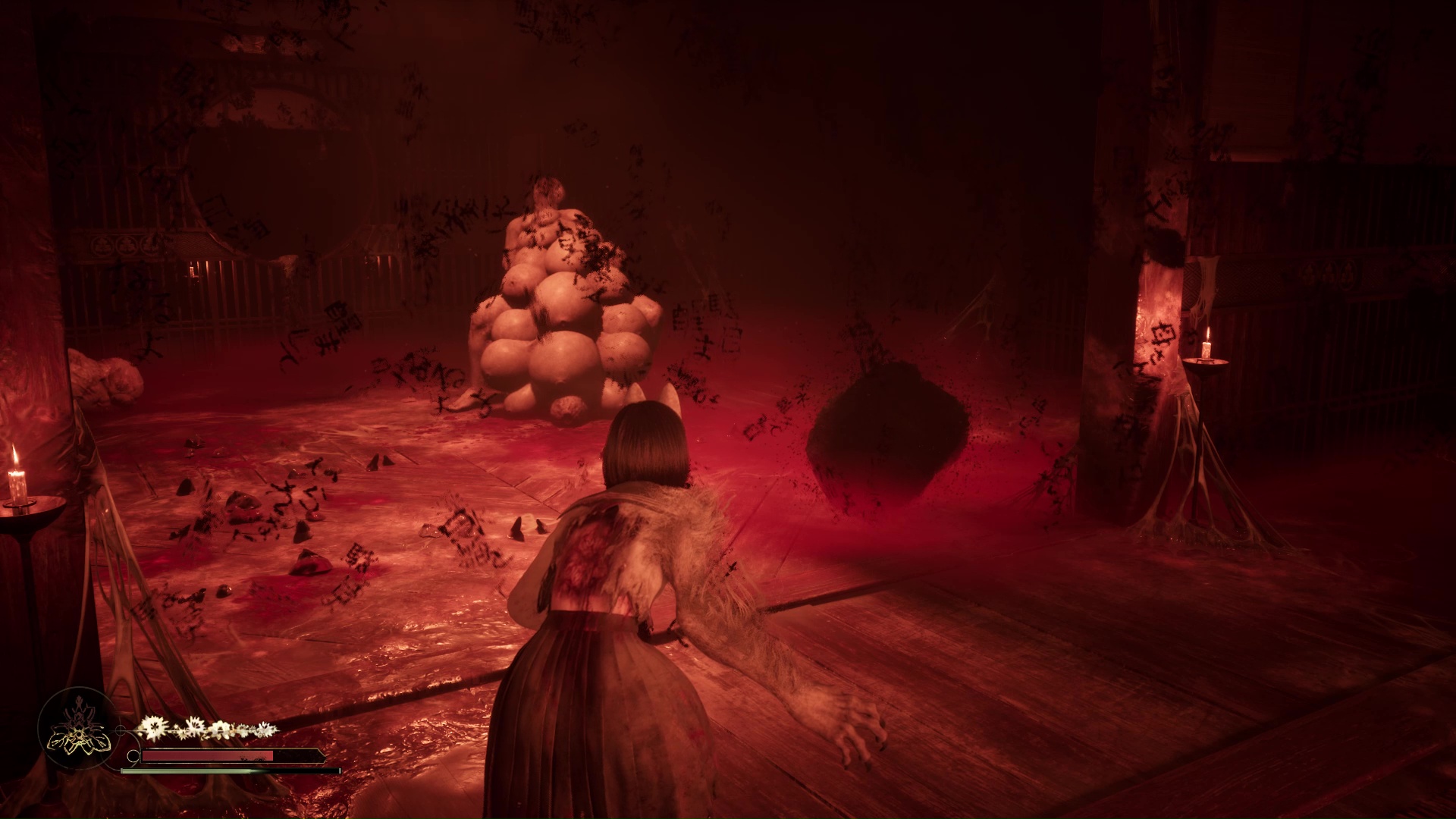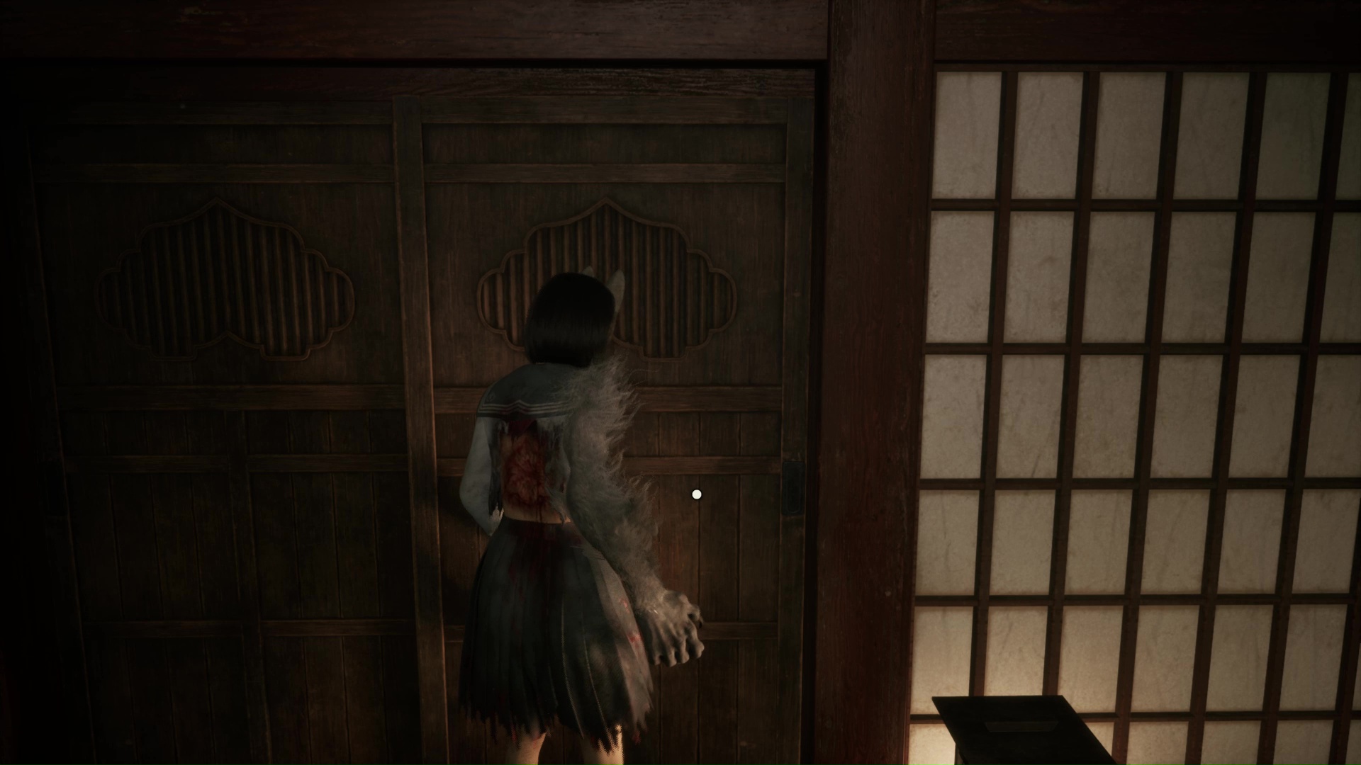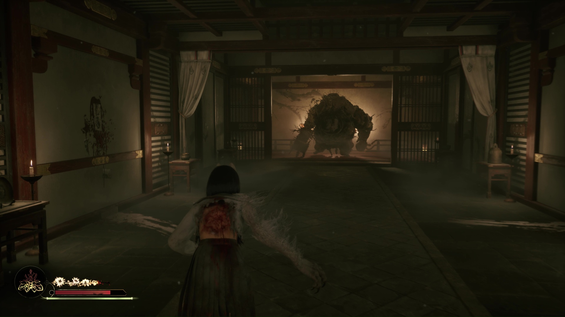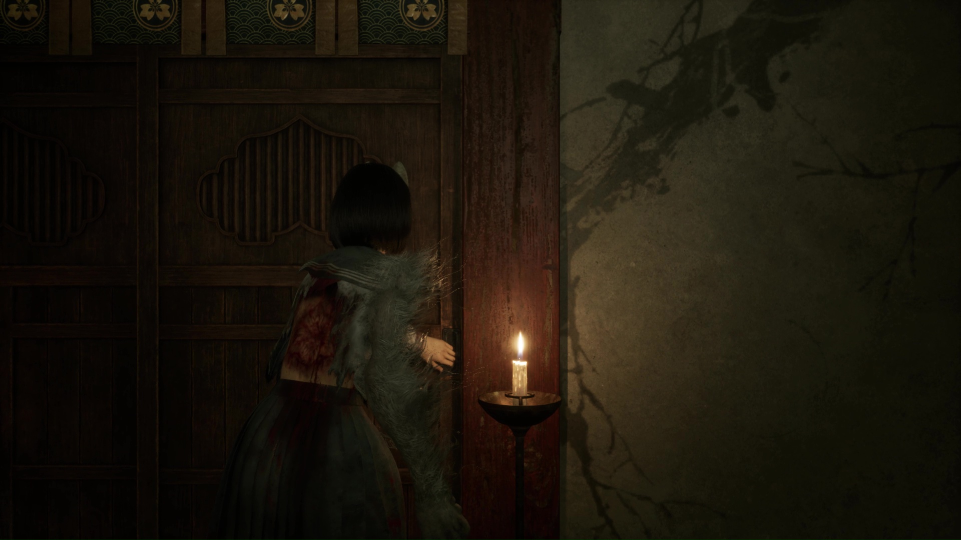 Dans cette nouvelle pièce, ramassez la Lettre d’une mère stricte (idem trophée famille Tsuneki) puis faites apparaître la statue de renard sur la flaque de sang à gauche de la pièce. Retirez la pointe sur son cou et suivez son regard pour entrer dans la pièce au fond de la salle. Ici, vous devrez éliminer de nouveaux monstres et aussi utiliser votre masque pour ouvrir un mur à gauche et tuer un nouveau monstre. Enfin, allez récupérer l’Écusson de moineau blanc dans le coffre avant de quitter la salle et de revenir près de la fresque.