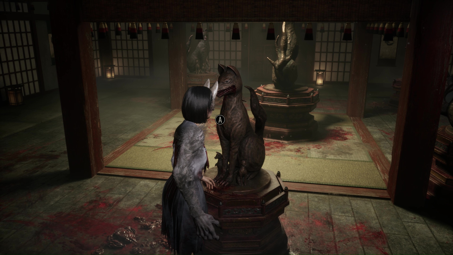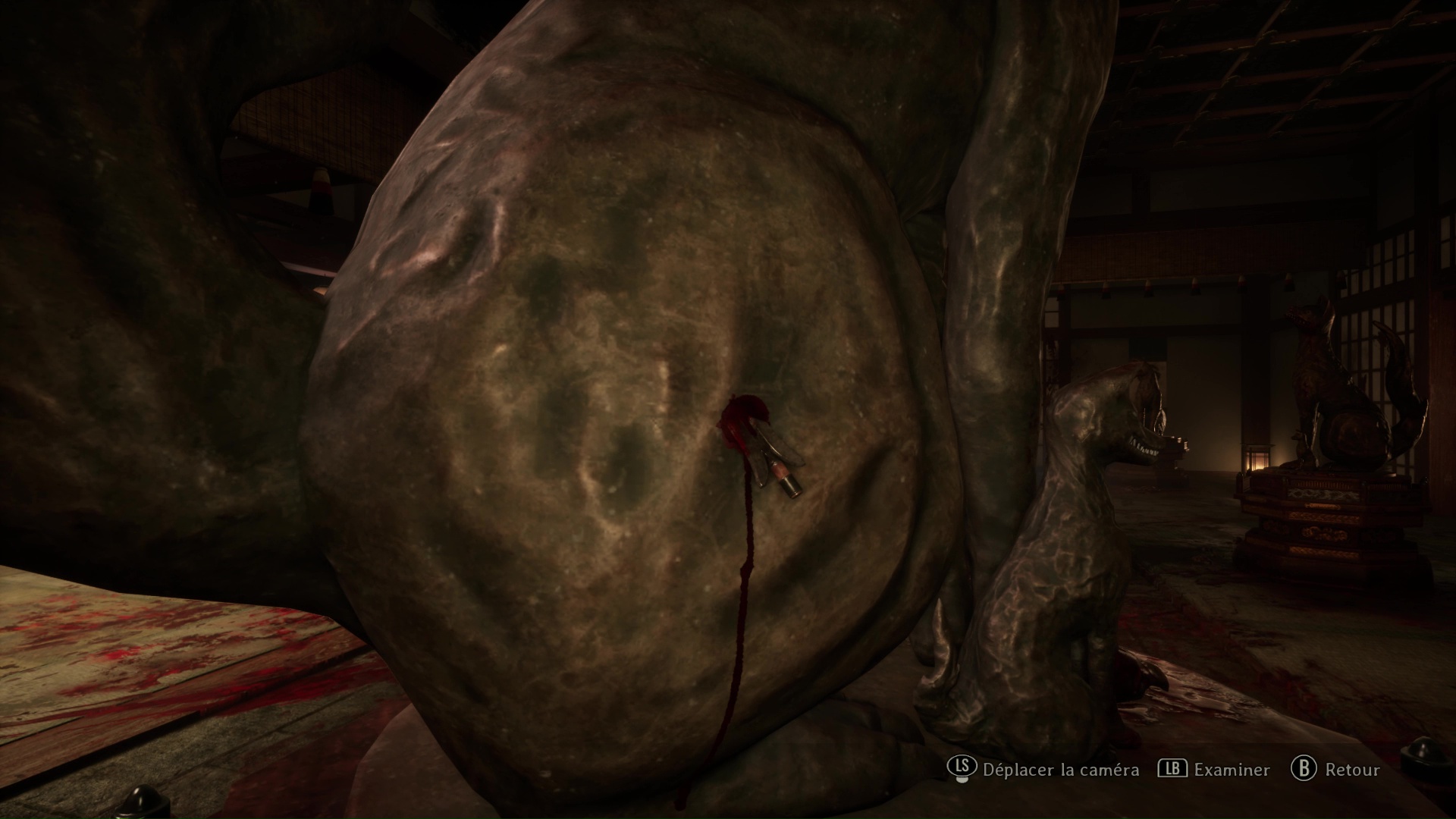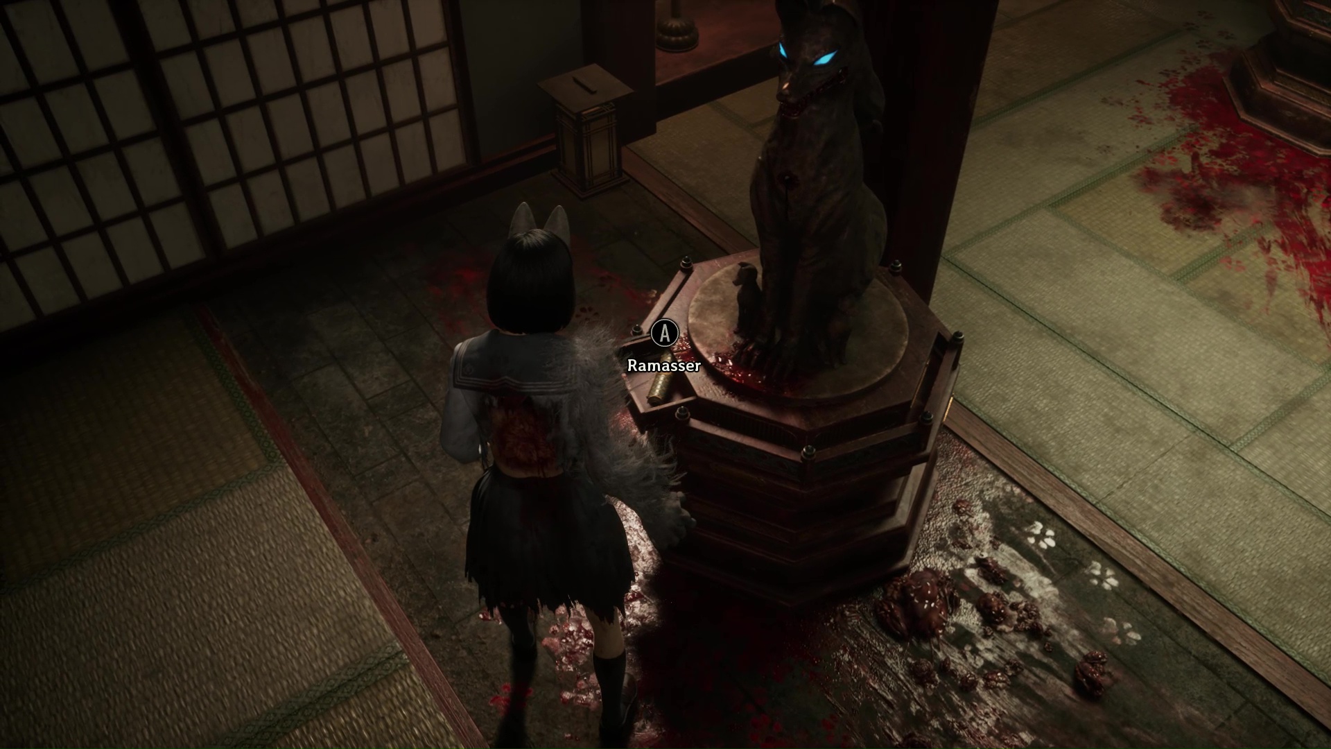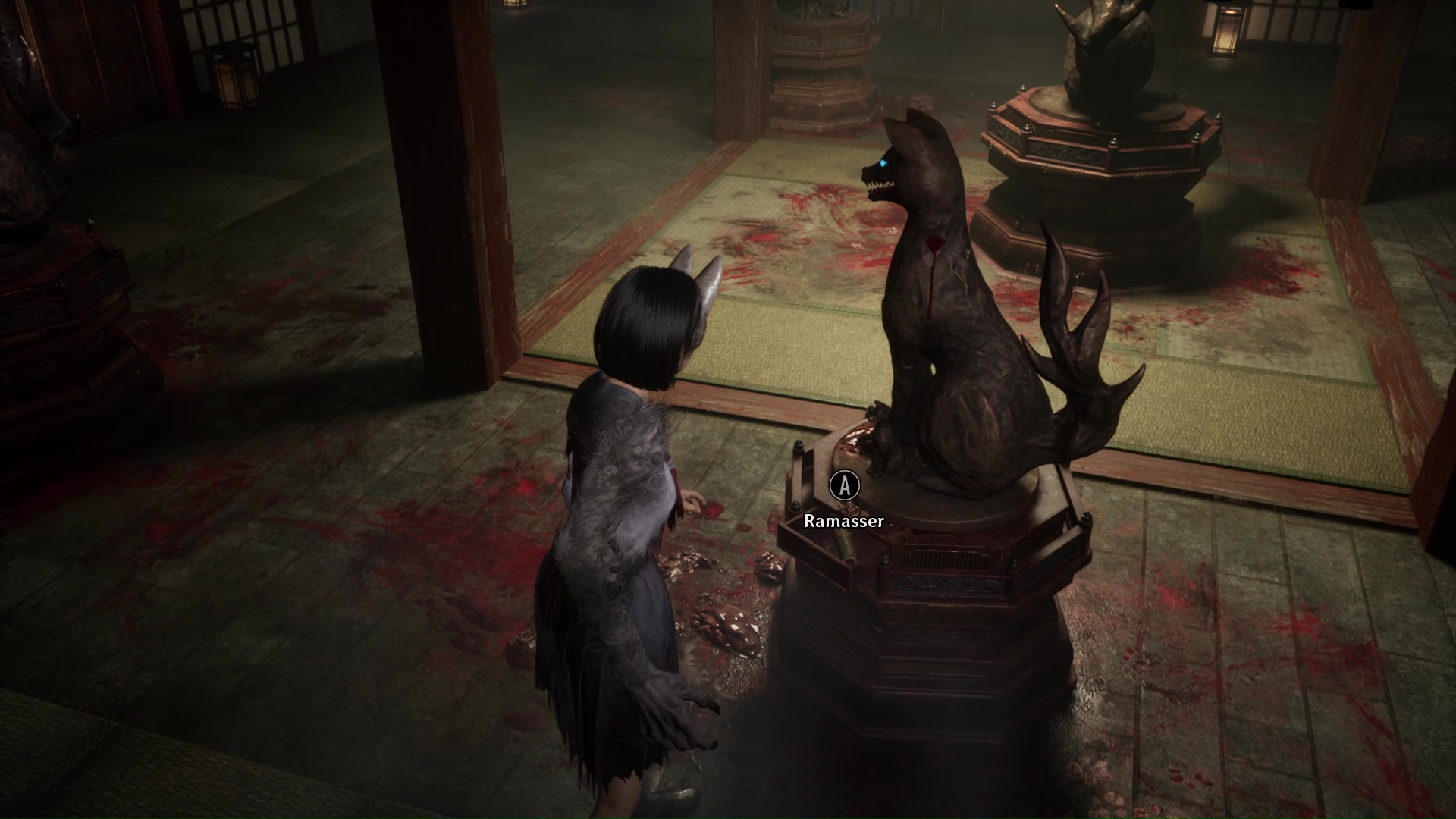 Pour poursuivre, franchissez la porte se situant tout près de l’Hokora, à l’opposé de la fresque. Ici, vous trouverez une nouvelle Note d’une femme de chambre, puis changez de pièce en allant vers la droite. Ici, vous devrez surtout utiliser votre masque de renard pour dévoiler ce qui se trouve au niveau des tâches de sang sur le sol : une statue de renard. Interagissez avec et retirez la pointe pour trouver la bonne direction, c’est-à-dire à droite vers là où regarde le renard.