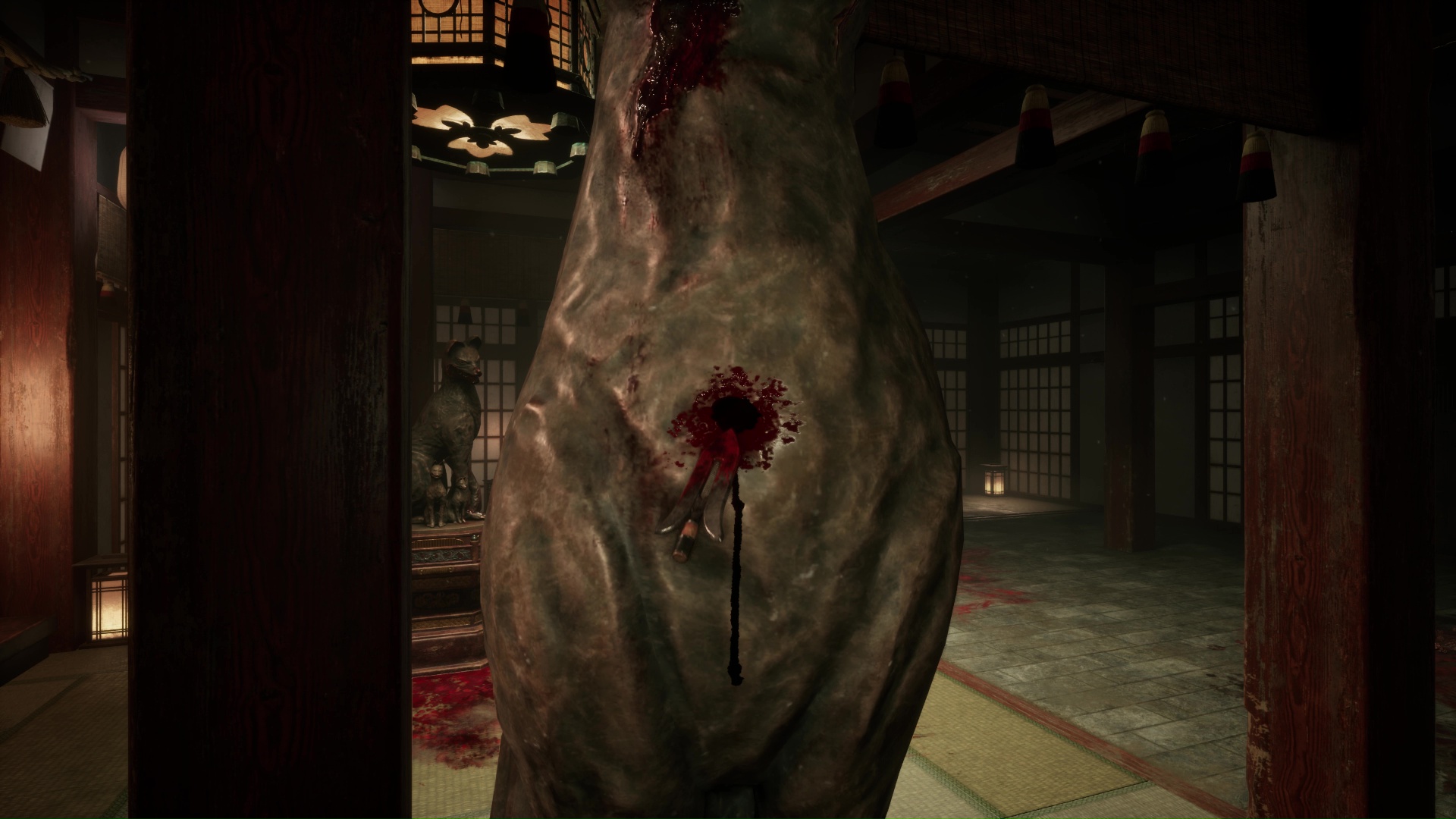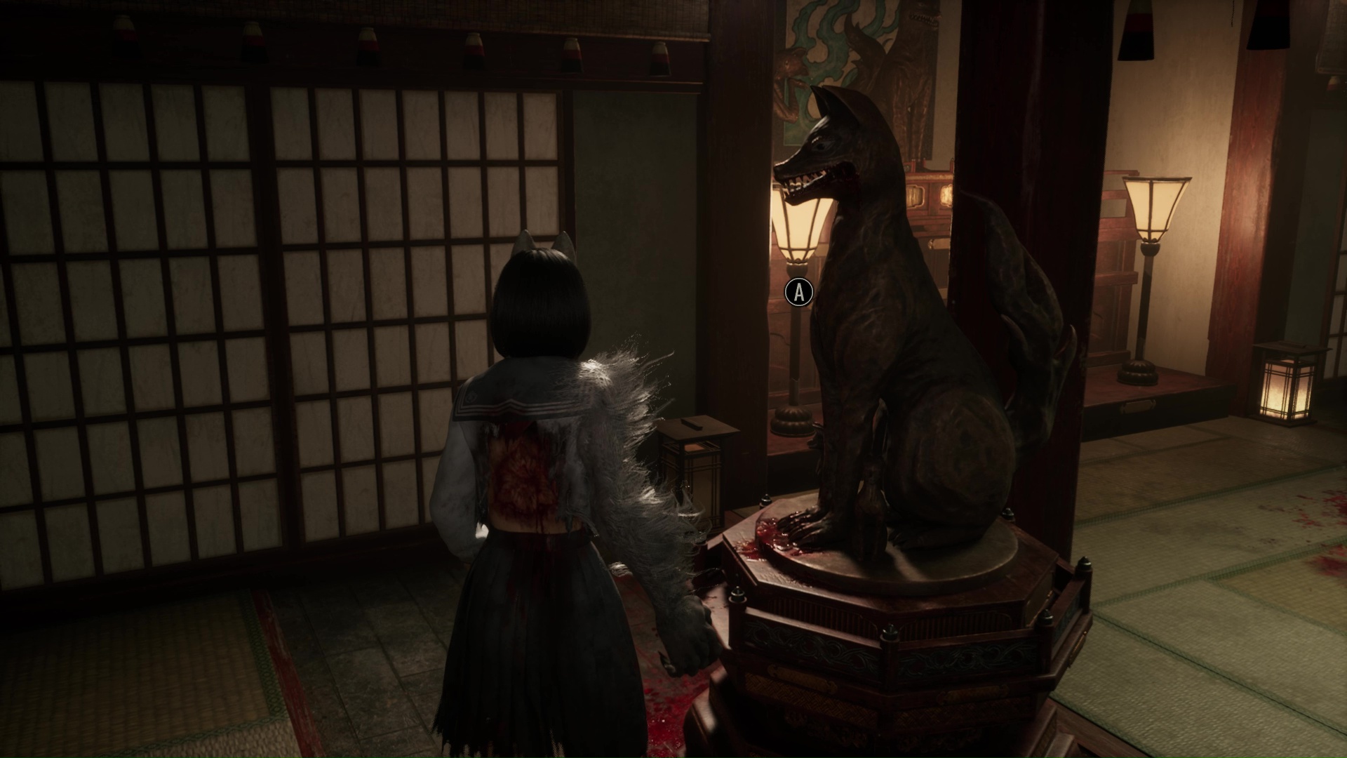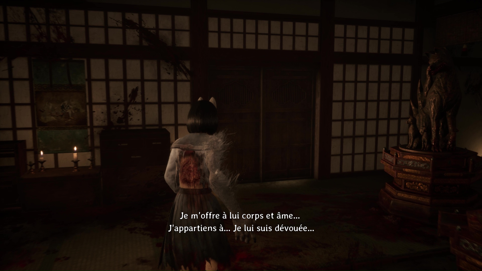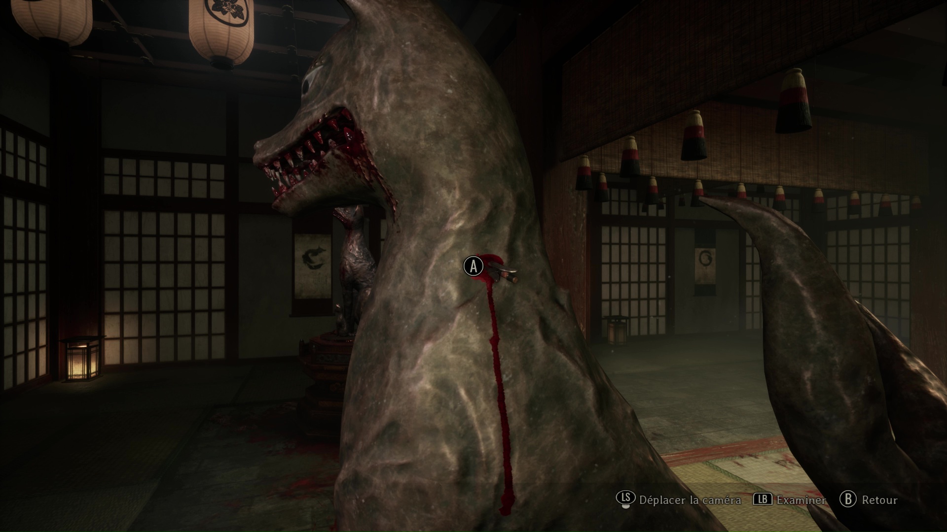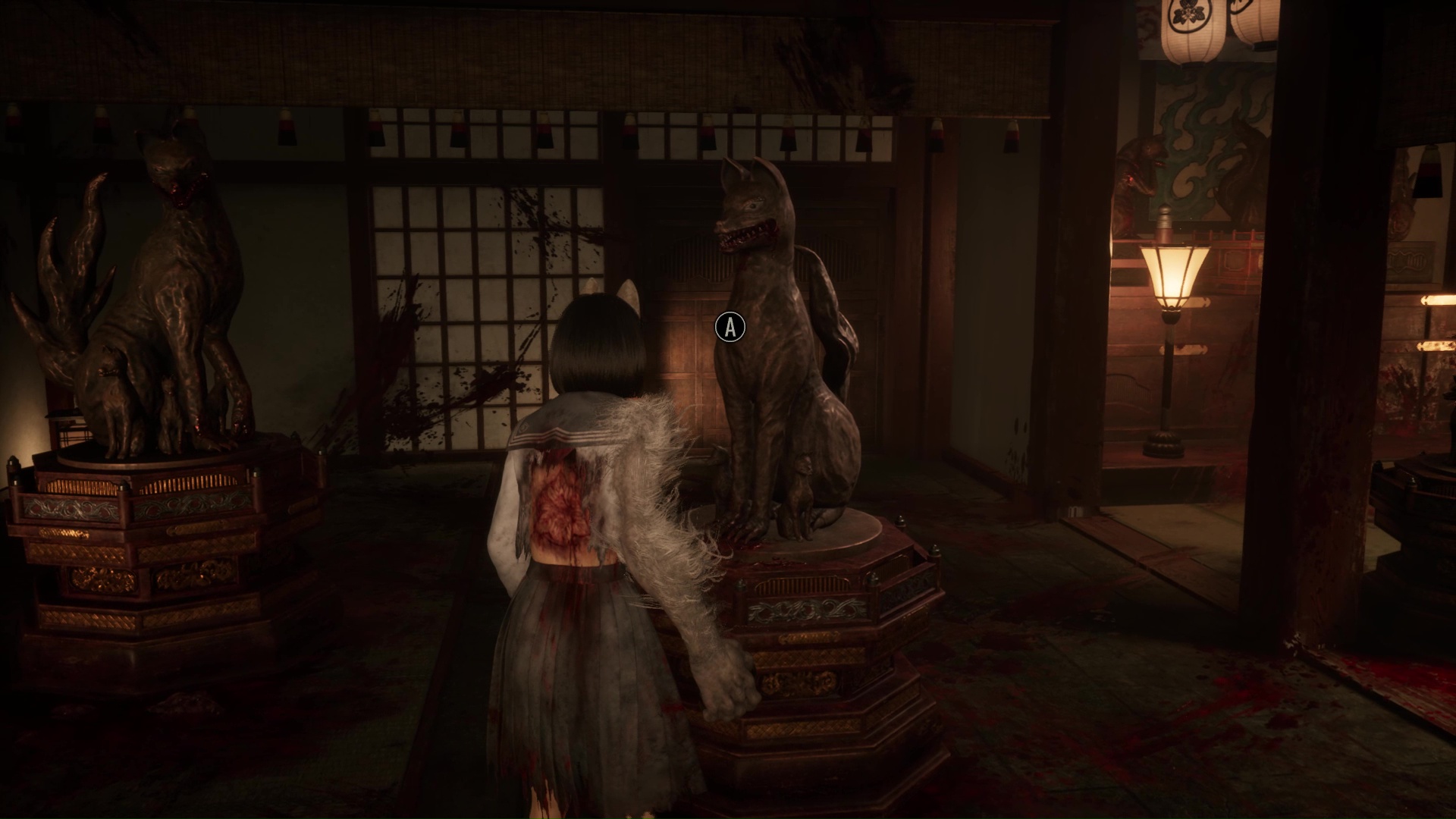 Pour poursuivre, franchissez la porte se situant tout près de l’Hokora, à l’opposé de la fresque. Ici, vous trouverez une nouvelle Note d’une femme de chambre, puis changez de pièce en allant vers la droite. Ici, vous devrez surtout utiliser votre masque de renard pour dévoiler ce qui se trouve au niveau des tâches de sang sur le sol : une statue de renard. Interagissez avec et retirez la pointe pour trouver la bonne direction, c’est-à-dire à droite vers là où regarde le renard.