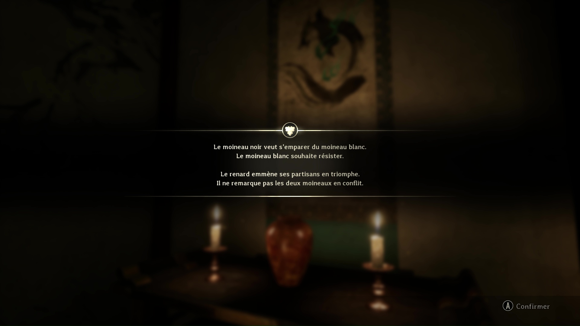 Il vous faudra donc acquérir trois écussons à placer au bon endroit sur la fresque : l’écusson du moineau noir, celui du moineau blanc et celui du masque de renard. Prenez garde, il existe un trophée si vous réussissez toute cette énigme sans vous tromper de porte. Suivez bien notre guide pour y parvenir, car vous ne disposez pas de plan pour y parvenir et décrocher le Trophée Futée comme un renard 🏆.