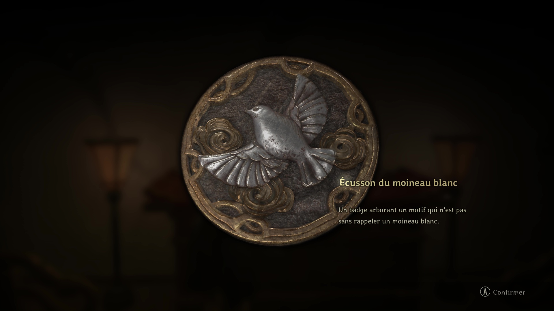 - Écusson de moineau blanc : lanterne en bas à gauche sous la maison