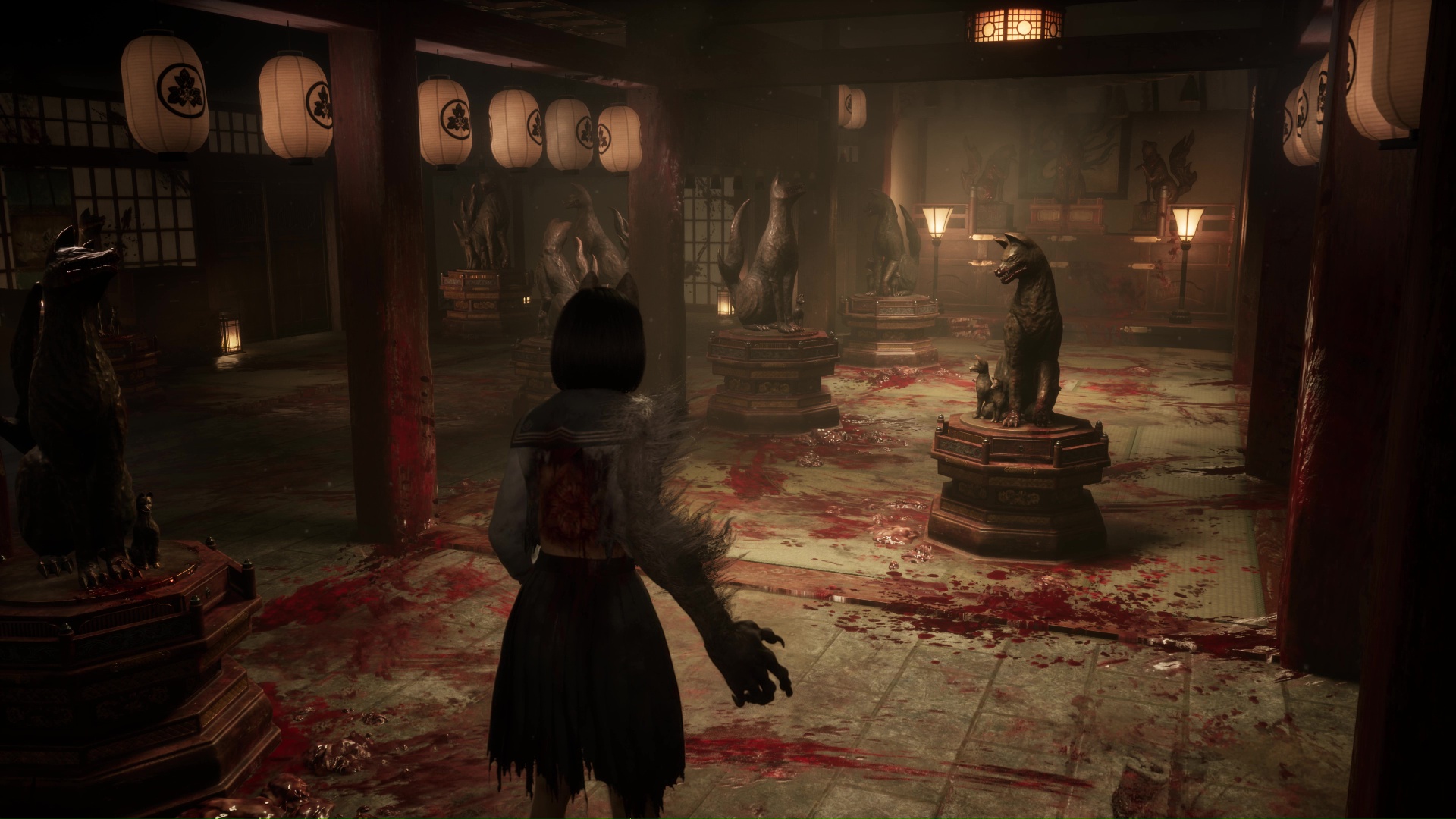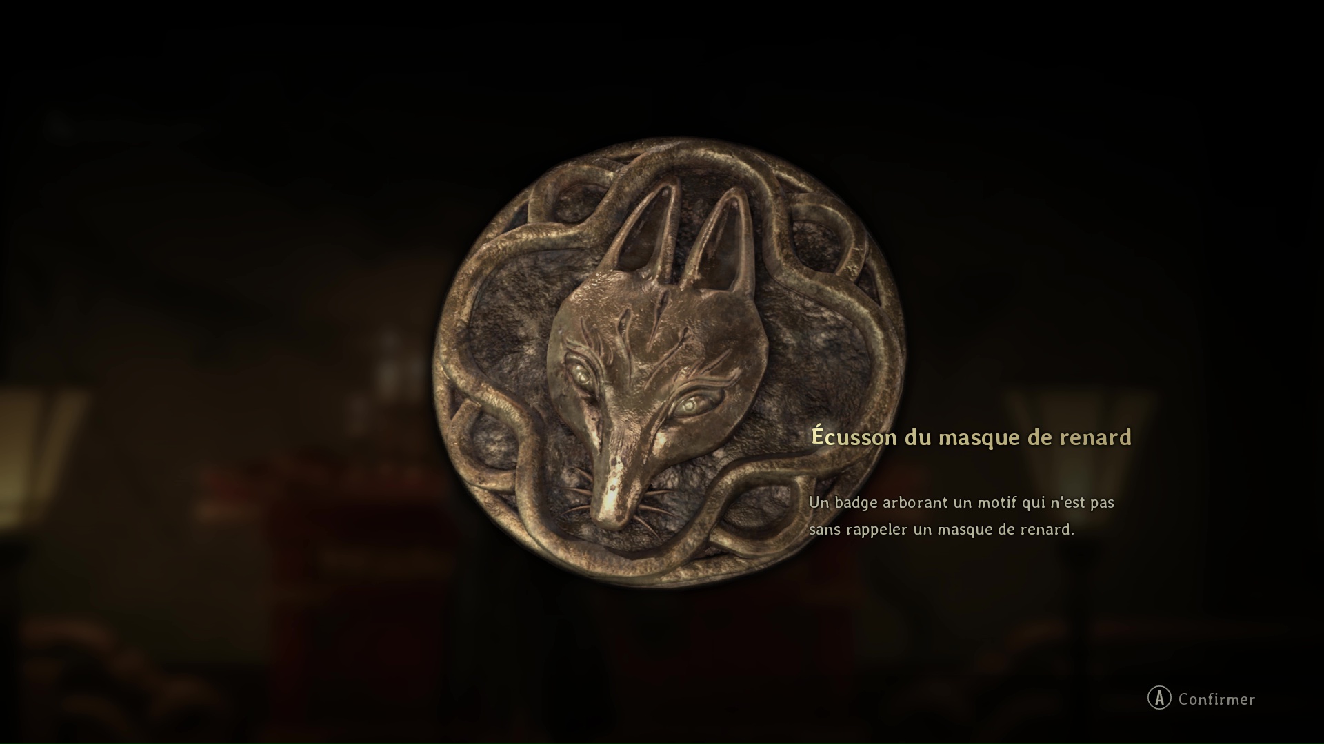 Allez dans la zone au nord-ouest de la pièce quand vous entrez pour faire apparaître une statue de renard et enlevez la pointe dans sa cuisse pour franchir ensuite la porte de gauche en suivant le regard du renard. Ici, vous trouverez une créature pondeuse à éliminer ainsi que des poupées et monstres hurlants. Après avoir banni tout le monde, interagissez avec le coffre pour déclencher une cinématique et obtenir l’Écusson du masque de renard. C’est ici que vous décrocherez le Trophée Futée comme un renard 🏆 si vous n’avez pas fait d’erreur de parcours, puis quittez la pièce.