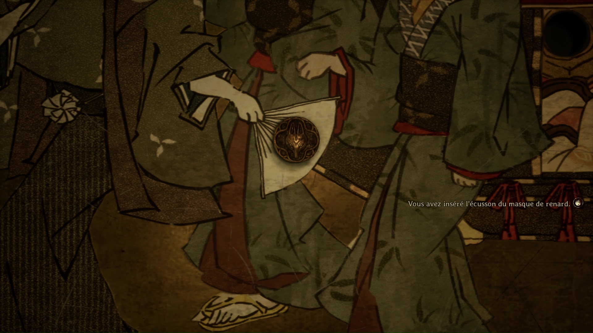 - Écusson de masque de renard : lanterne blanche en haut à gauche des éventails