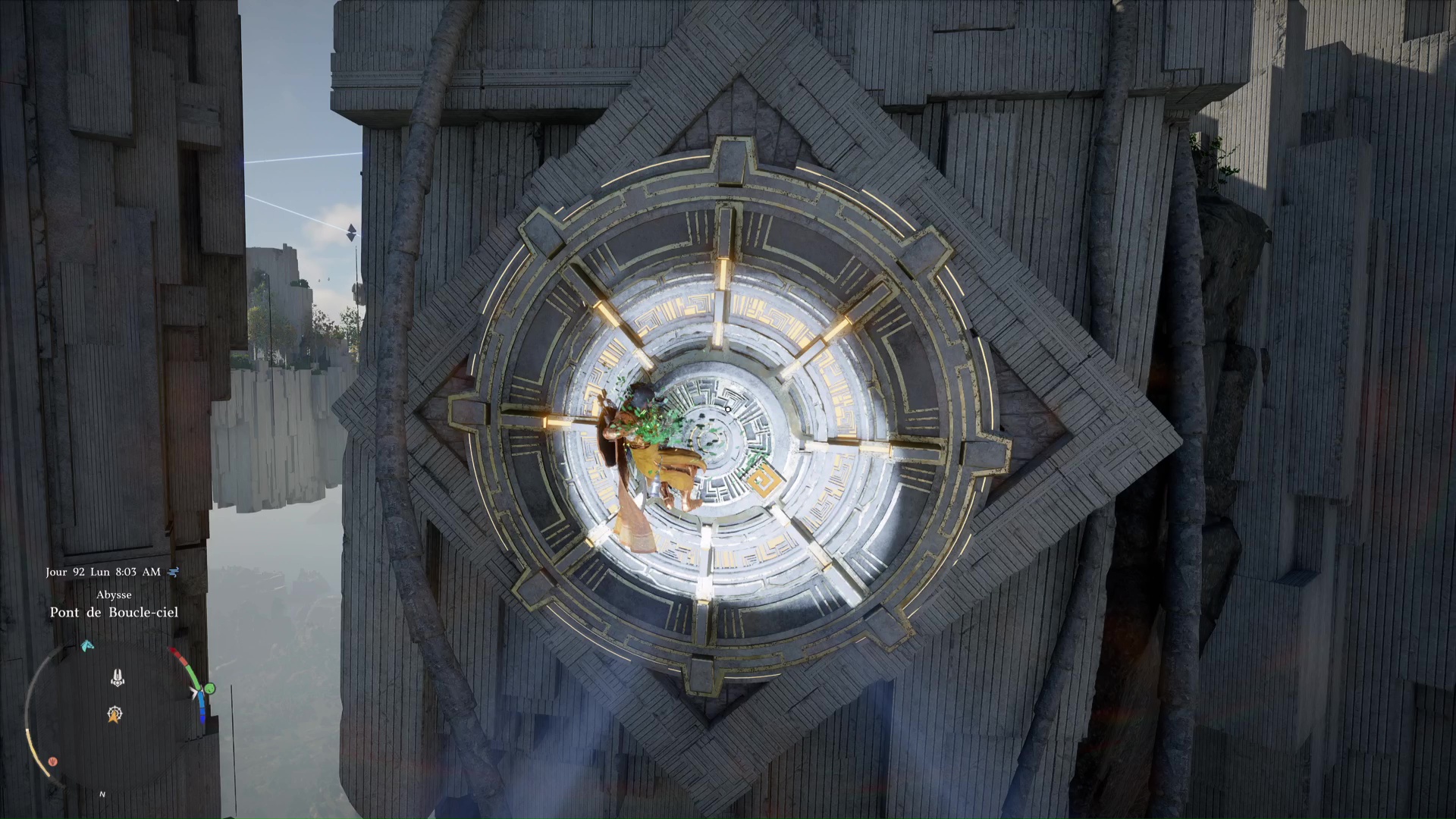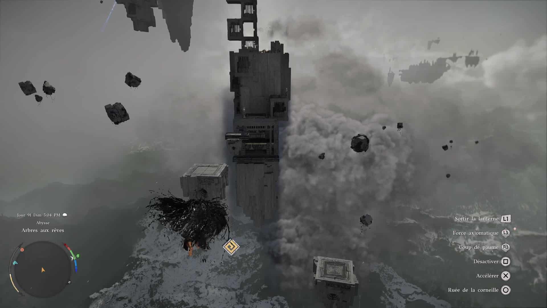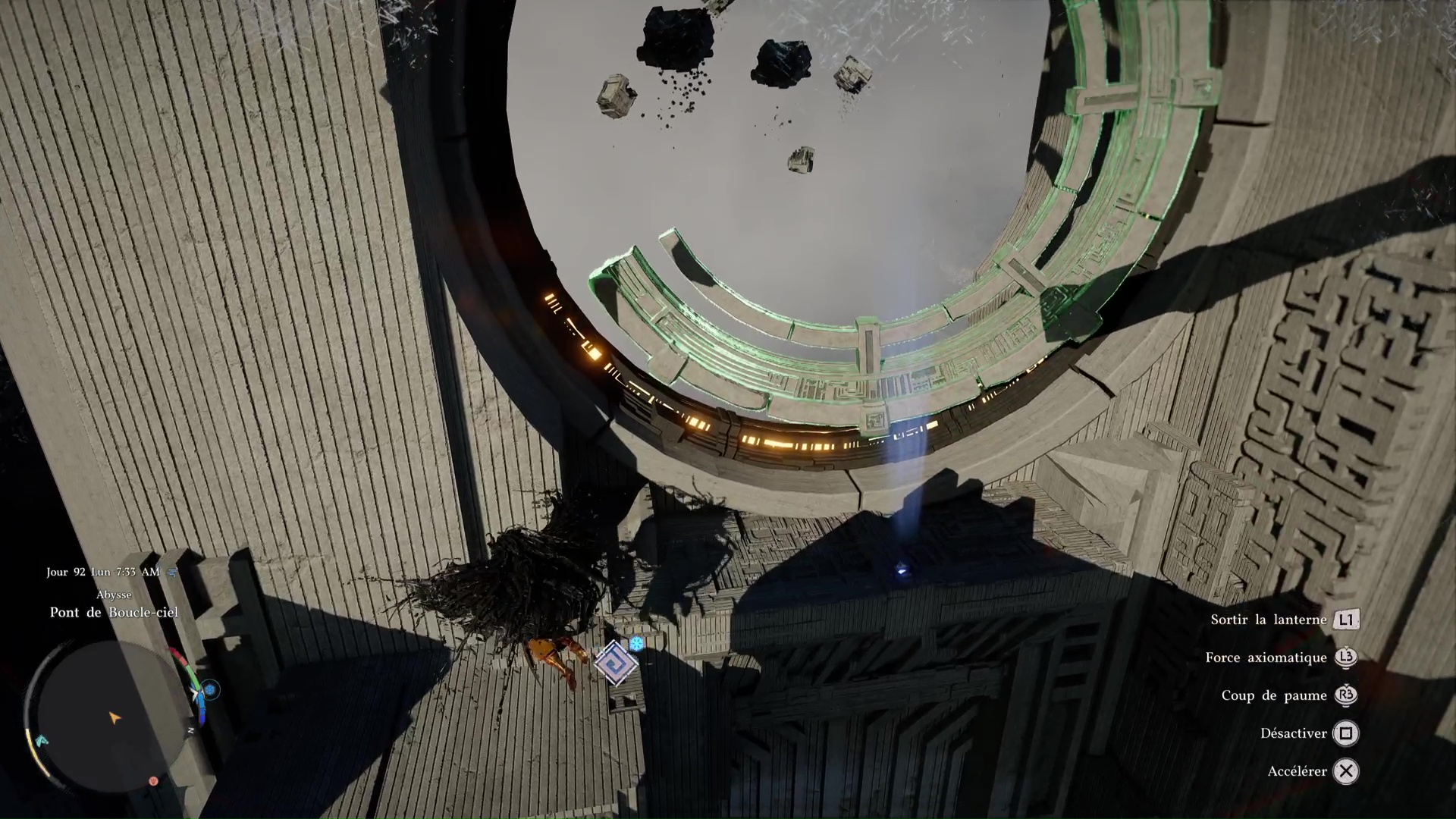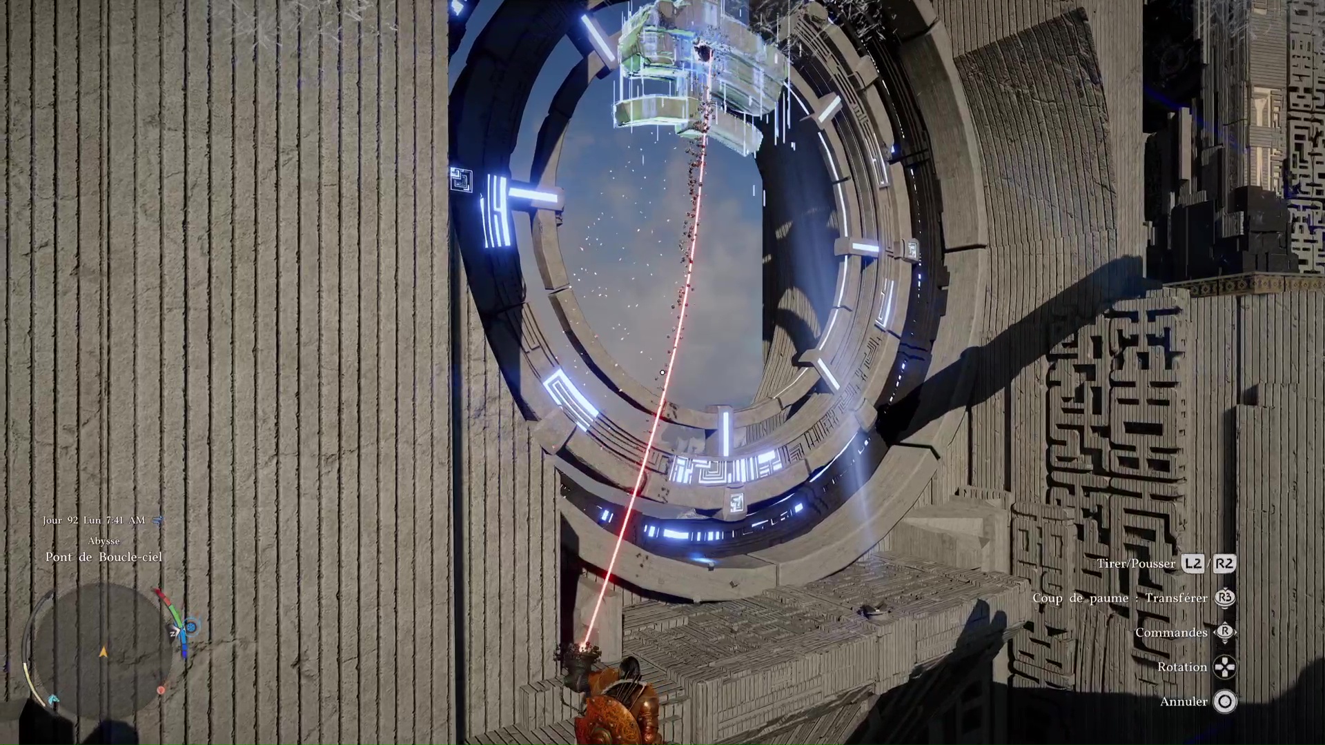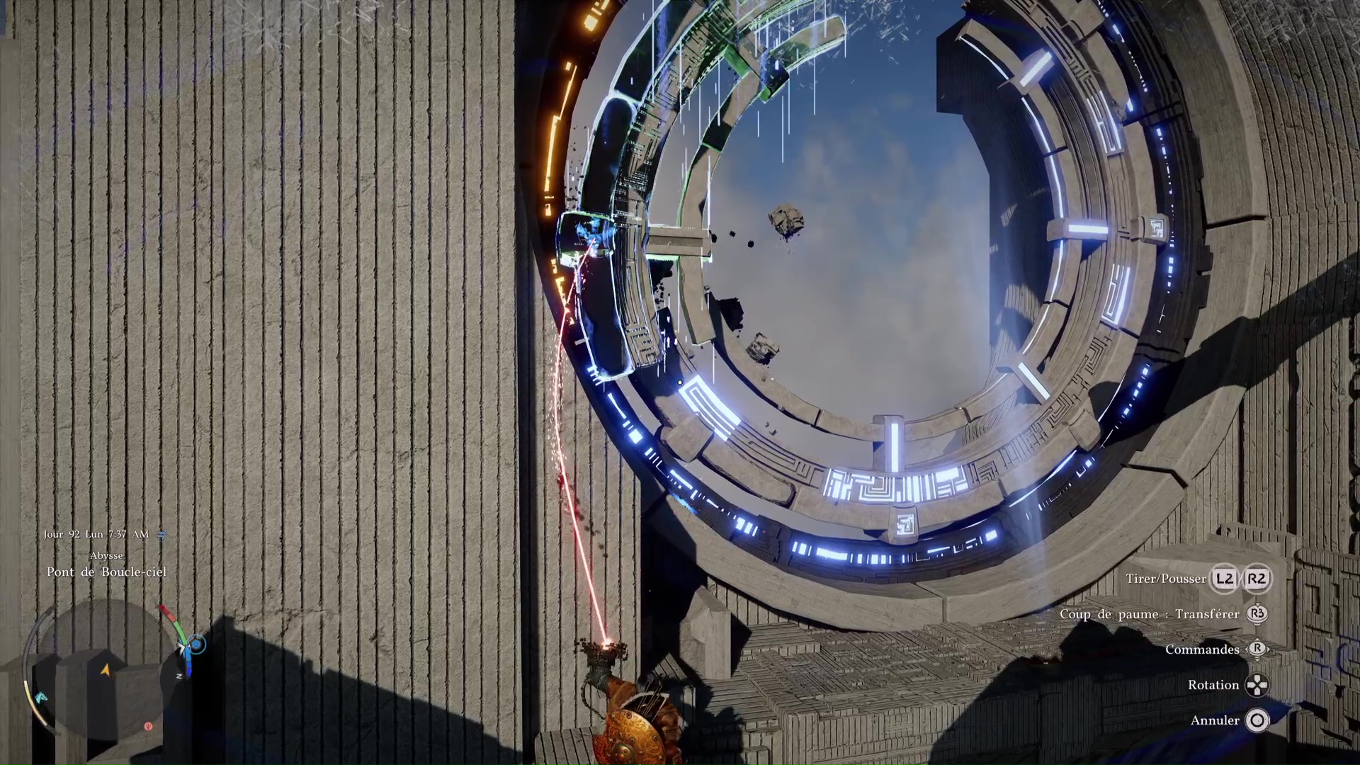 Planez jusqu’au mécanisme, grimpez dessus et, en son centre, réalisez un coup de paume pour l’activer tout en maintenant L2/LT. Le monolithe va se remettre en marche et vous donner accès à l’artefact abyssal de fin de parcours.