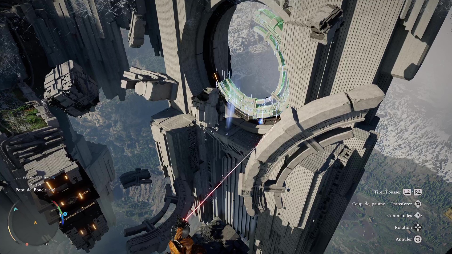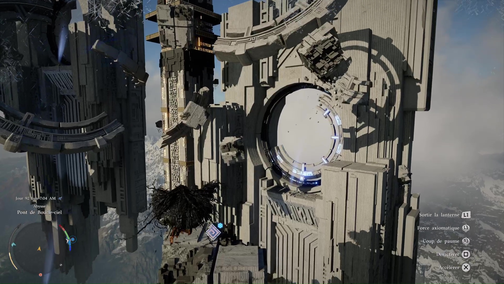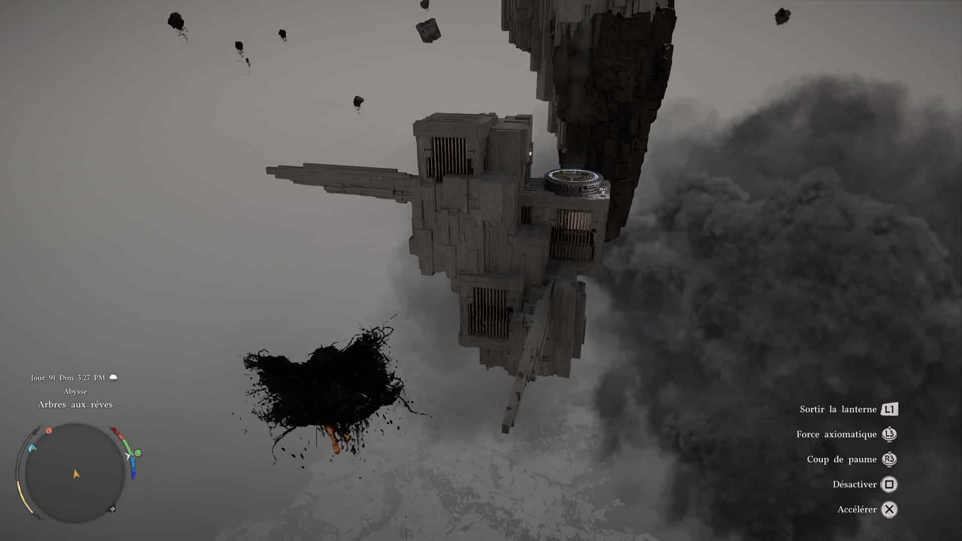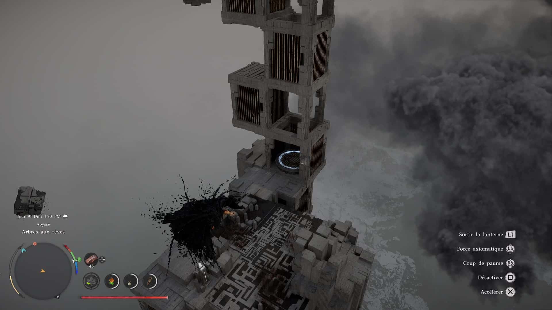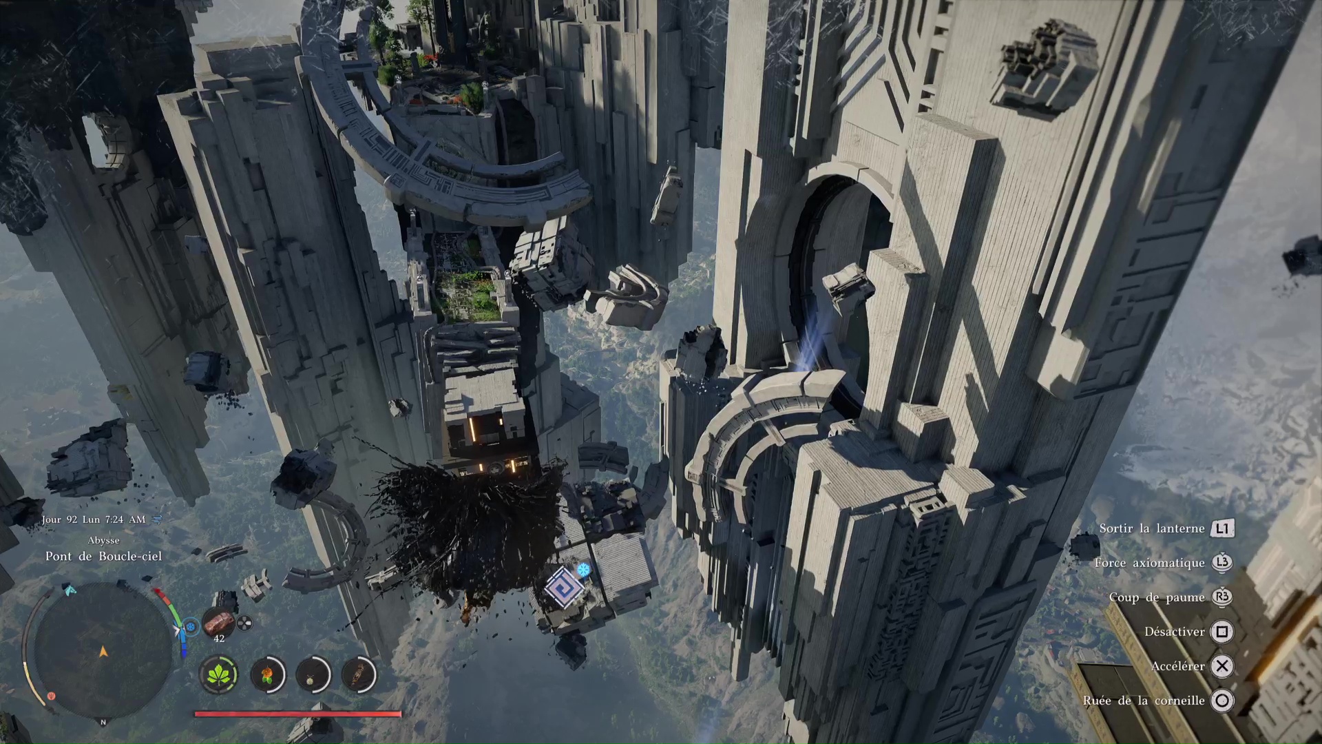 Planez jusqu’au mécanisme, grimpez dessus et, en son centre, réalisez un coup de paume pour l’activer tout en maintenant L2/LT. Le monolithe va se remettre en marche et vous donner accès à l’artefact abyssal de fin de parcours.