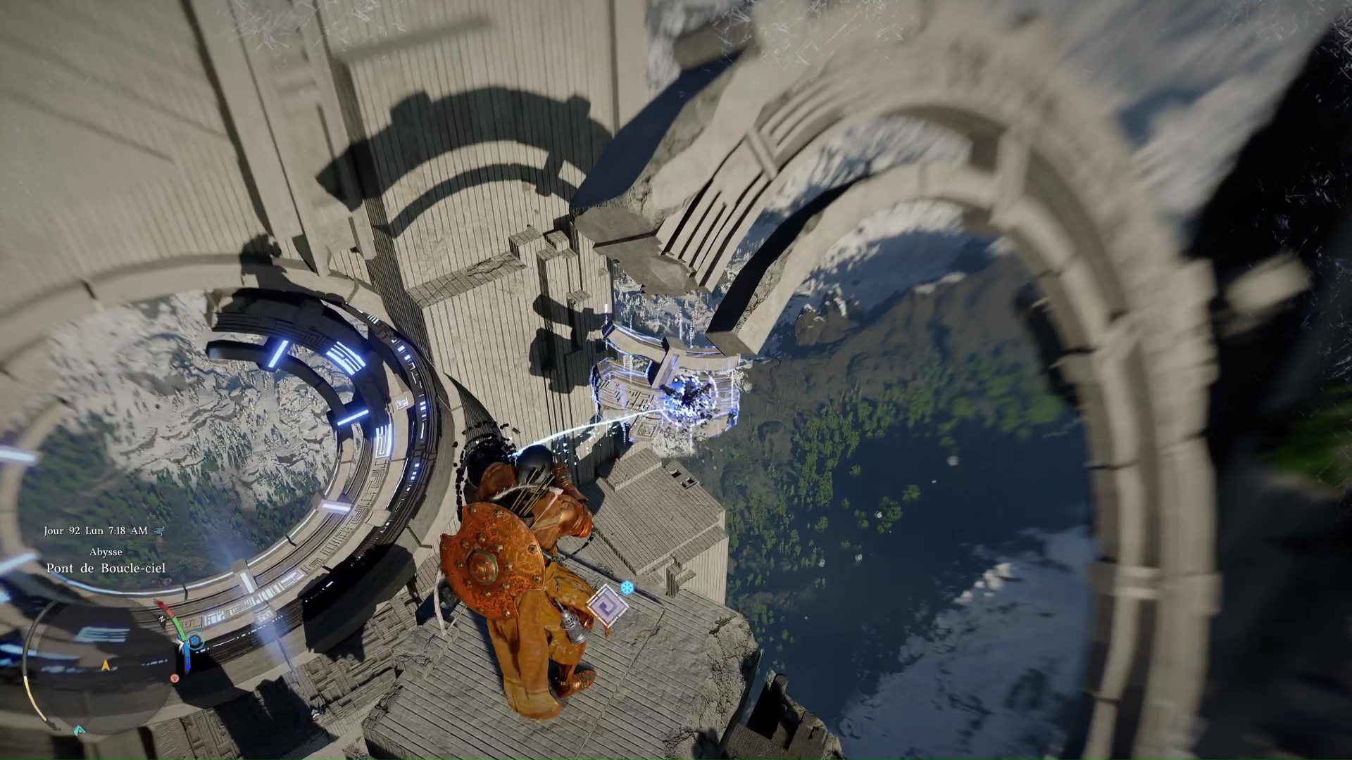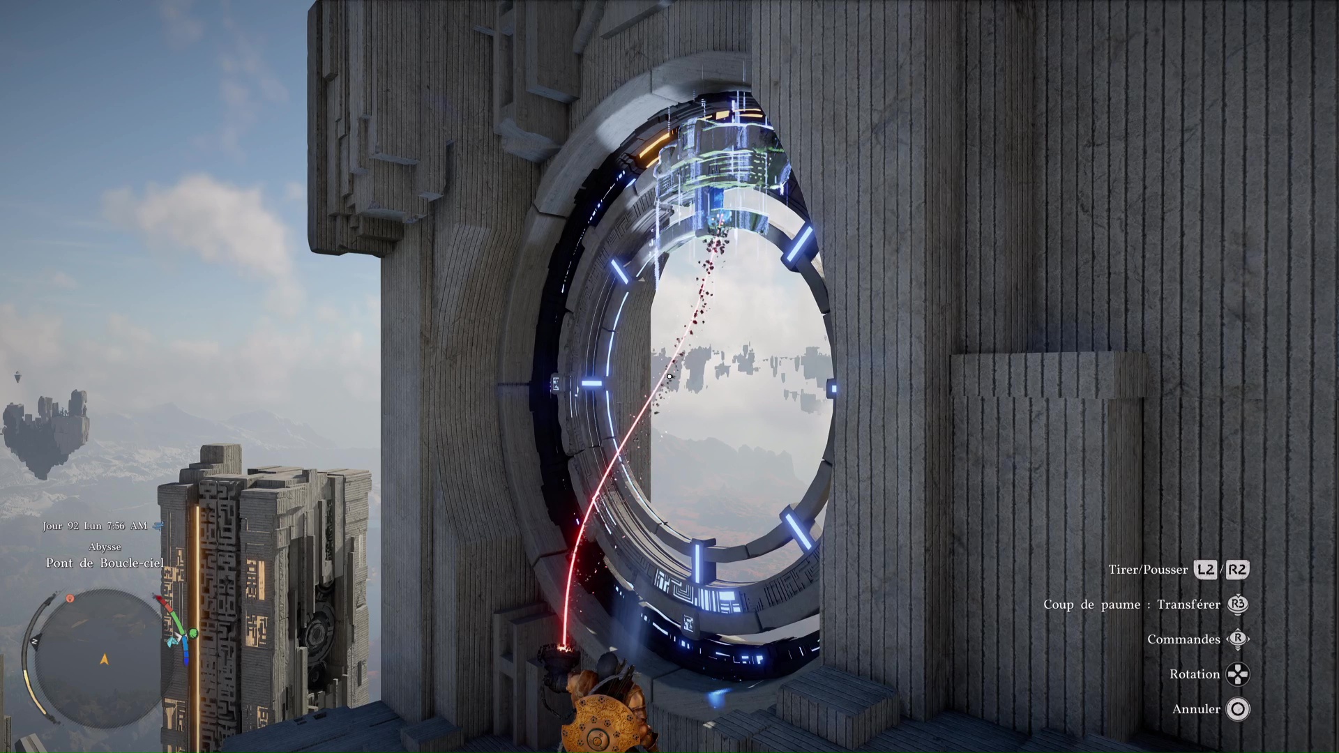 Empruntez le chemin qui apparaît en sachant que vous aurez des ventilateurs à prendre pour vous élever très haut. Suivez les courants d’air jusqu’à atteindre le téléporteur qui vous amènera à la zone du Pont de Boucle-ciel.