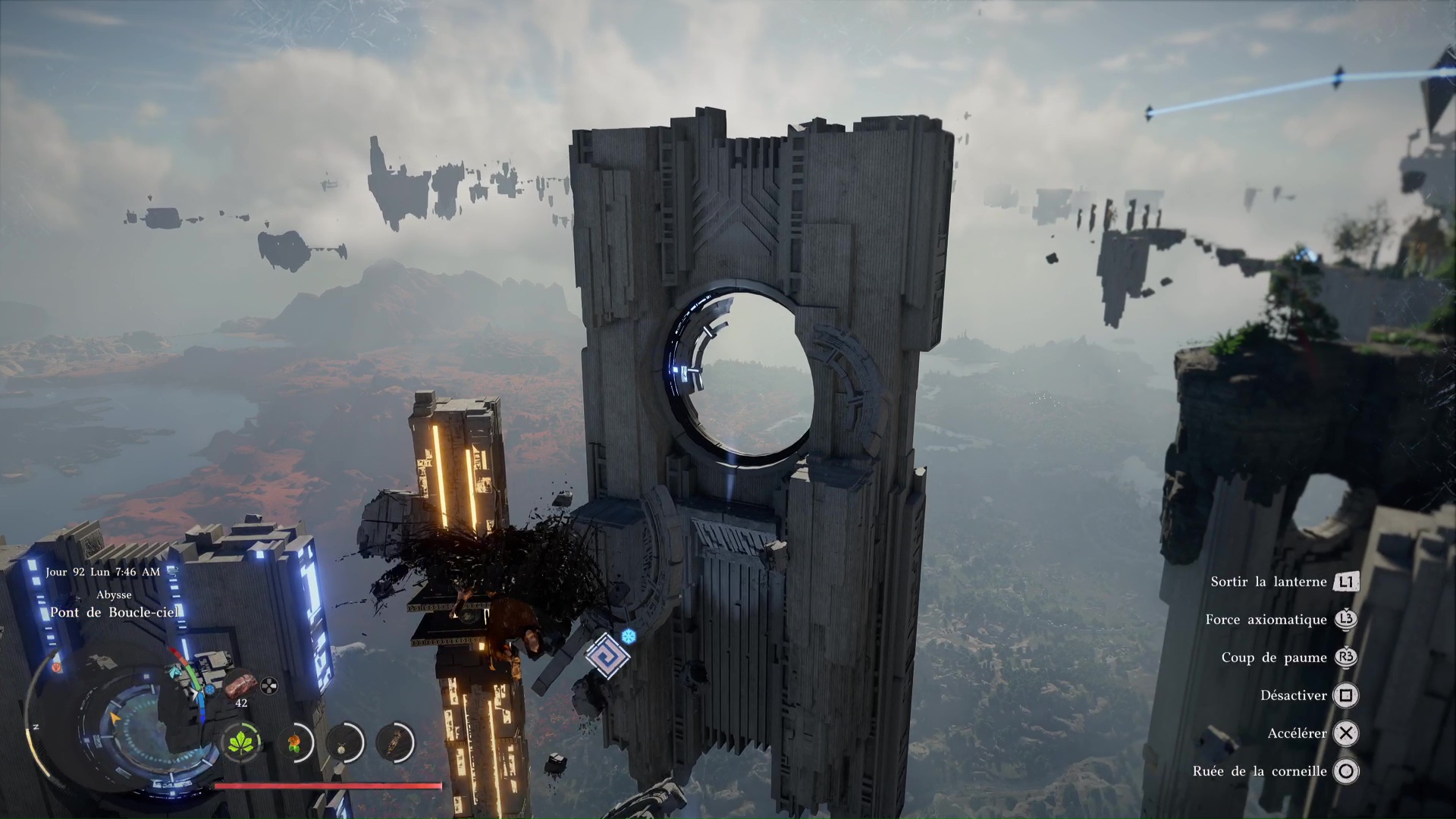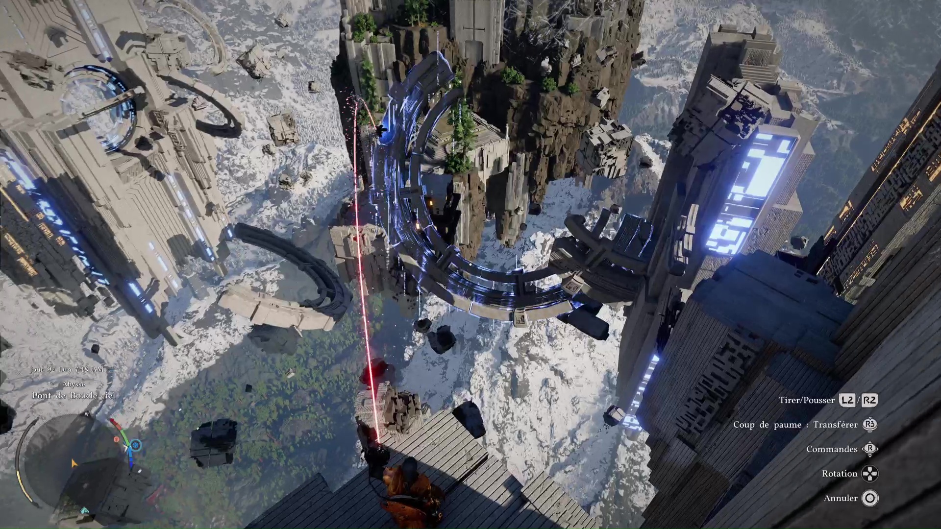 Avancez droit devant vous et commencez par vous intéresser au premier anneau de droite. Faites un triple saut de paume (saut + plusieurs fois R3/RS) puis atterrissez sur le cube flottant à proximité. Planez pour vous retrouver juste devant l’anneau.