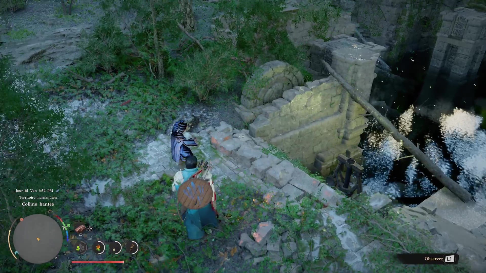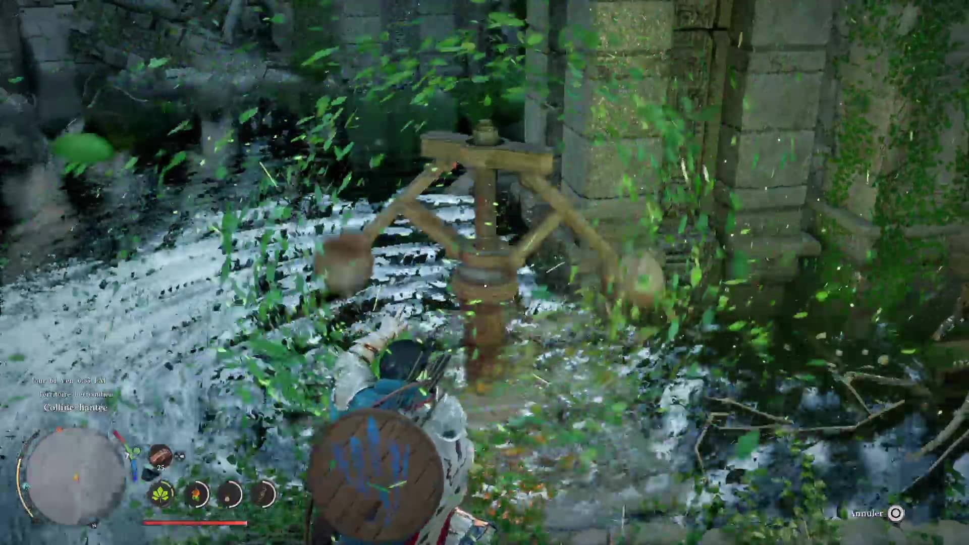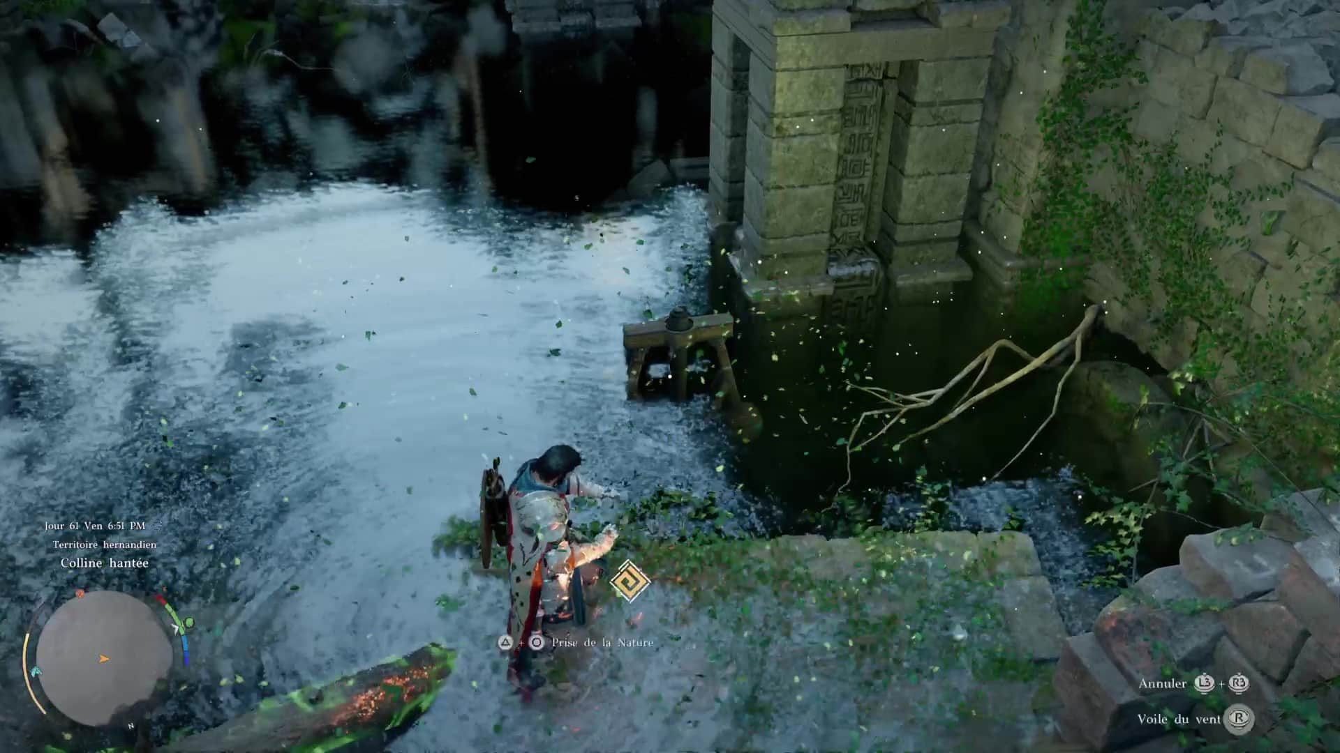 Pour lancer cette technique, il suffit de vous mettre en Concentration (L3+R3/LS+RS) puis de faire des cercles avec le joystick droit pour que Kliff fasse tournoyer le vent. Dans cette posture, approchez du tourniquet pour le faire s’élever et ainsi réduire le niveau d’eau. Continuez jusqu’à entendre un bruit, signe qu’il a atteint son maximum. Laissez descendre le tourniquet et remarquez, de l’autre côté du bassin et à peine sorti de l’eau, un deuxième tourniquet. Si ce n’est pas le cas, refaites un Voile de vent sur le premier tourniquet.