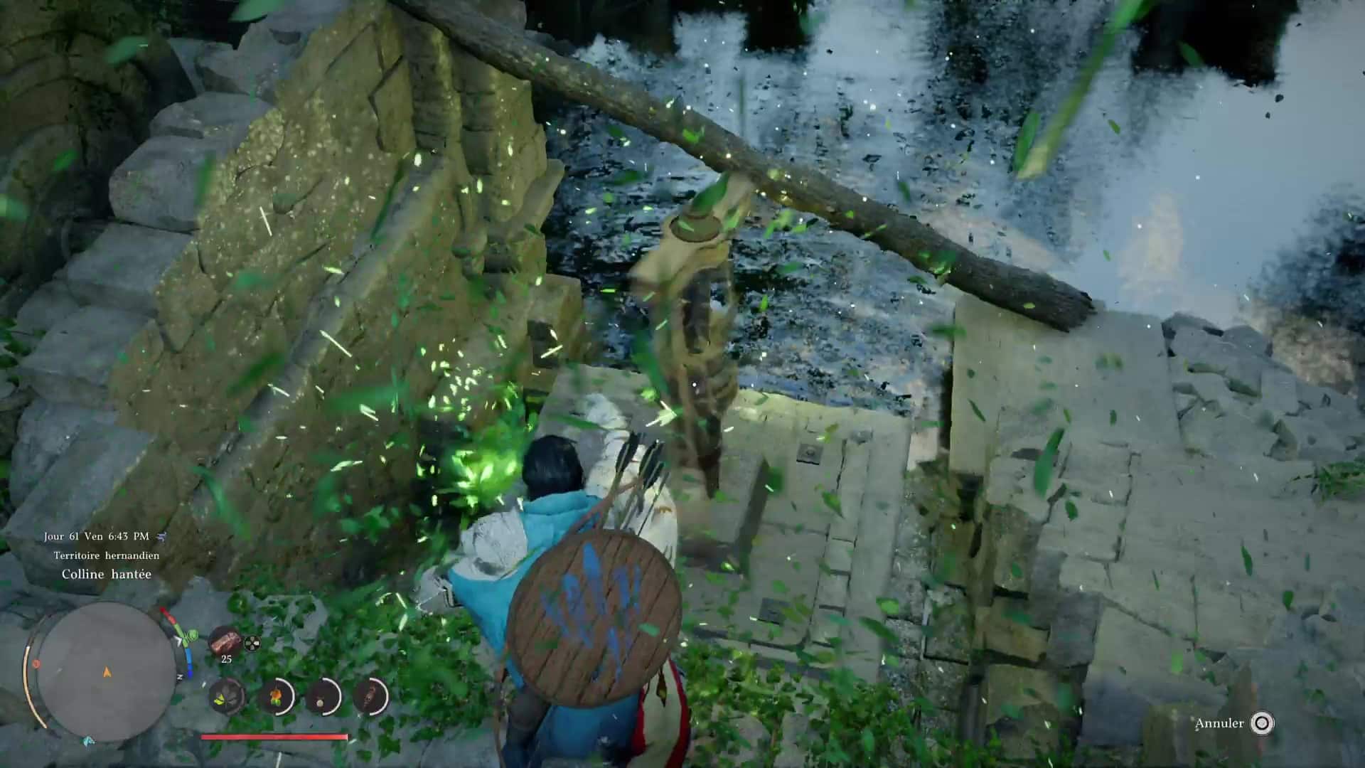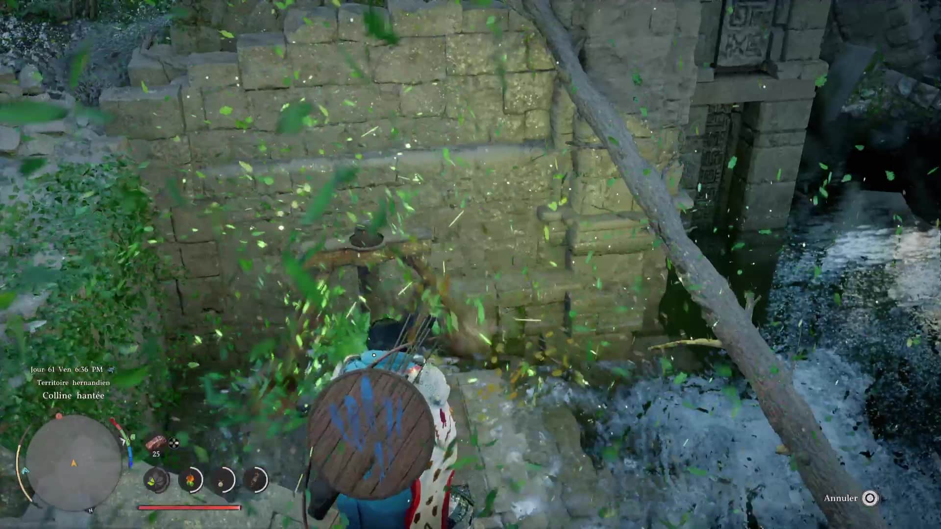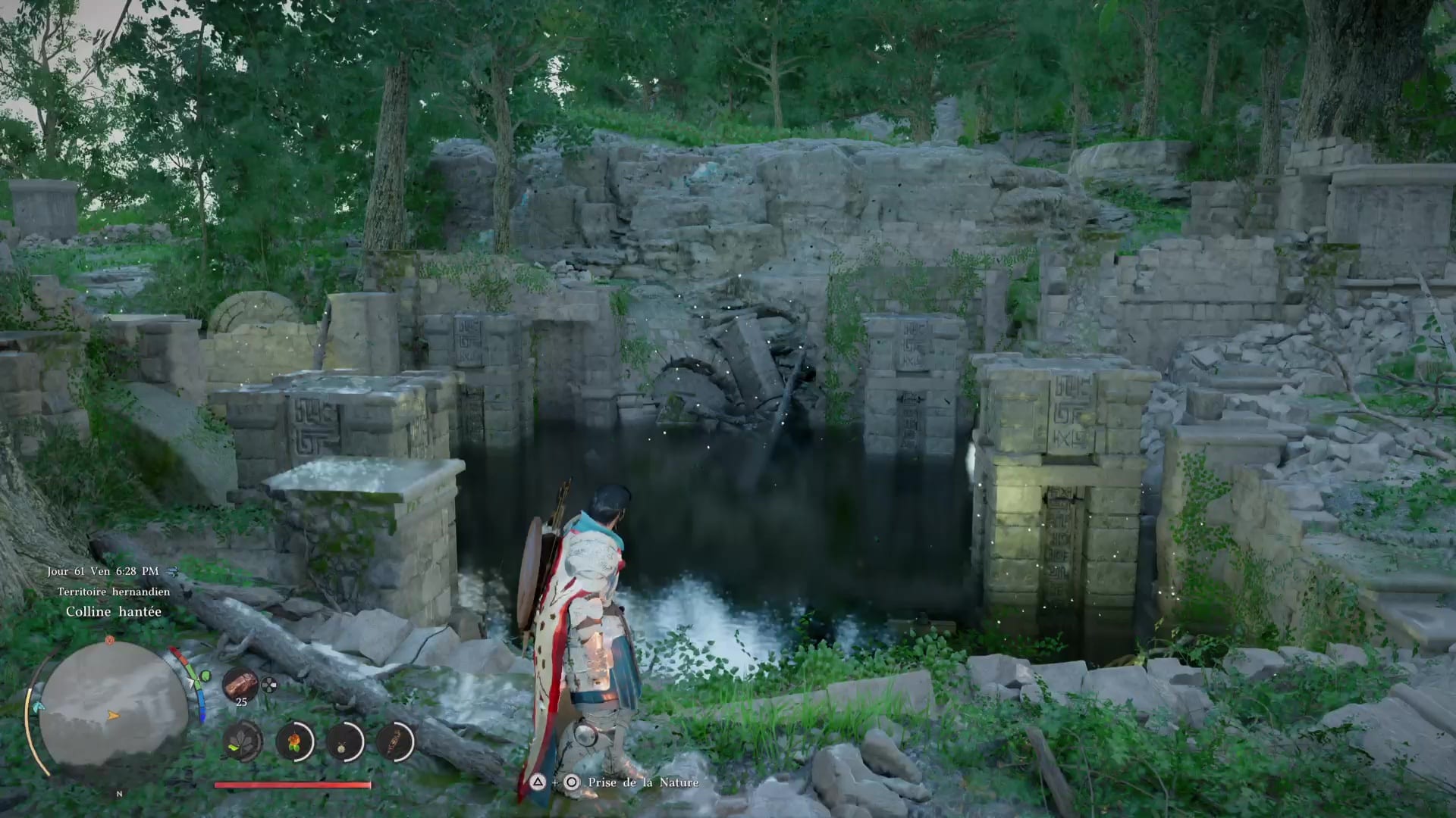 Pour lancer cette technique, il suffit de vous mettre en Concentration (L3+R3/LS+RS) puis de faire des cercles avec le joystick droit pour que Kliff fasse tournoyer le vent. Dans cette posture, approchez du tourniquet pour le faire s’élever et ainsi réduire le niveau d’eau. Continuez jusqu’à entendre un bruit, signe qu’il a atteint son maximum. Laissez descendre le tourniquet et remarquez, de l’autre côté du bassin et à peine sorti de l’eau, un deuxième tourniquet. Si ce n’est pas le cas, refaites un Voile de vent sur le premier tourniquet.