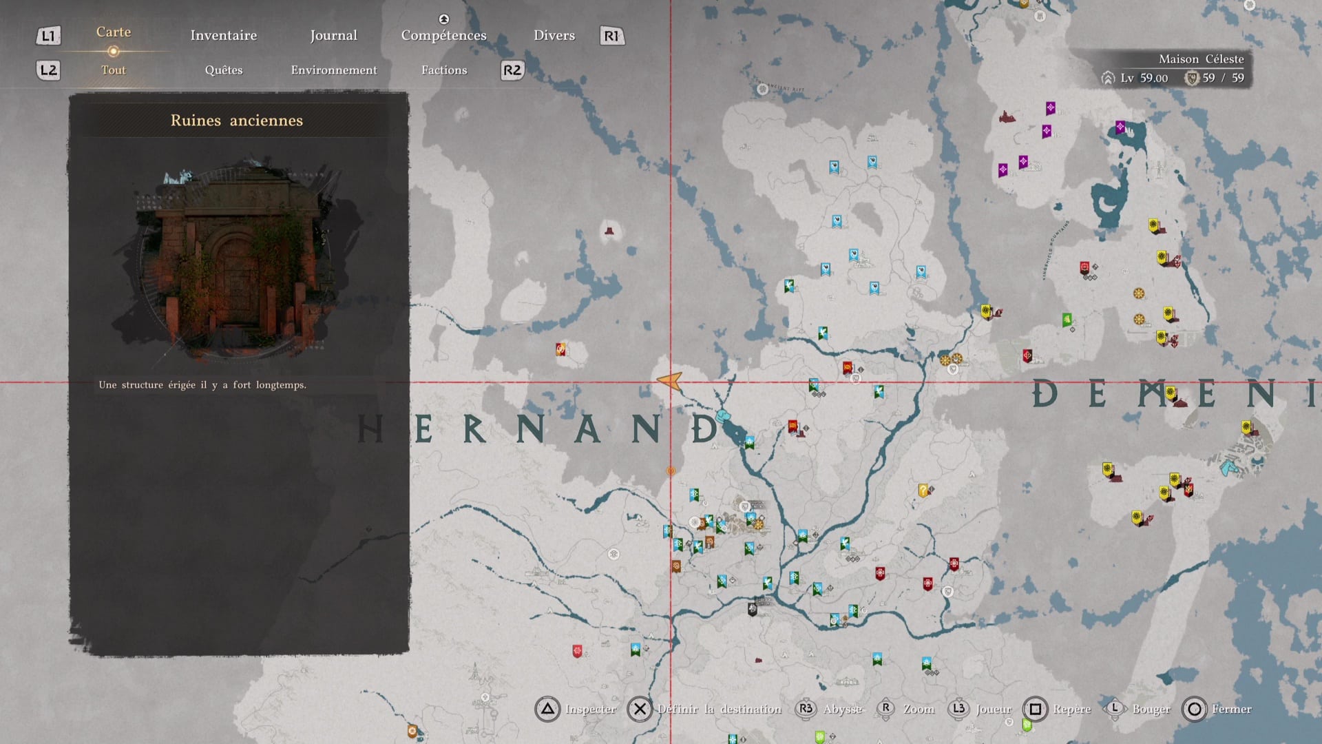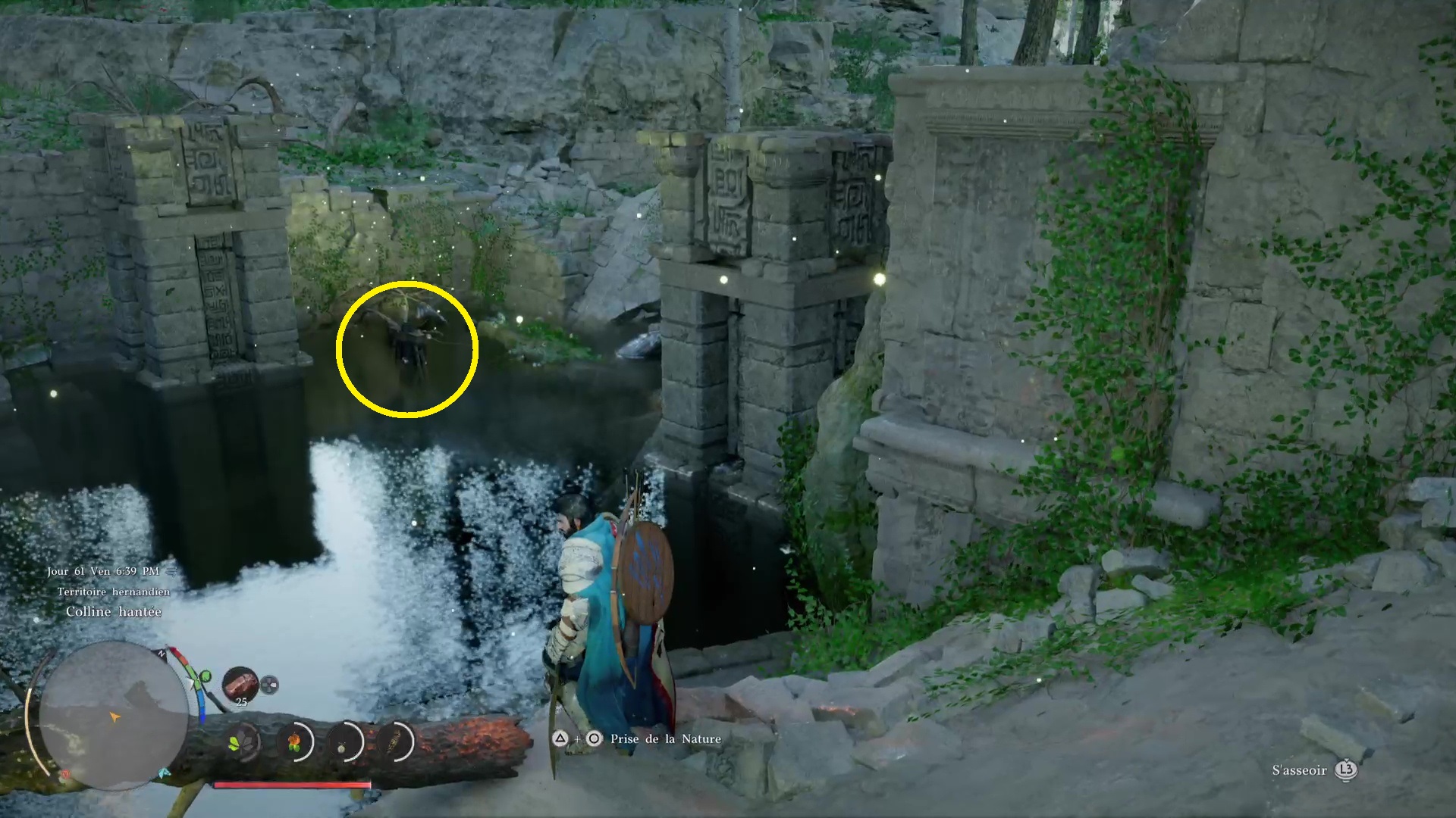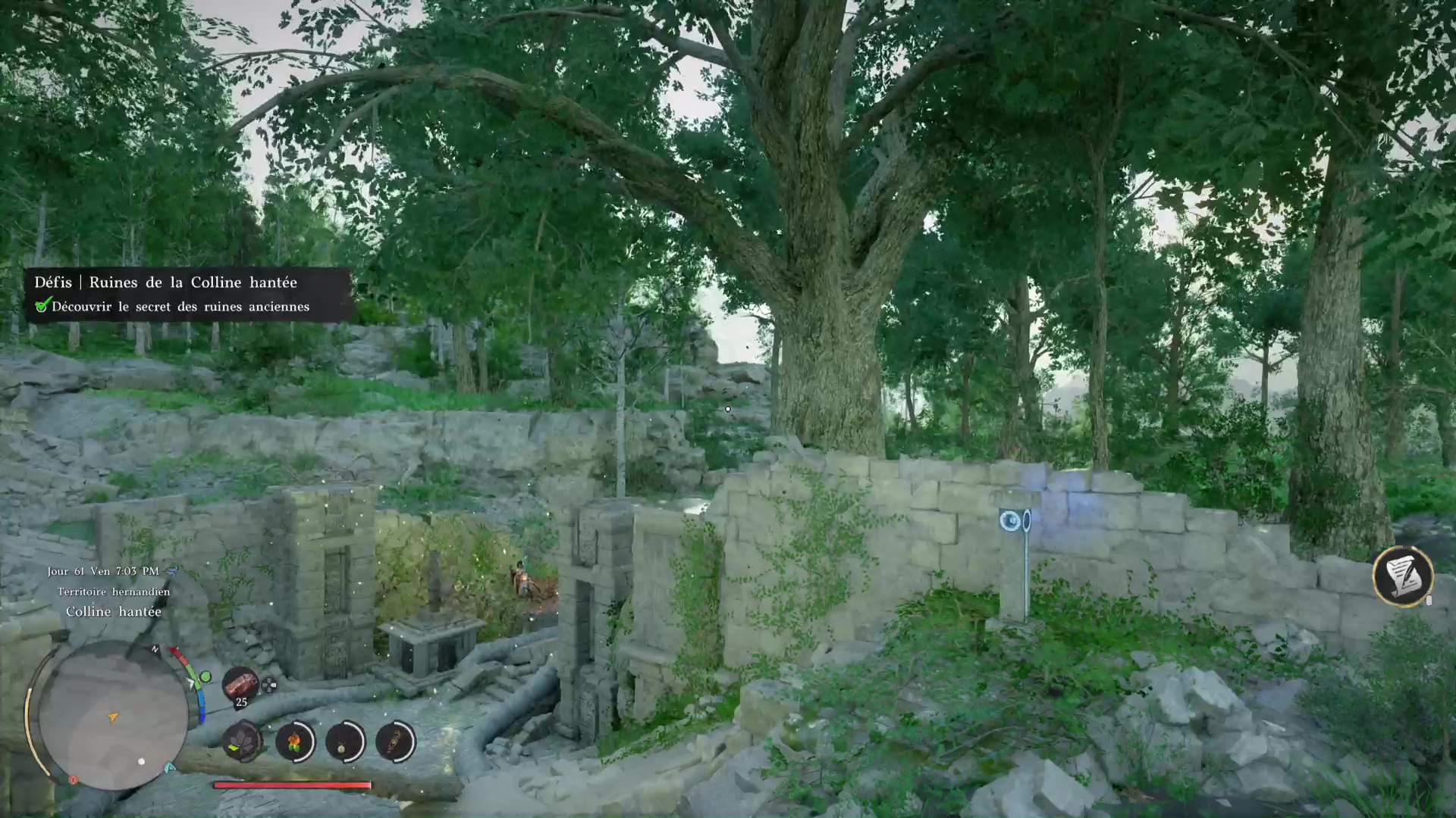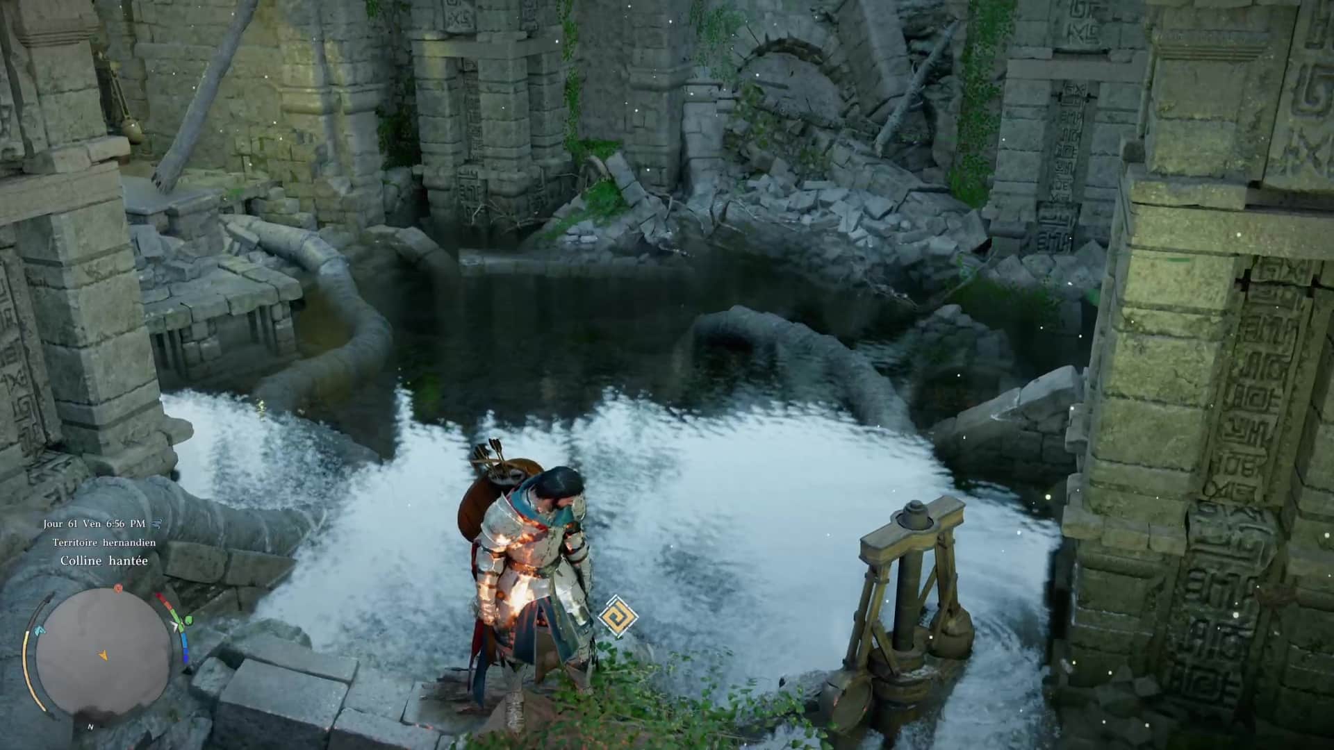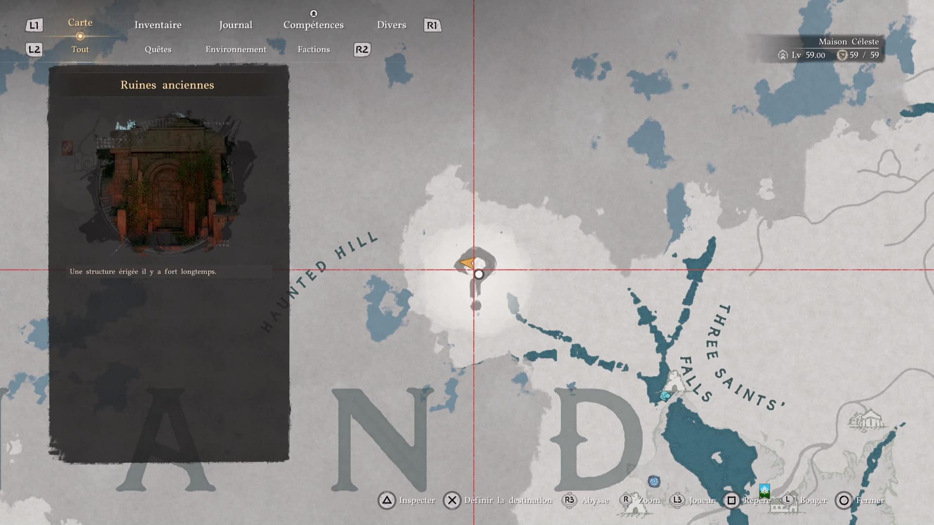 Légèrement au-dessus du deuxième « N » de Hernand lorsque l’on regarde la map, vous tomberez sur les Ruines de la Colline hantée, littéralement dans le secteur Colline hantée (« Haunted Hill » sur la map).