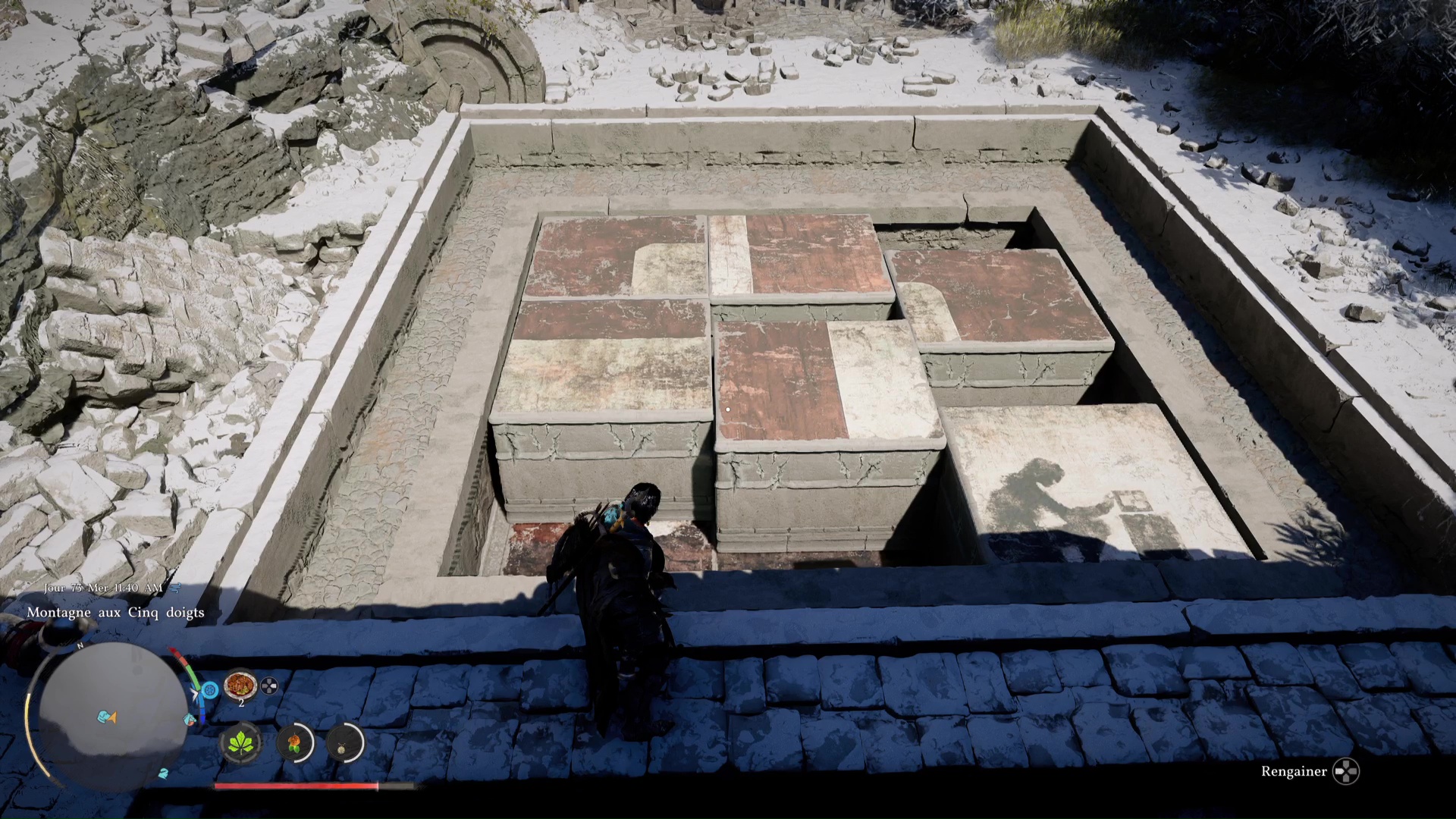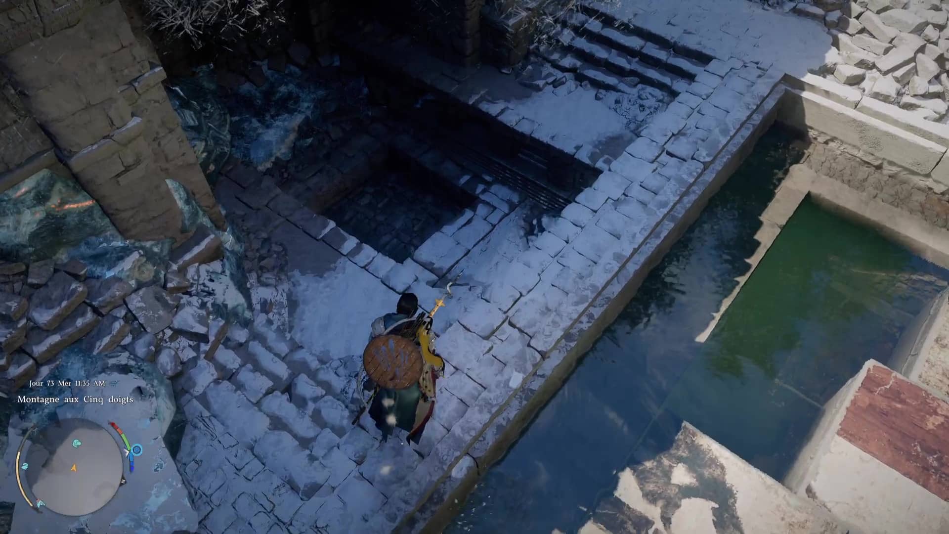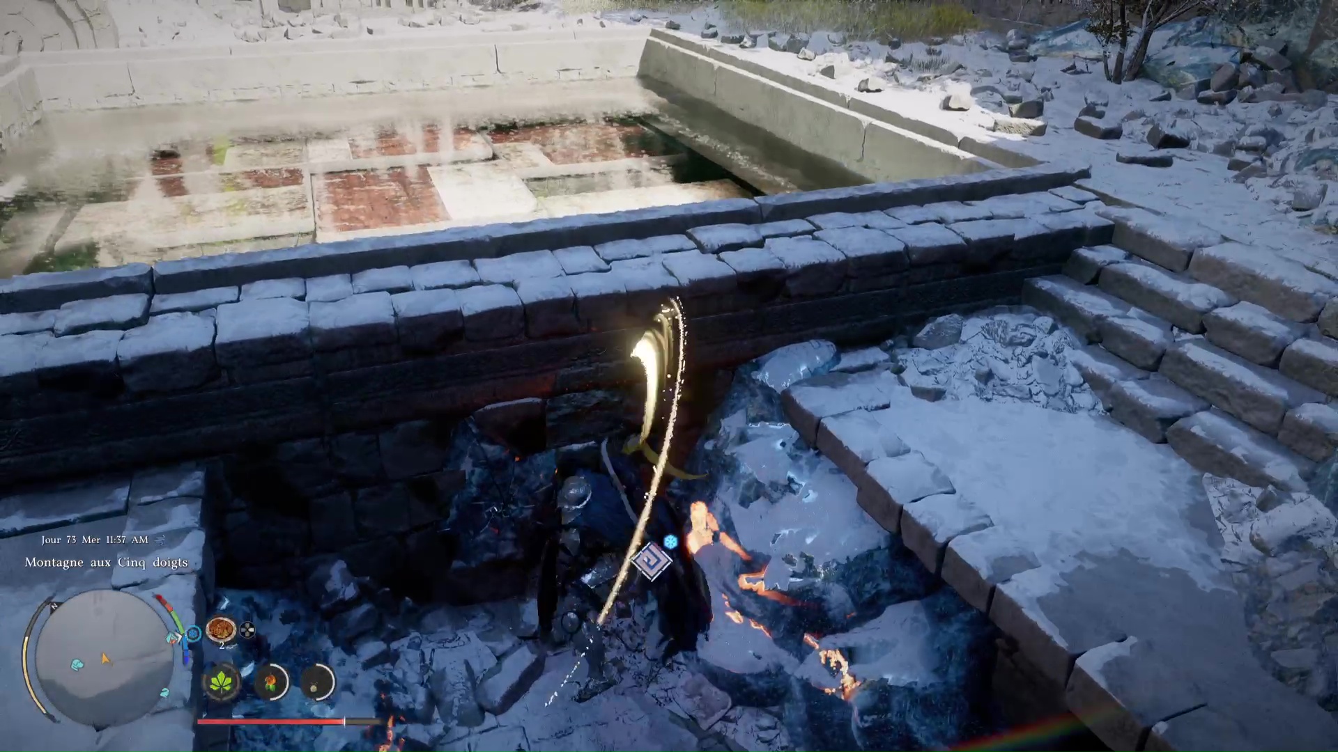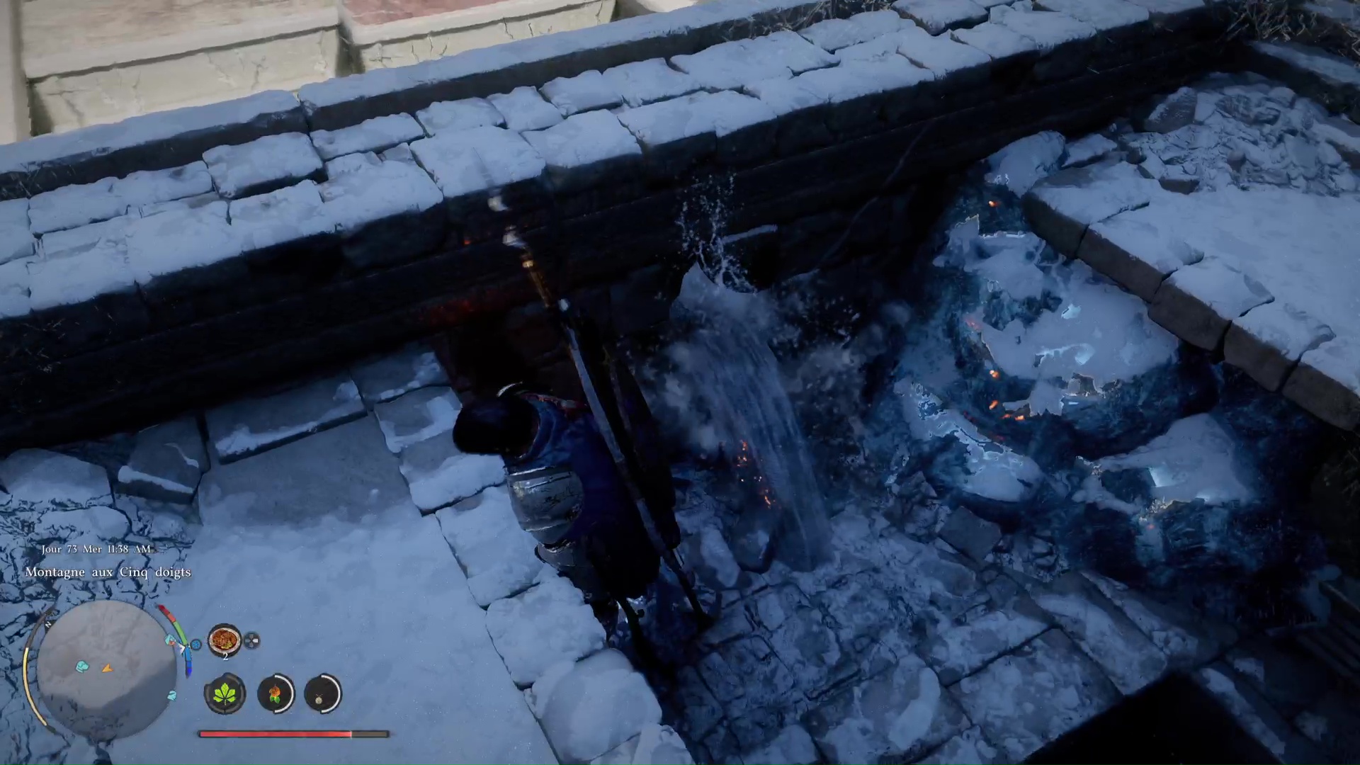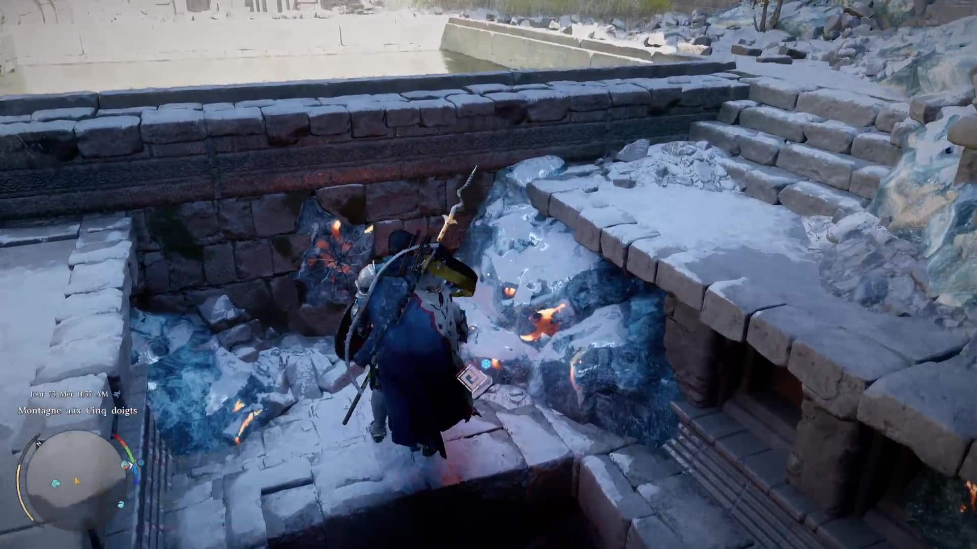 Vous débarquerez donc aux Ruines de givre de la Montagne aux Cinq doigts, avec un dessin à reconstituer en déplaçant des blocs. Mais avant cela, il faut vous débarrasser de la couche de glace du bassin en contrebas. Brisez-la avec un coup de paume accroupi ou un coup de force axiomatique.