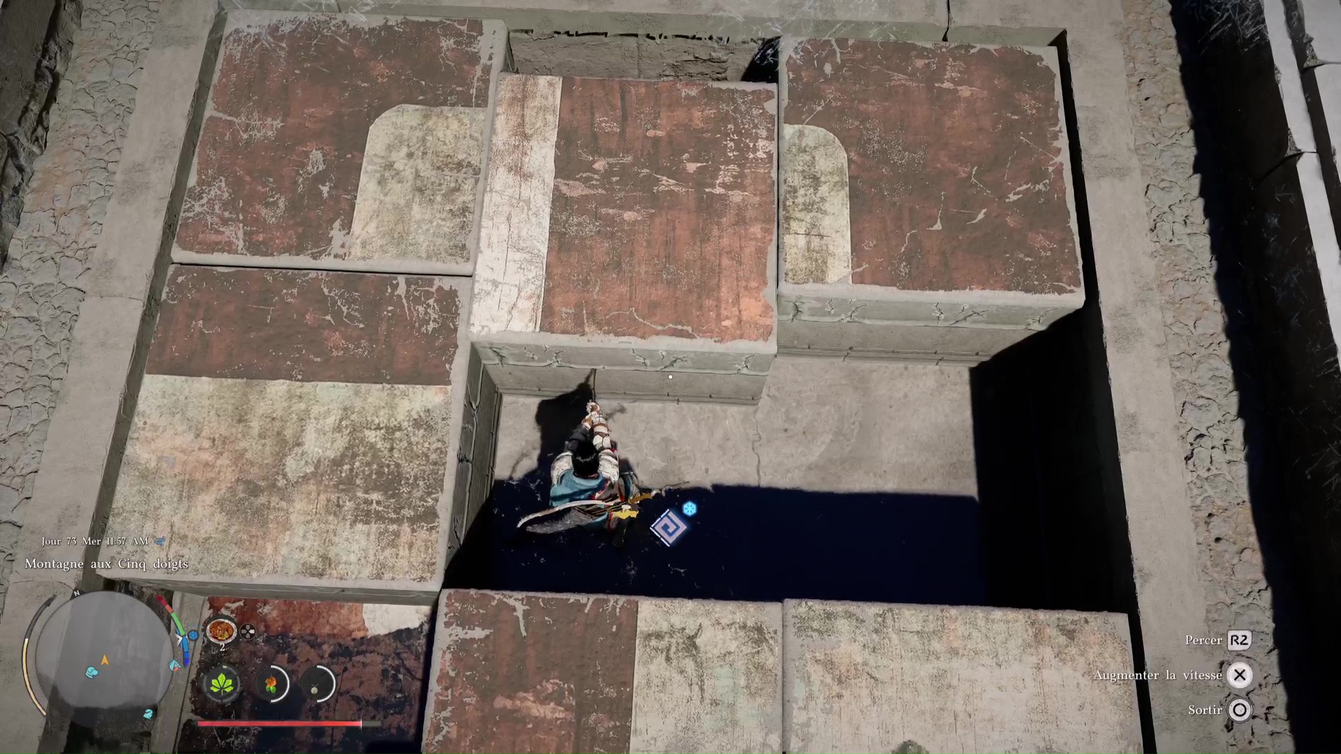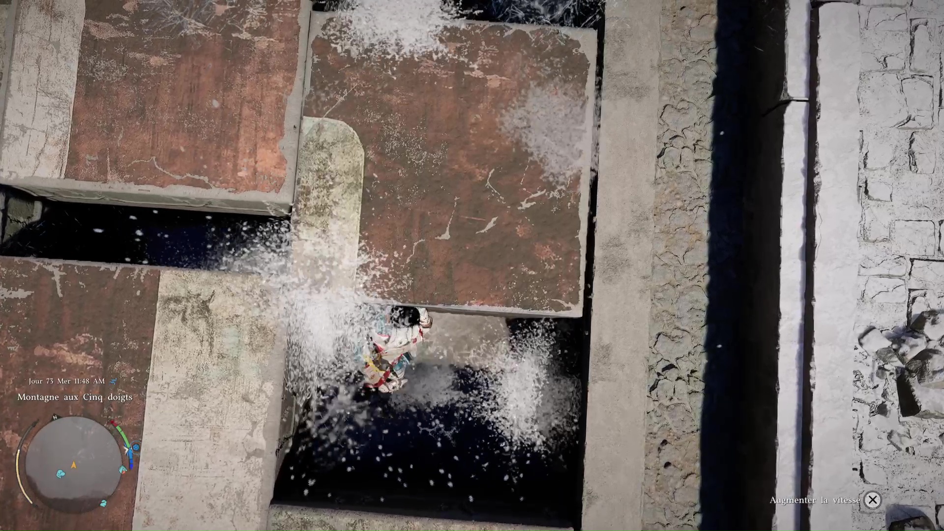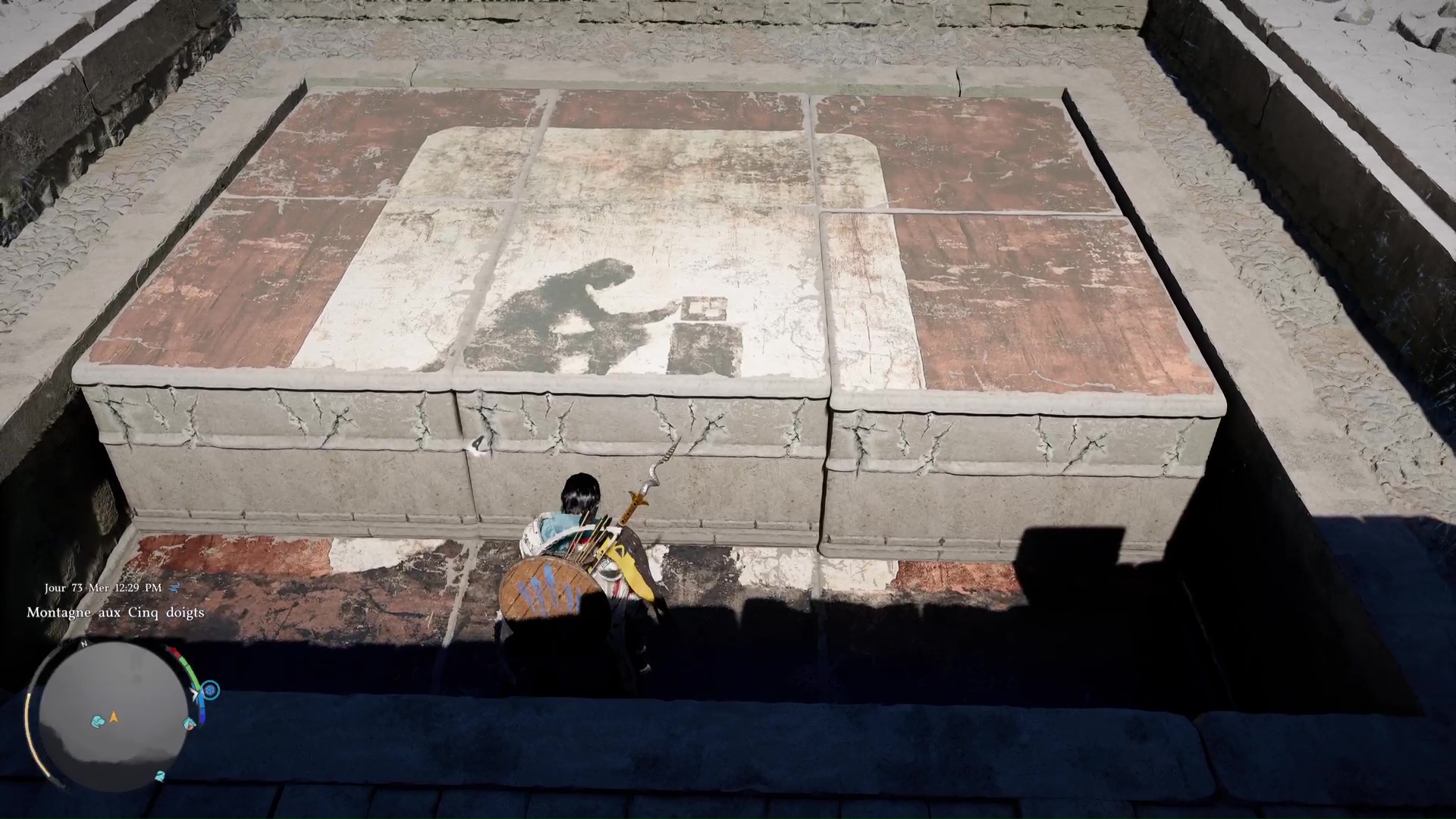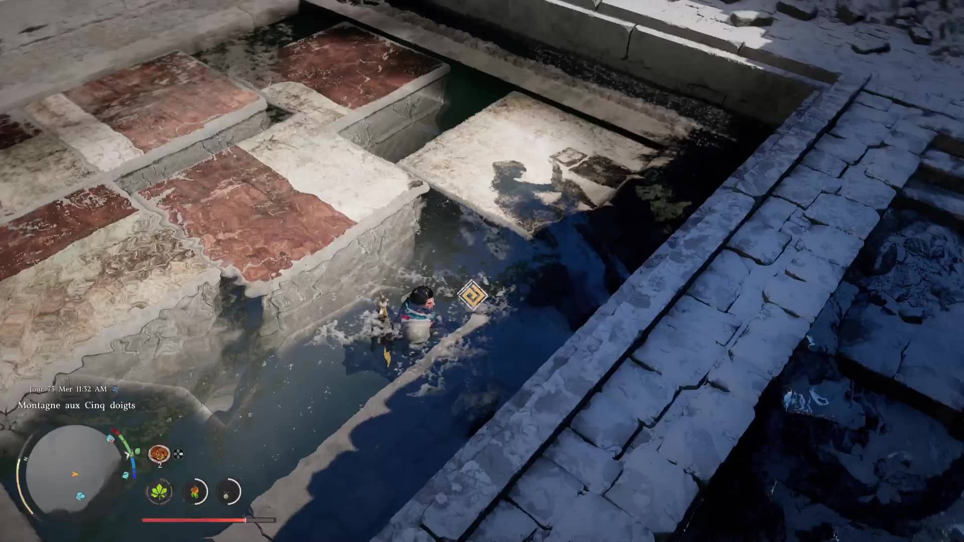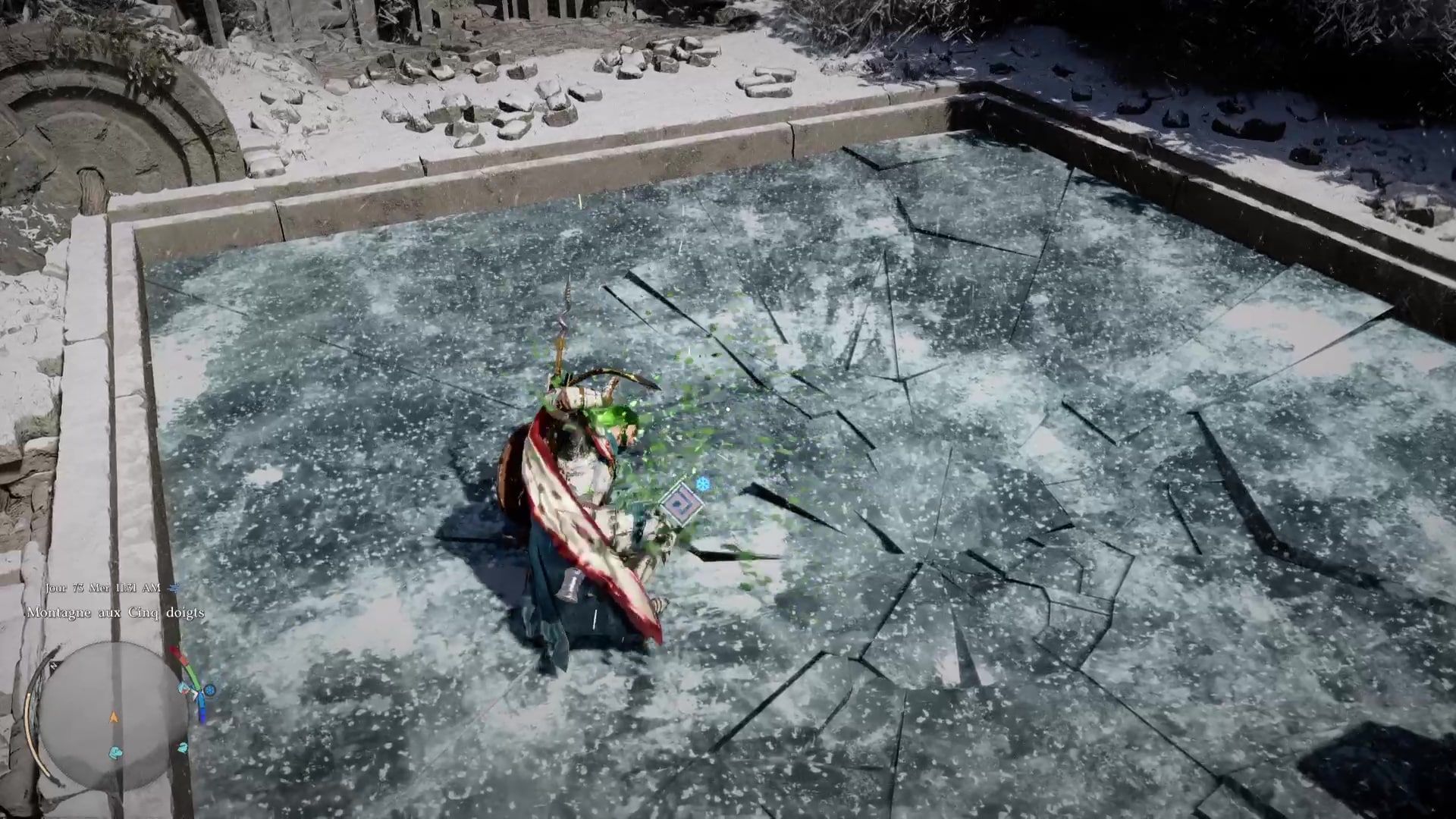 Vous débarquerez donc aux Ruines de givre de la Montagne aux Cinq doigts, avec un dessin à reconstituer en déplaçant des blocs. Mais avant cela, il faut vous débarrasser de la couche de glace du bassin en contrebas. Brisez-la avec un coup de paume accroupi ou un coup de force axiomatique.
