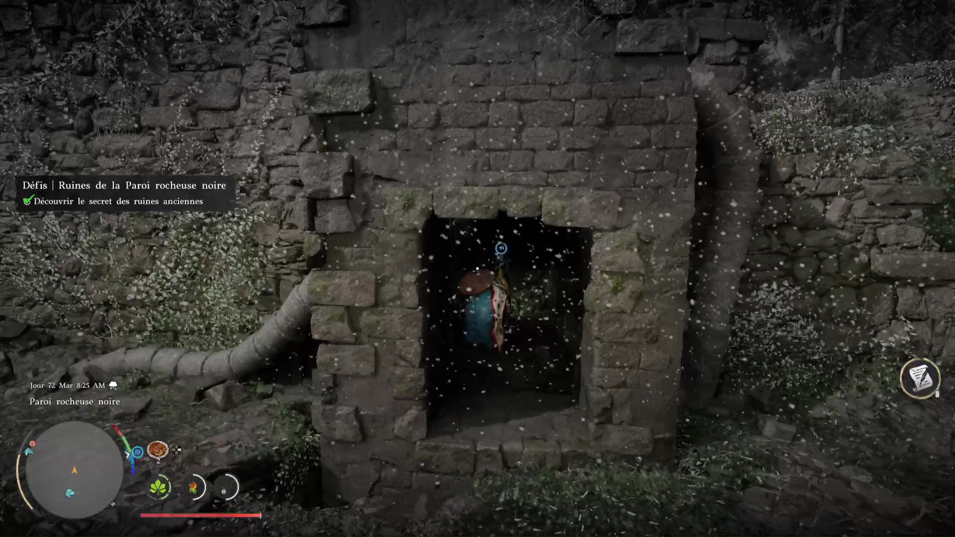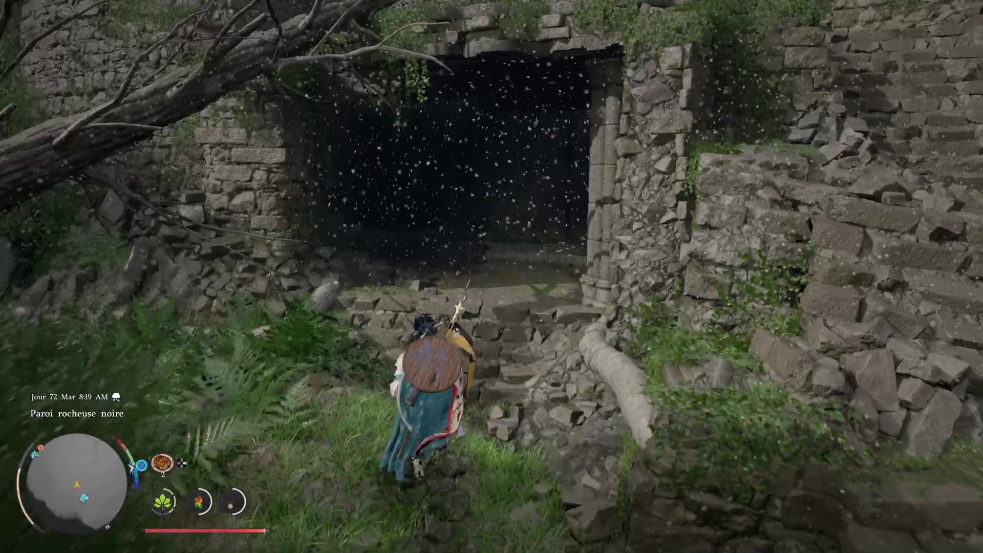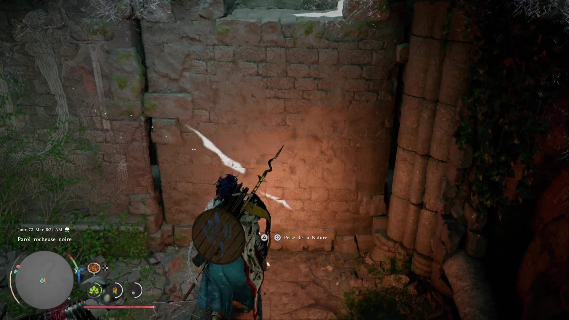 L’énigme ici est extrêmement simple. Devant les ruines, engouffrez-vous dans l’ouverture sombre, sous un tronc d’arbre couché. Approchez ensuite du mur au fond à droite pour que l’on vous invite à réaliser une Prise de la nature dessus. Faites-le en appuyant sur Triangle+Rond/Y+B, pour que Kliff soulève le mur.
