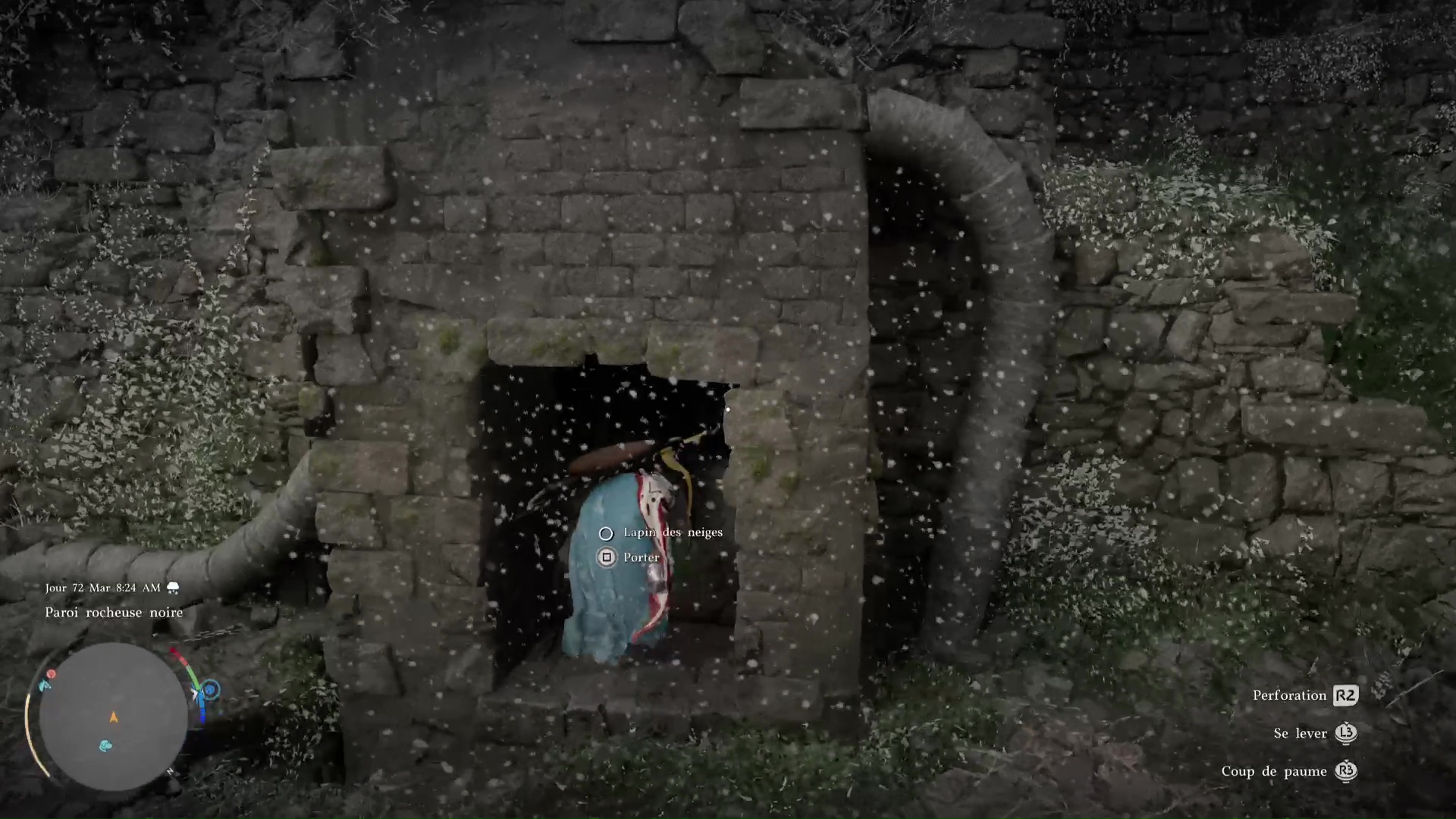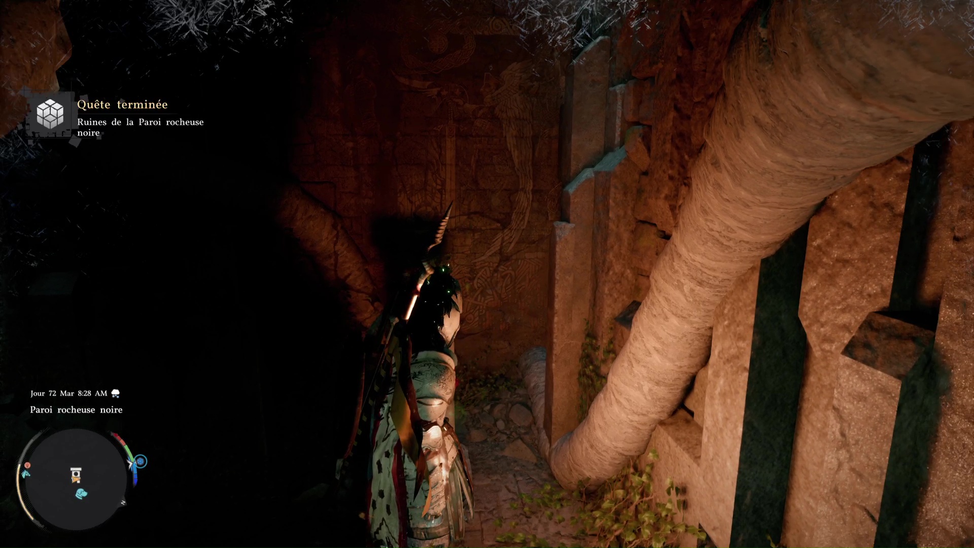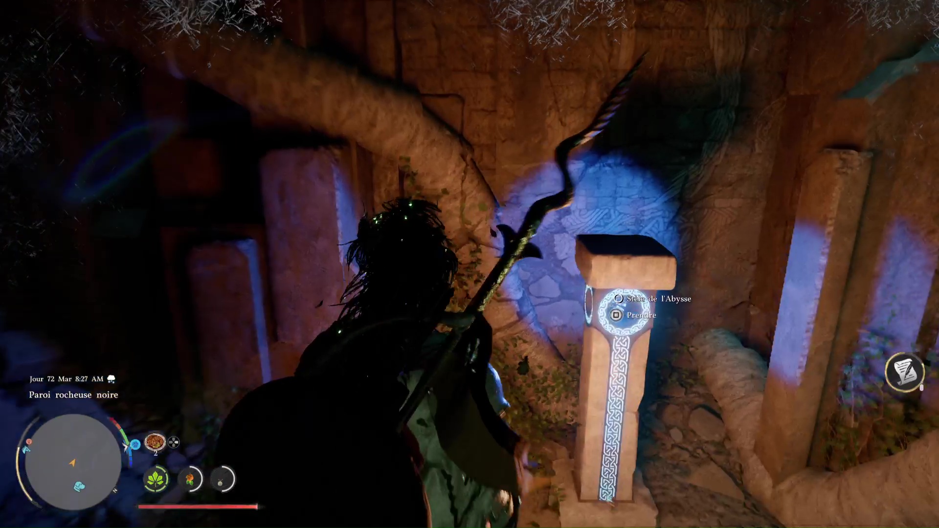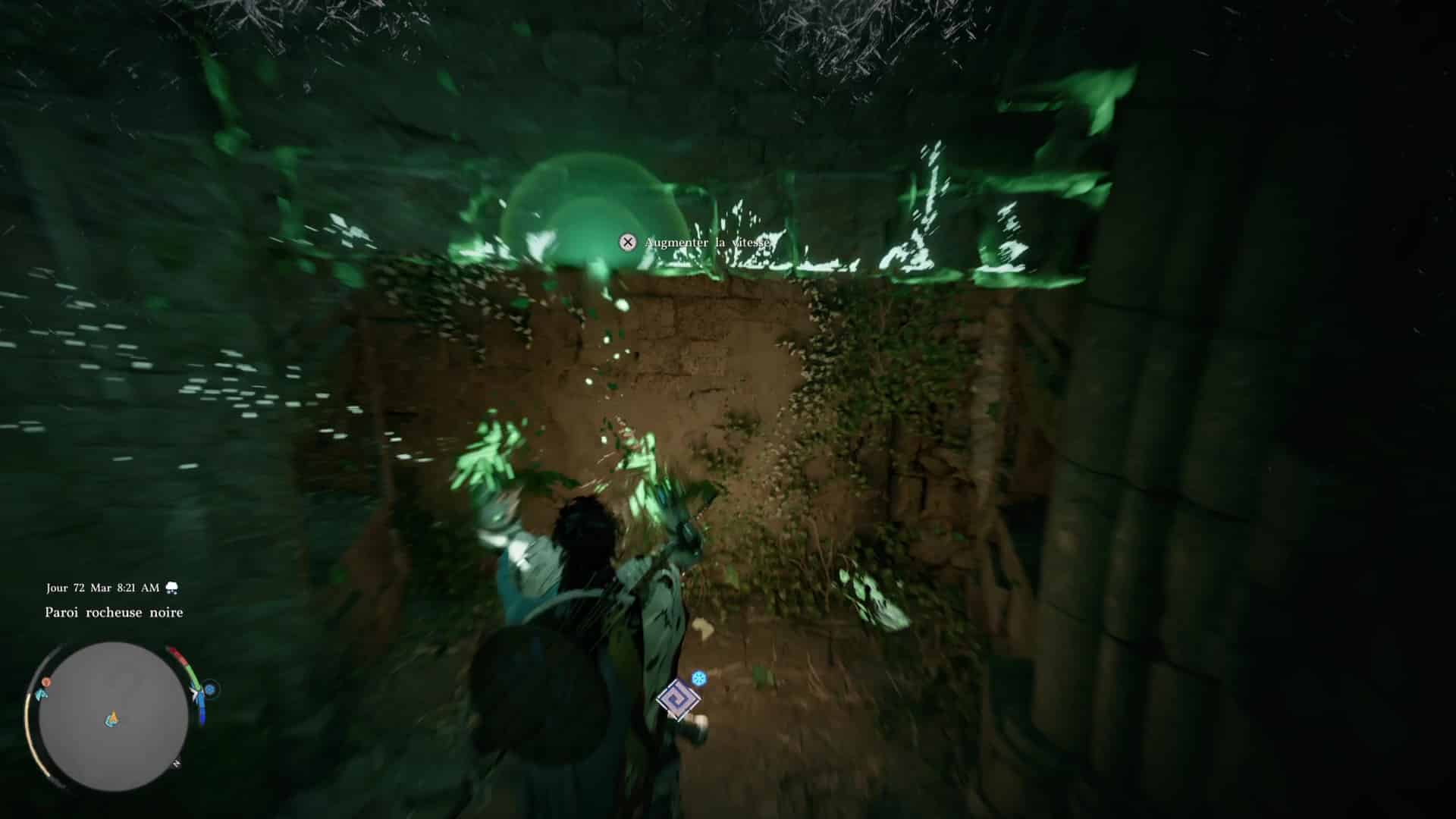 L’énigme ici est extrêmement simple. Devant les ruines, engouffrez-vous dans l’ouverture sombre, sous un tronc d’arbre couché. Approchez ensuite du mur au fond à droite pour que l’on vous invite à réaliser une Prise de la nature dessus. Faites-le en appuyant sur Triangle+Rond/Y+B, pour que Kliff soulève le mur.