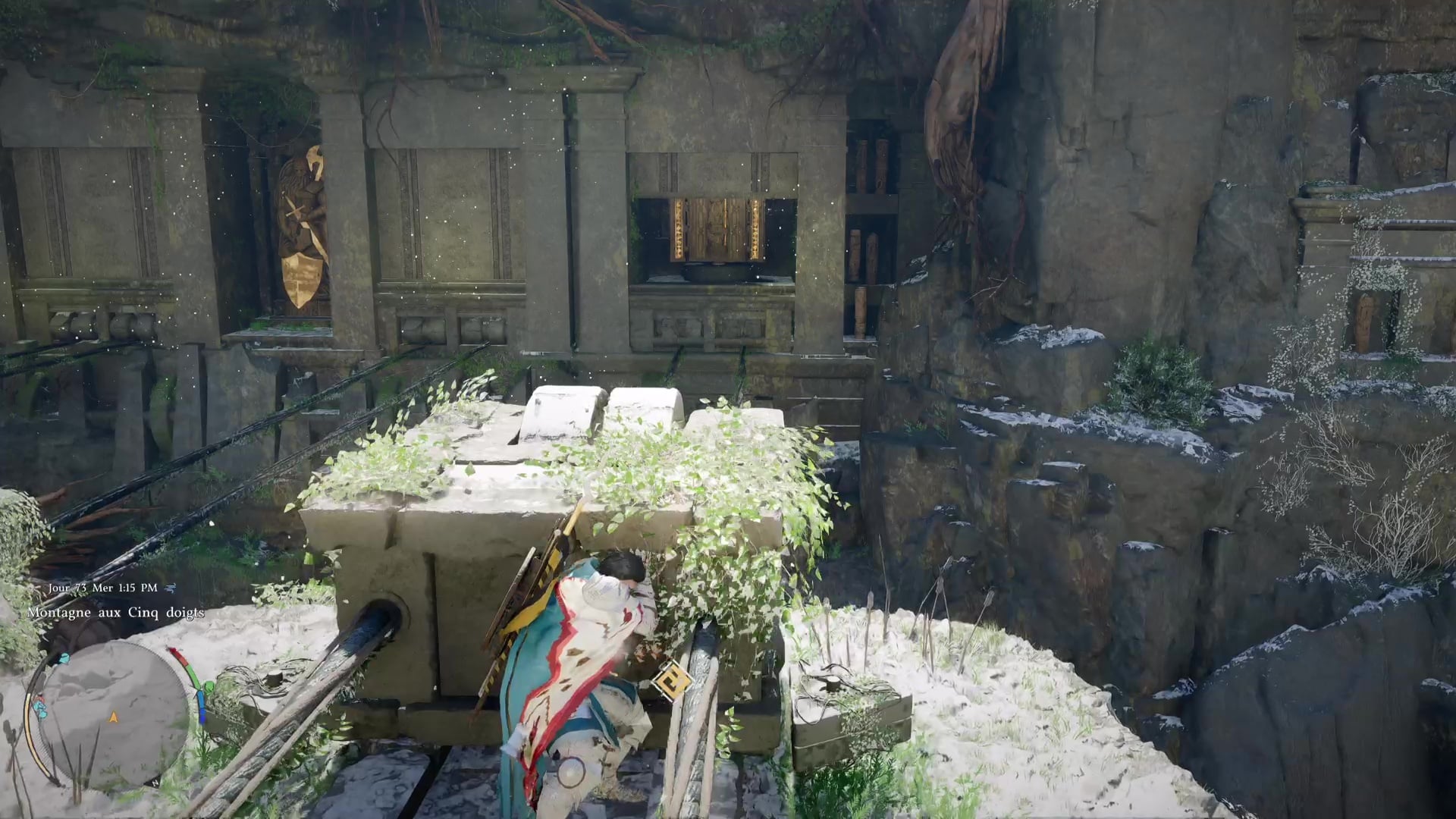 Le but est de pousser les blocs de pierre vers le vide pour ouvrir sa fenêtre en face, laissant apparaître un petit autel pivotant sur lequel il y a des symboles. Ensuite, avant que la fenêtre ne se referme, montez rapidement sur le bloc pendant qu’il recule puis sortez l’arc pour tirer une flèche sur les extrémités dorées de l’autel afin que le symbole qui apparait soit la même qu’une des armes dorées détenues par la statue.