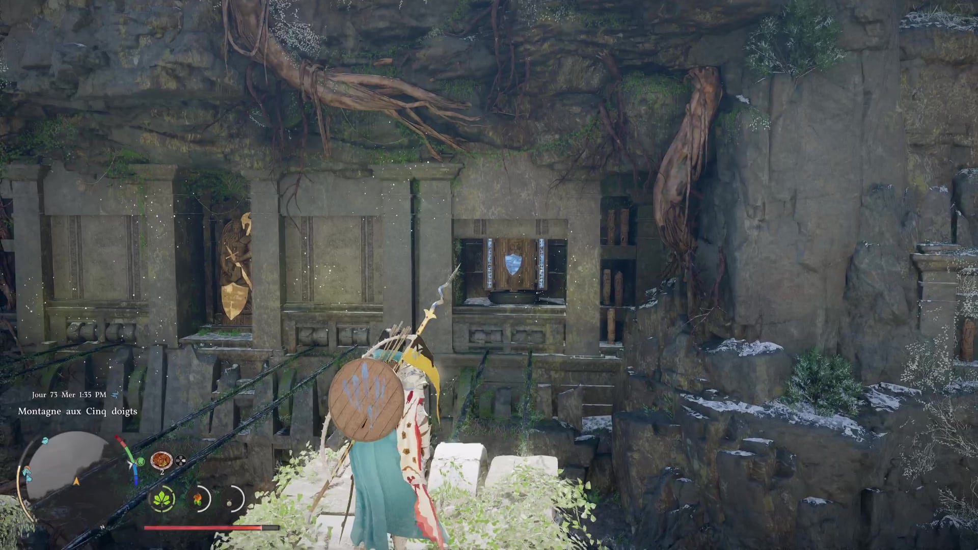 Les Ruines anciennes se trouvent en hauteur, entre deux parois rocheuses. D’un côté, trois blocs de pierre avec chacun un mécanisme. De l’autre, une statue équipée d’une épée, d’une hache et d’un bouclier dorés. Les blocs de pierre sont reliés par des chaînes à des fenêtres fermées autour de la statue.