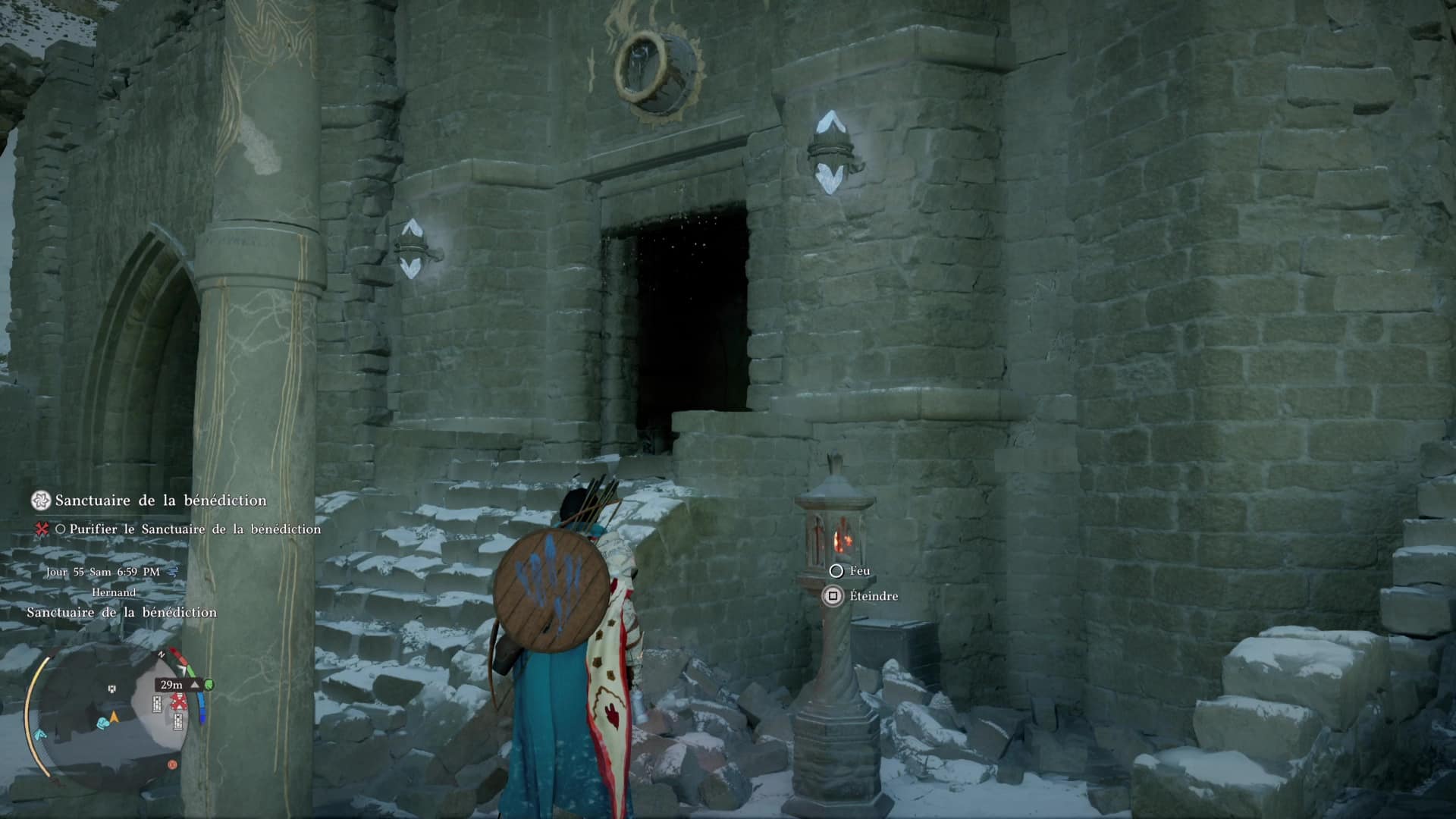 Allez ensuite chercher le morceau de pilier manquant. Faites le tour du bâtiment principal des ruines pour tomber devant une porte cachée avec un symbole rond qui dépasse du mur. Pour ouvrir cette porte secrète, remarquez la lanterne à droite des escaliers. Allumez-la pour révéler l’accès secret.
