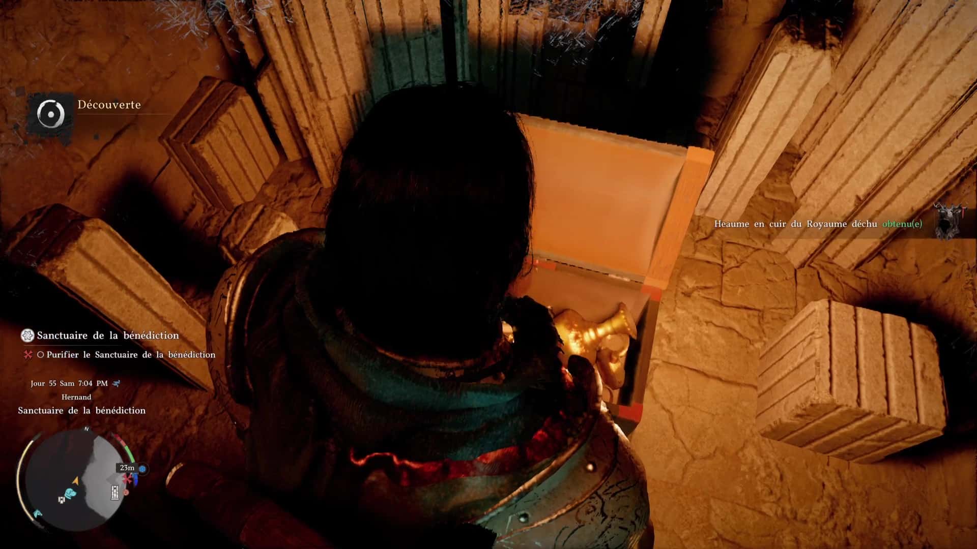 Entrez dans la pièce et vous pourrez en profiter pour récupérer dans un coffre au trésor le Heaume en cuir du Royaume déchu. Mais ce qui nous intéresse surtout, c’est le bout de pilier présent tout de suite à gauche en entrant.