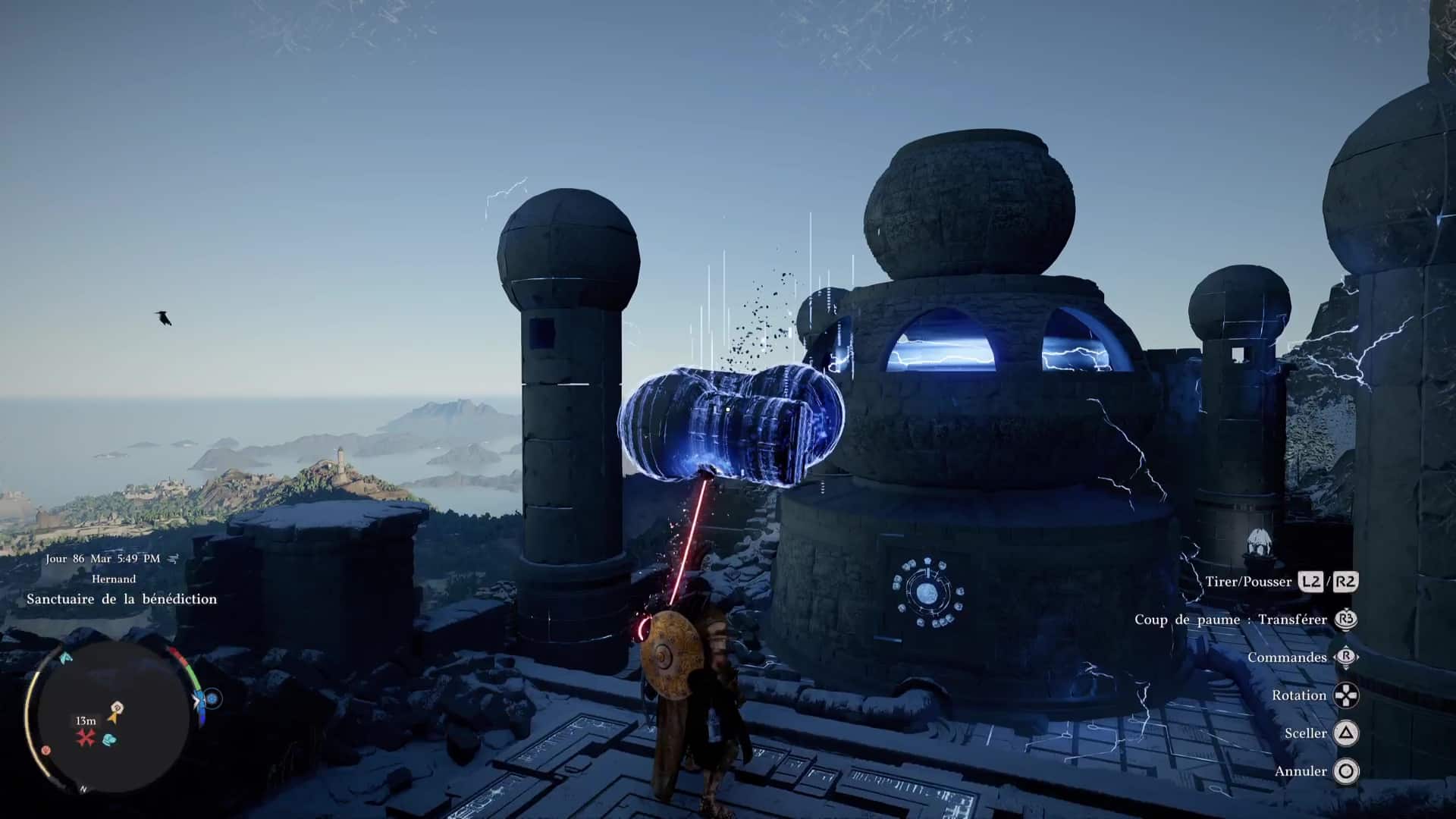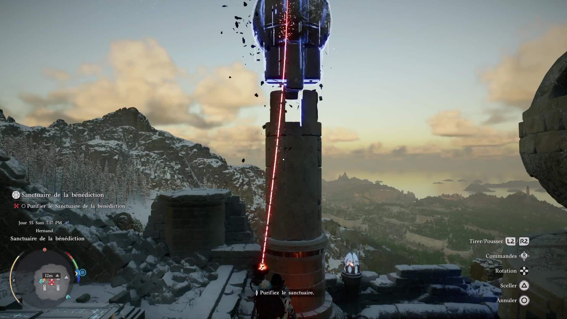 Embarquez le morceau de pilier avec vous grâce à la force axiomatique et positionnez-le au sommet du bout de pilier du réacteur. Le jeu va vous aider à le placer comme il faut puis, lorsque des petites feuilles apparaîtront autour du morceau de pilier, montez dessus et donnez un coup de saut de paume (saut + R3/RS) pour fixer le pilier. Le réacteur va alors se remettre en route et la sorcière de la sagesse viendra vous remercier pour vos efforts.