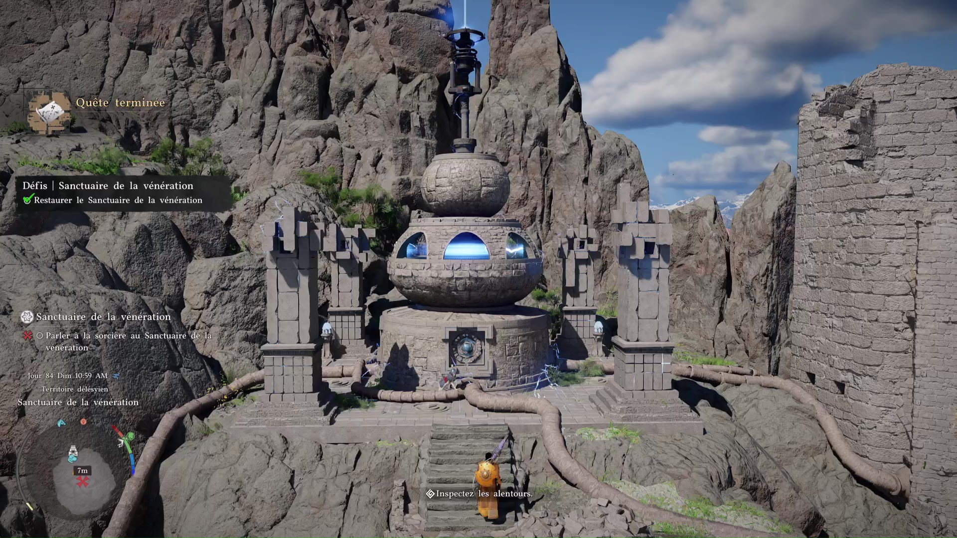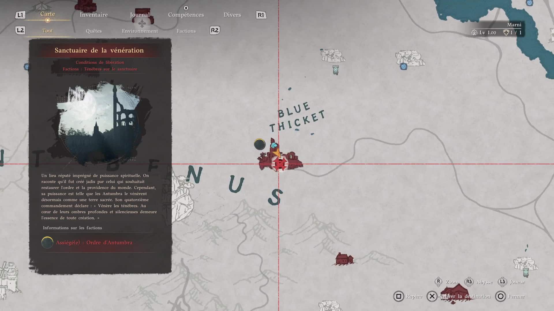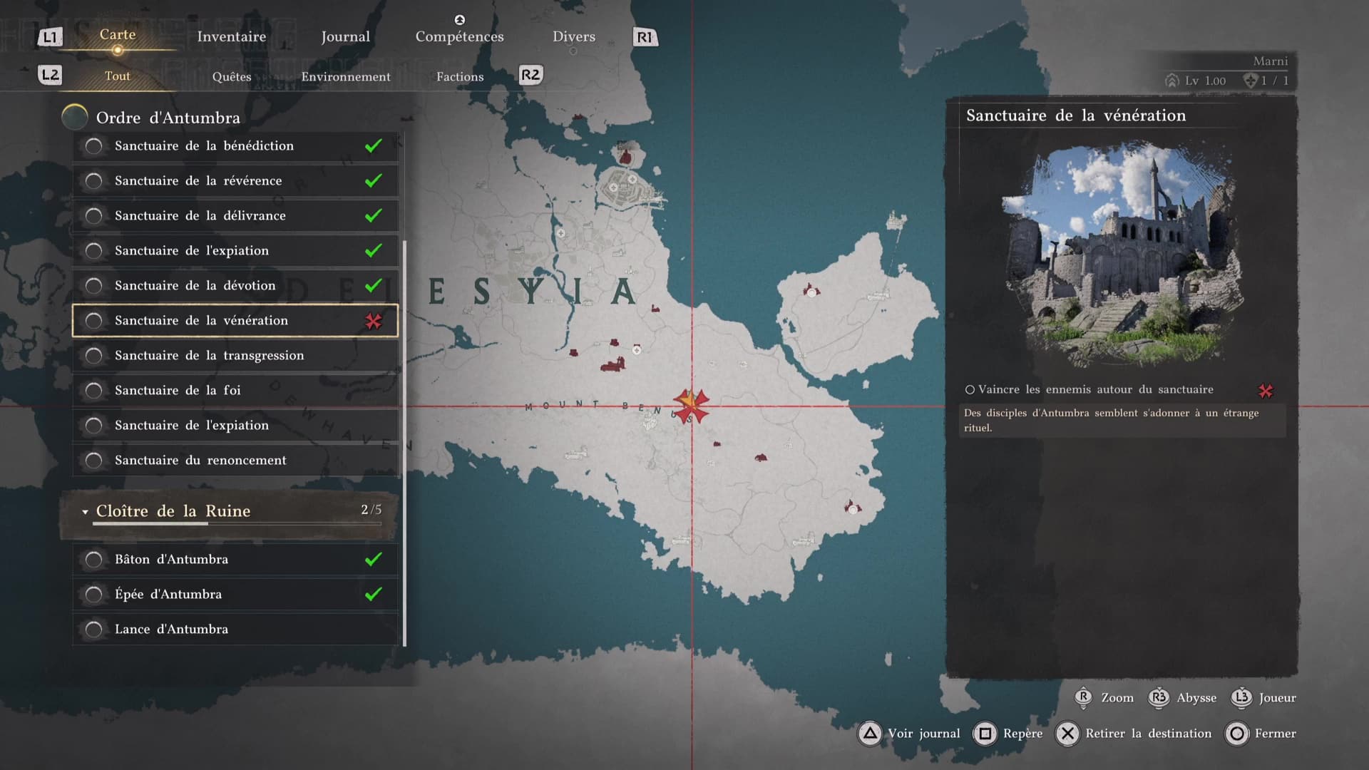 À l’image de tous ceux liés à Lysélia, le Sanctuaire de la vénération se trouve dans la région de Délésyie. Plus précisément, direction le sud-est, dans le secteur du Mont Bénus et tout près du Bosquet bleu (« Blue thicket » quand on regarde la map).