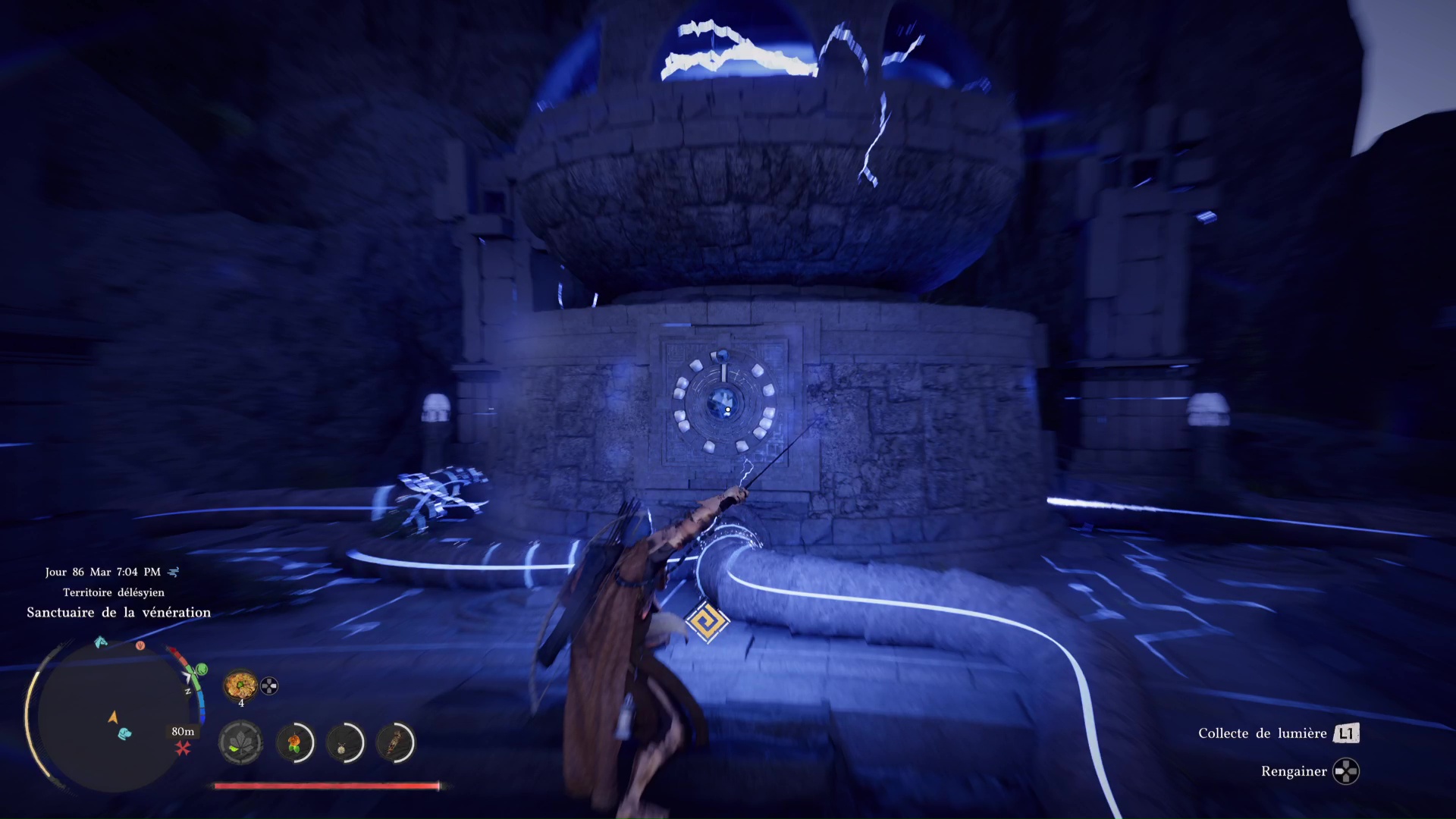 Avant de partir, récupérez l’effigie du réacteur. Pour ce faire, positionnez-vous devant la plaque du réacteur composé de plein de petits points disposés en cercle. Brandissez votre arme avec L1+R1/LB+RB et, tout en gardant R1/RB enfoncé, rappuyez et maintenez L1/LB pour activer la Collecte de lumière sur le gros point au centre.