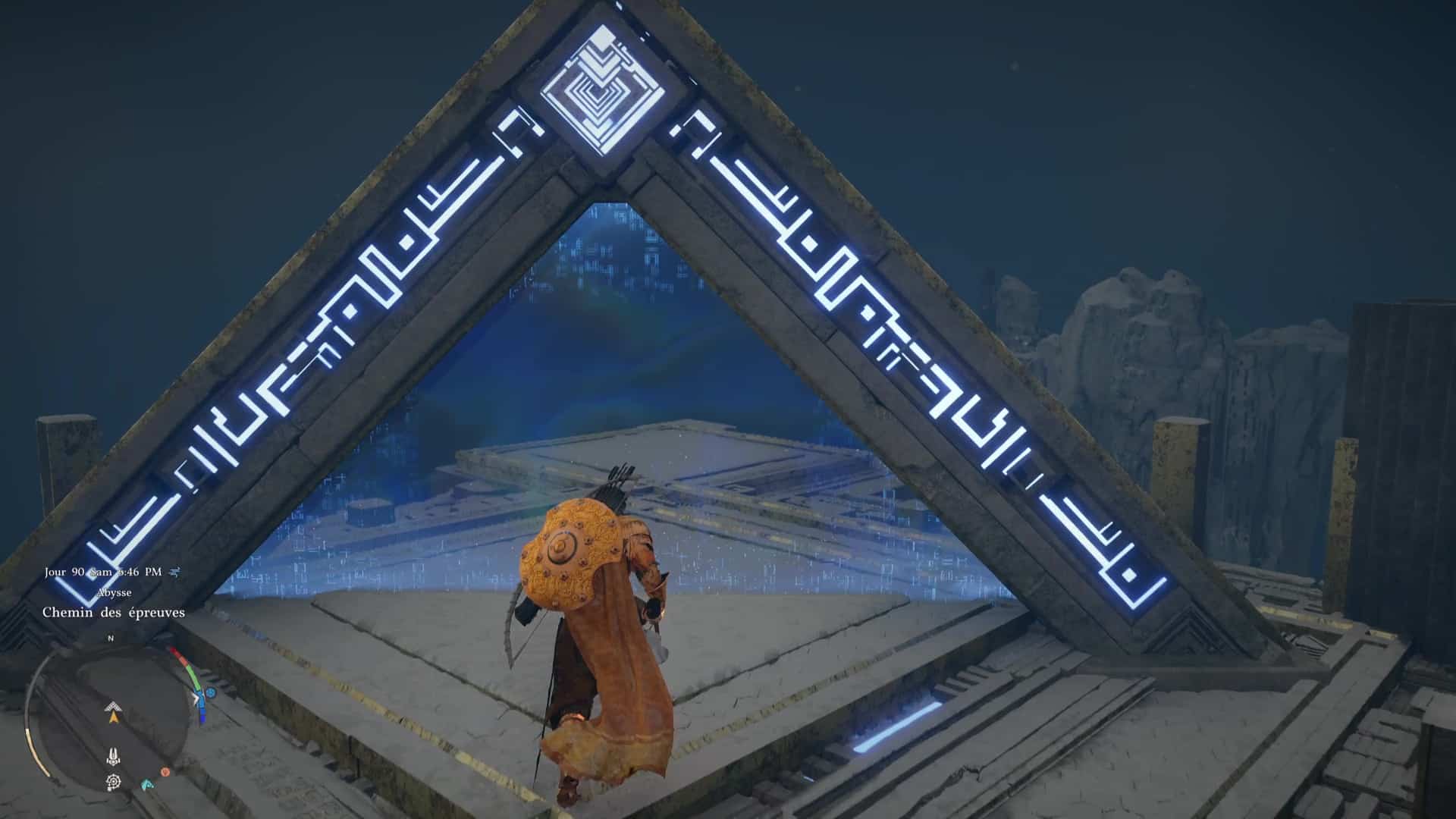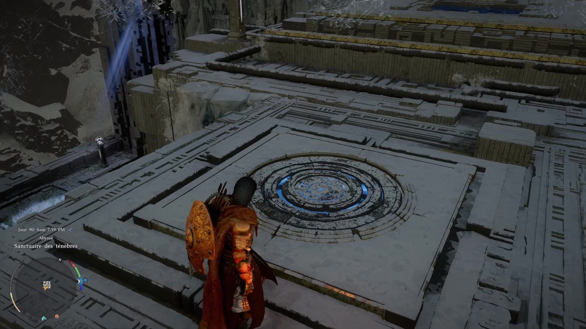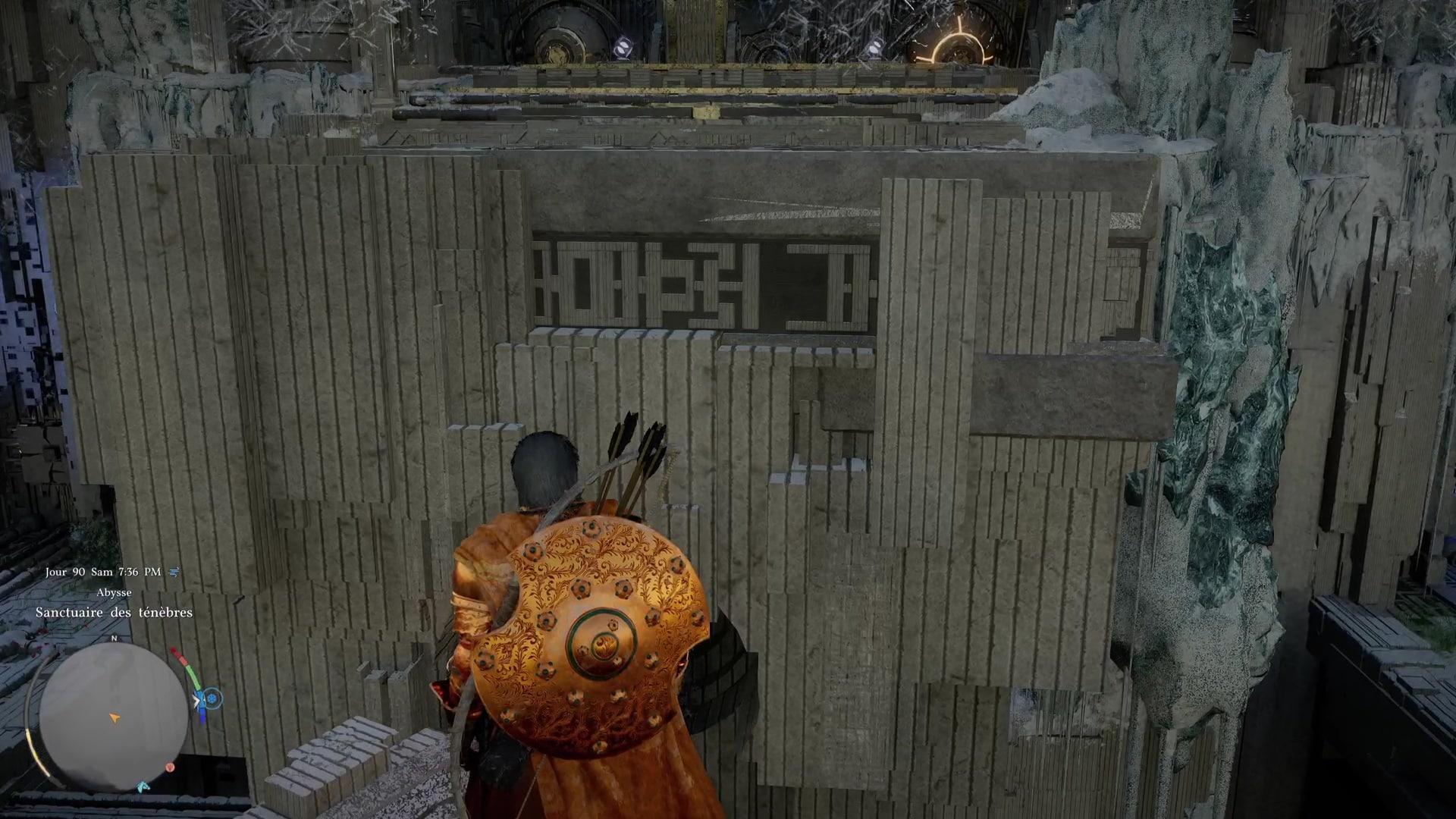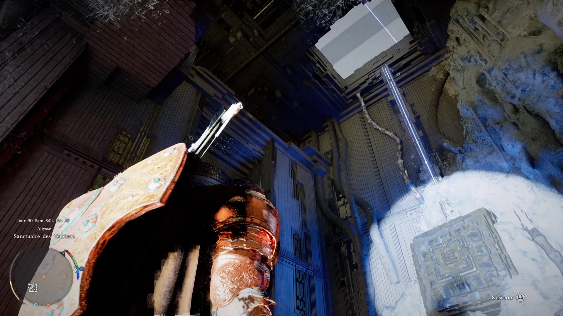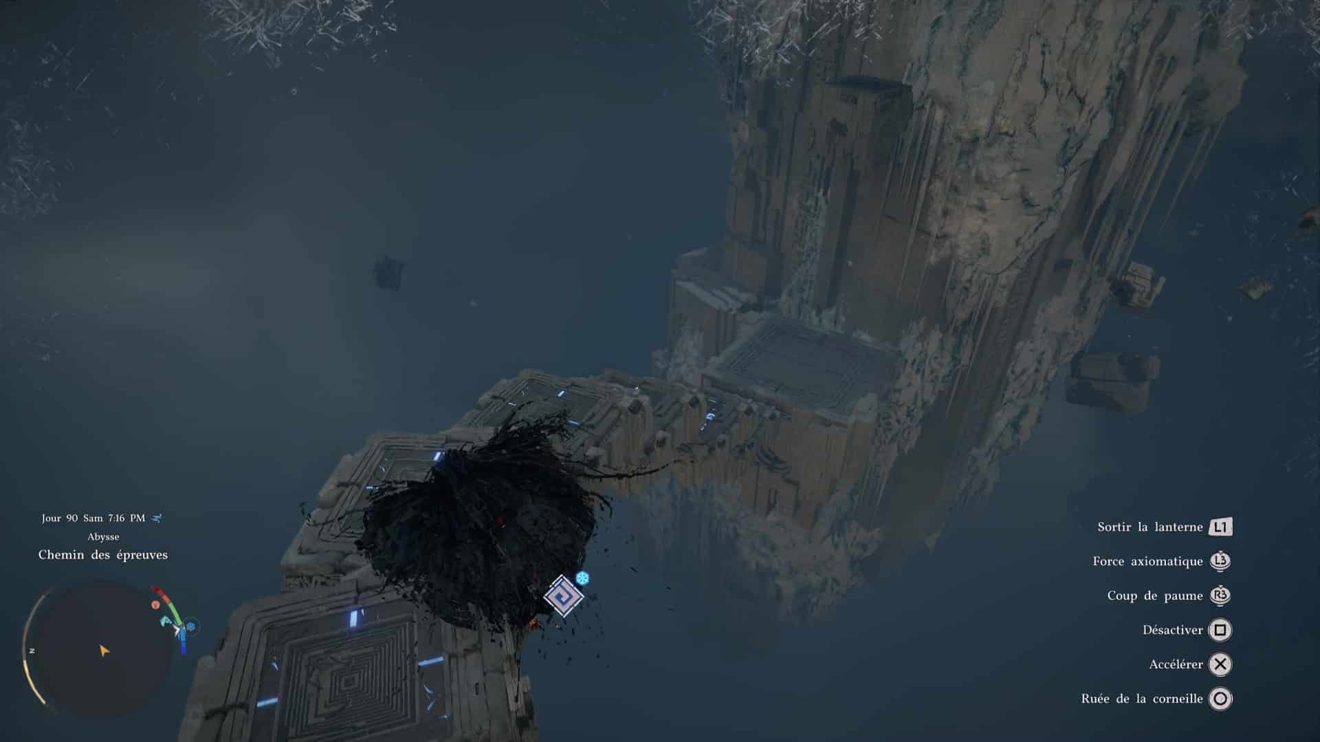 Une fois de l’autre côté, montez au centre du mécanisme et frappez-le avec un coup de paume. Le monolithe de fin de parcours désormais activé, montez au niveau supérieur en grimpant ou via un triple saut de paume, puis allez récupérer l’artefact abyssal auprès du monolithe.